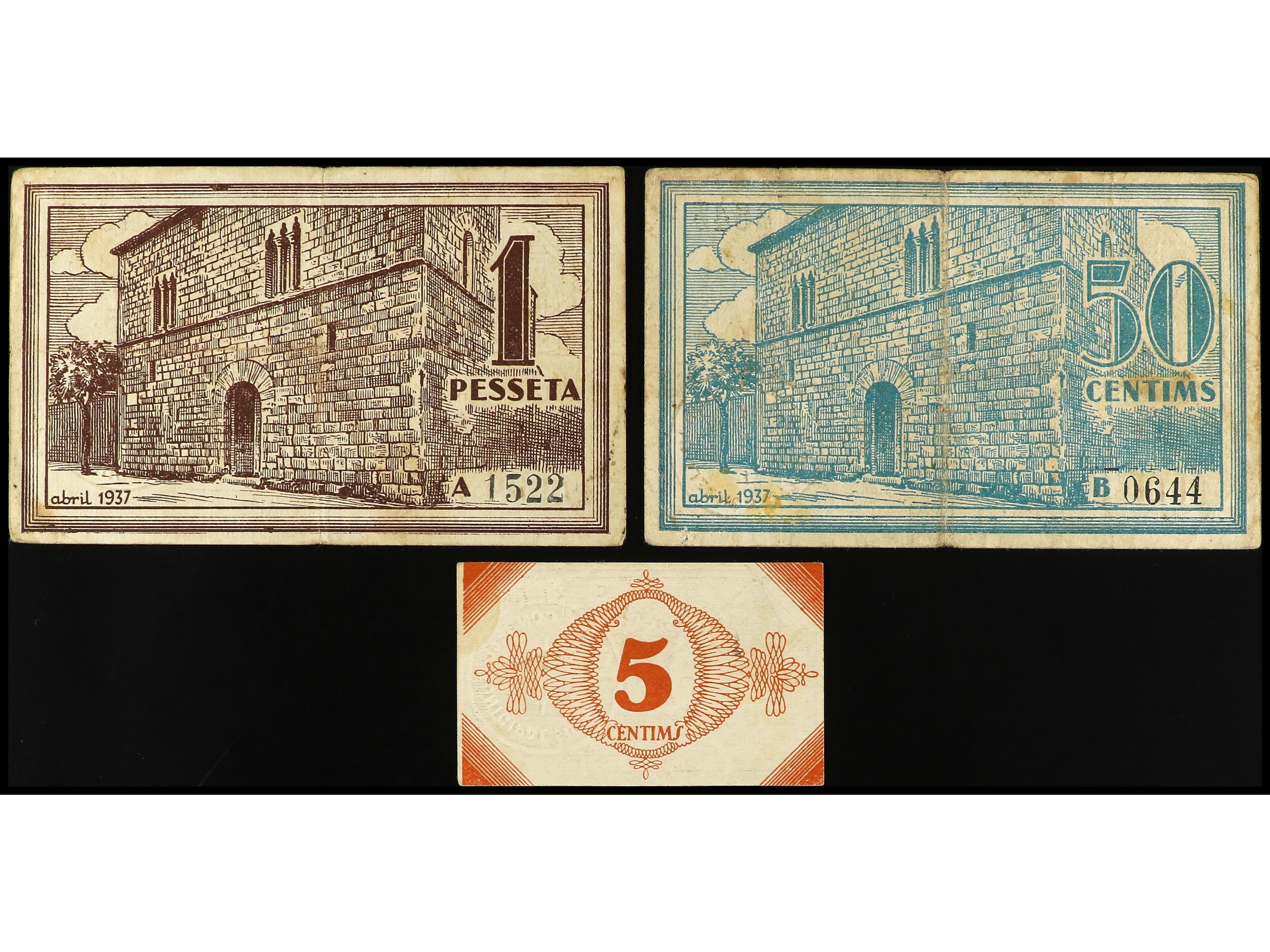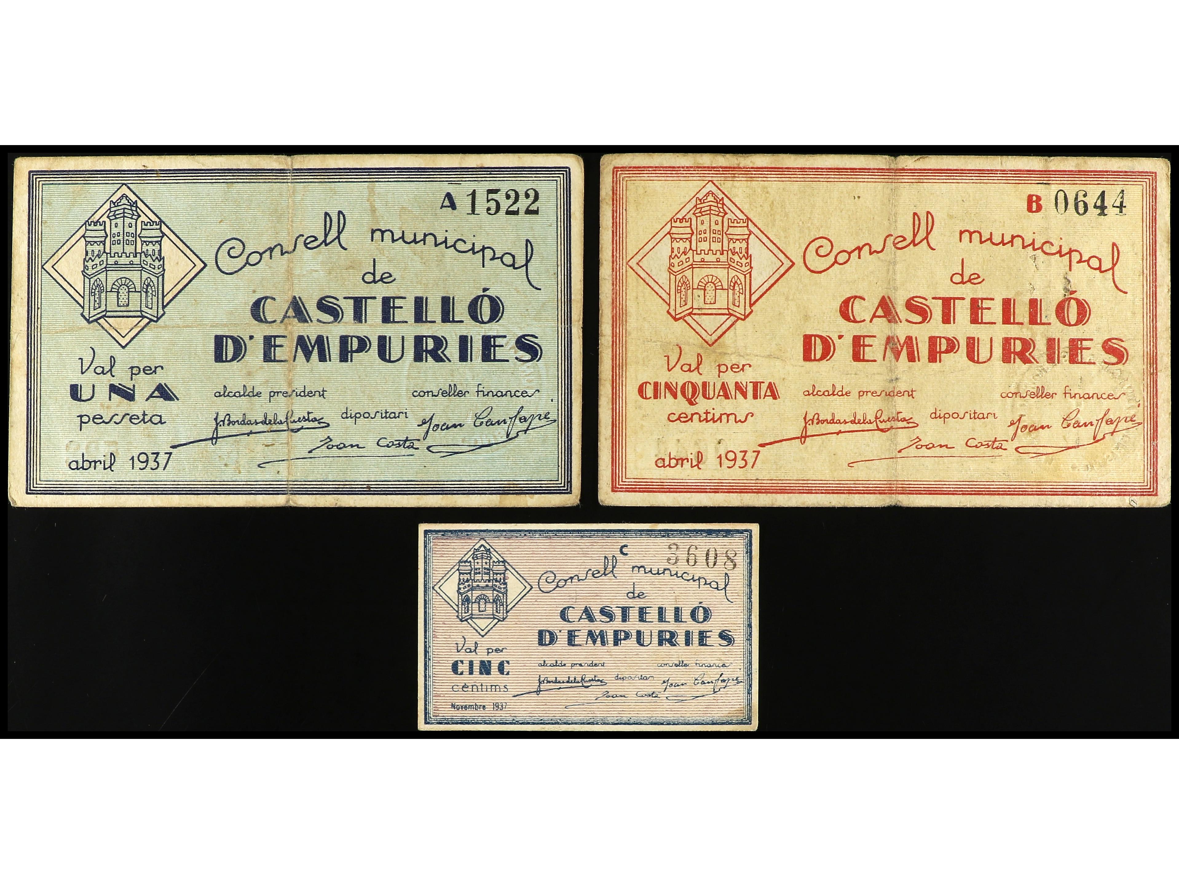 Lote 3 billetes 5, 50 Cèntims y 1 Pesseta. Abril y Novembre 1937. C.M. de CASTELLÓ D´EMPURIES. AT-745, 746, 747. MBC- a MBC+.