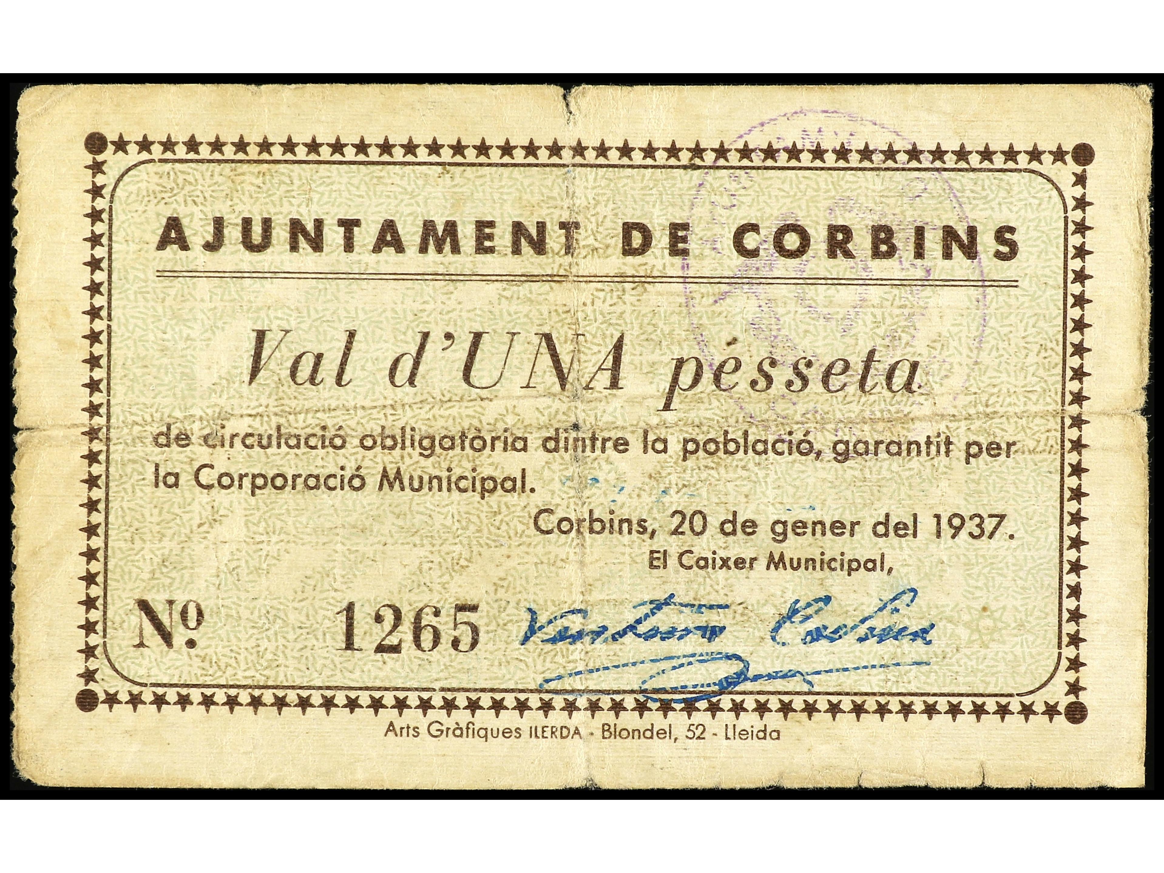 1 Pesseta. 20 Gener 1937. Aj. de CORBINS. (Pequeñas roturas). MUY RARO. AT-884. BC+. (Image1) (Image2)