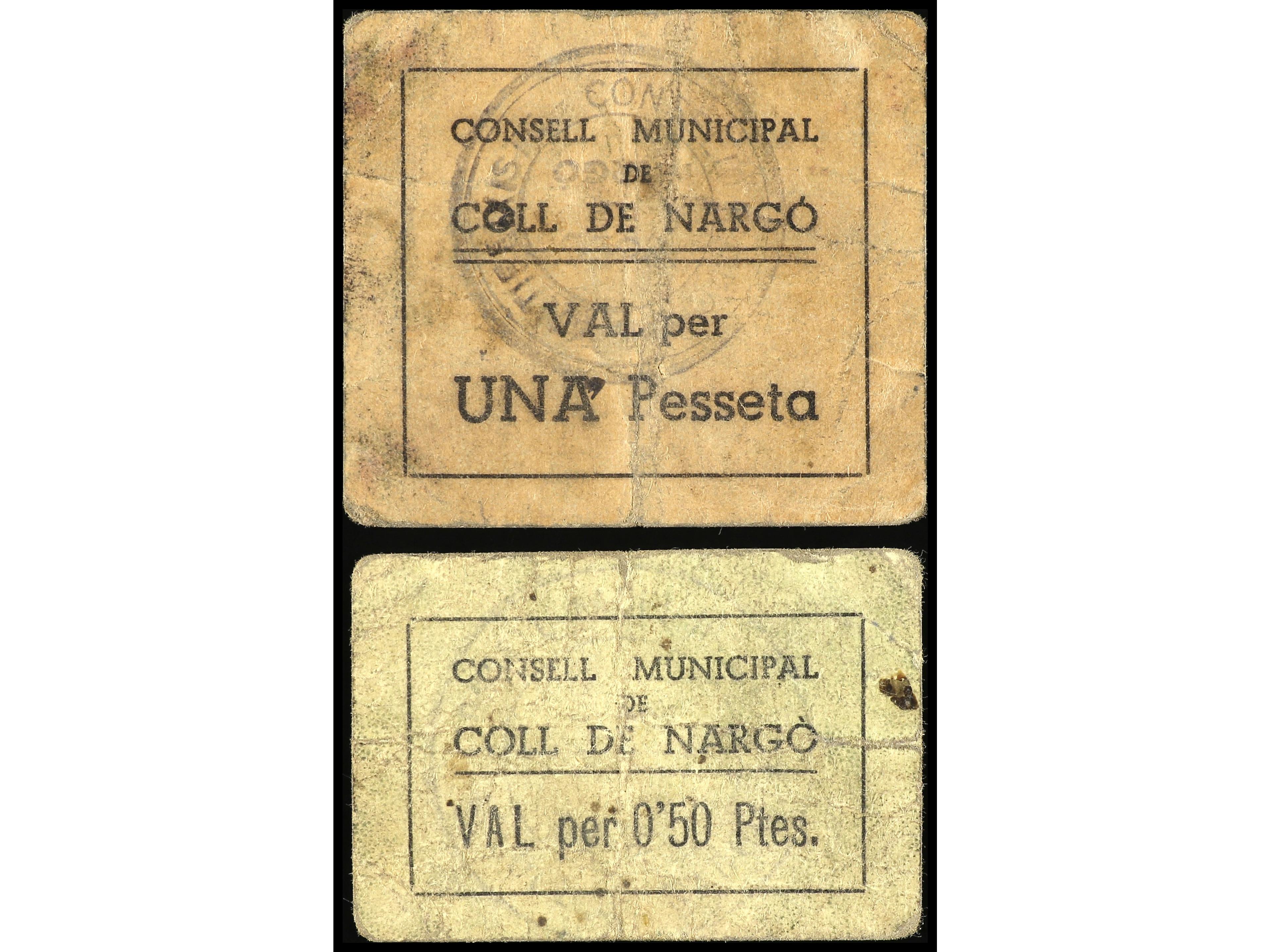 Lote 2 billetes 0, 50 y 1 Pesseta. C.M. de COLL DE NARGÓ. Cartón. MUY RAROS. AT-850, 851. BC+. (Image1) (Image2)