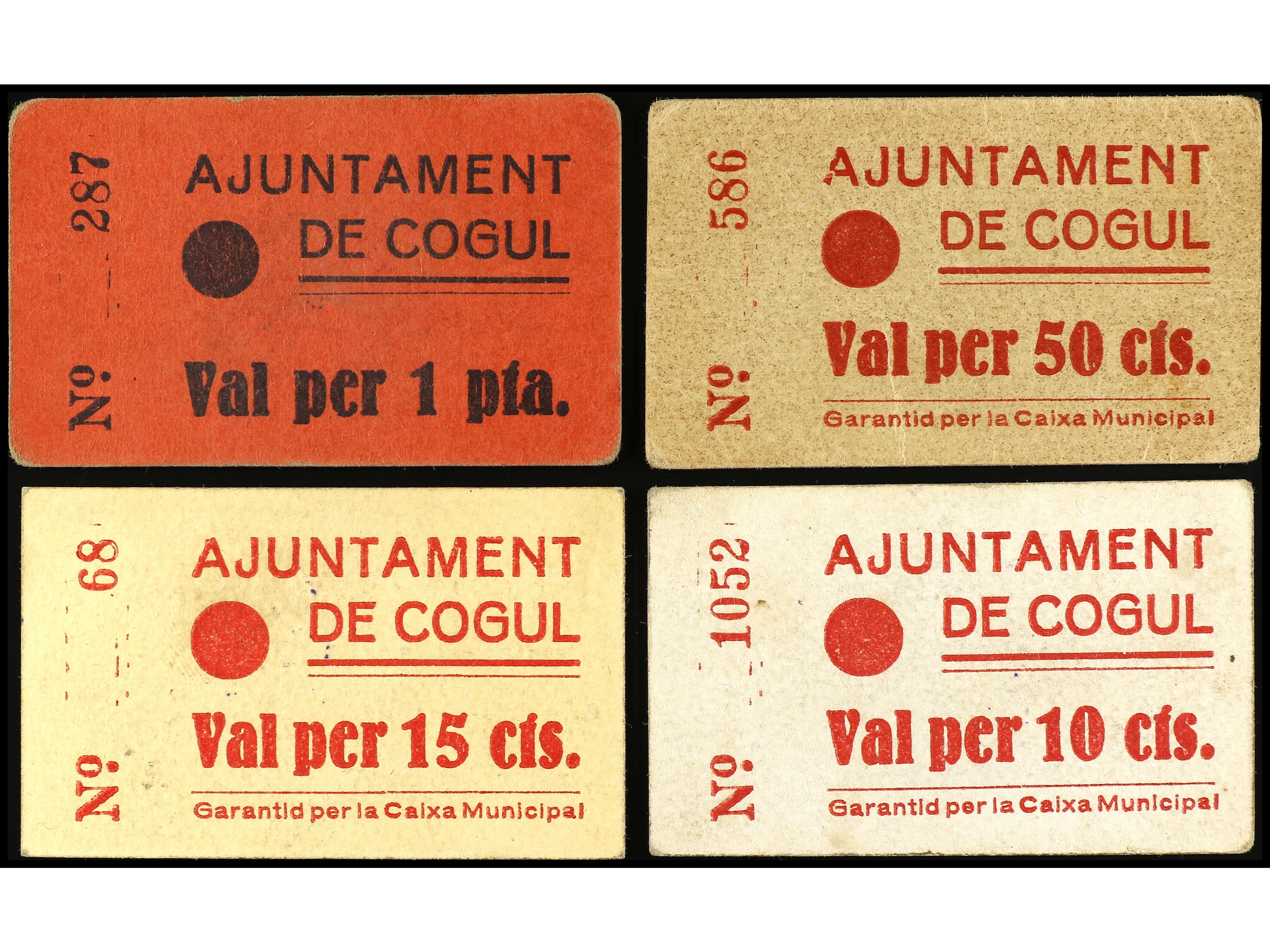 Lote 4 billetes 10, 15 y 50 Cèntims y 1 Pesseta. Aj. d´ EL COGUL. Cartón. RAROS. AT-845, 846, 848, 849. MBC+ a EBC. (Image1)