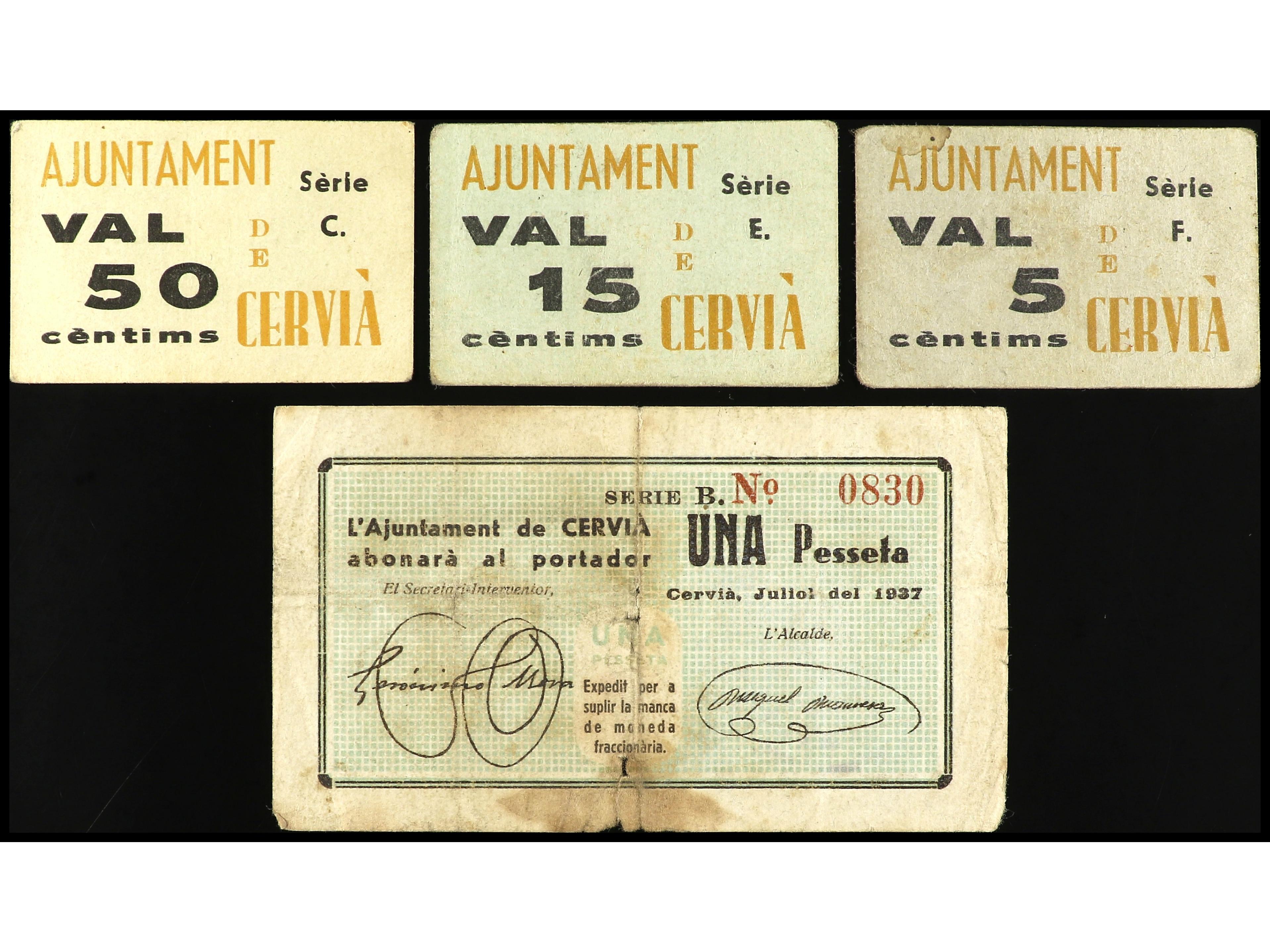 Lote 4 billetes 5, 15 y 50 Cèntims y 1 Pesseta. Aj. de CERVIÀ. (1 Pesseta roturas). MUY ESCASOS. AT-813, 814, 816, 817. BC a MBC+.