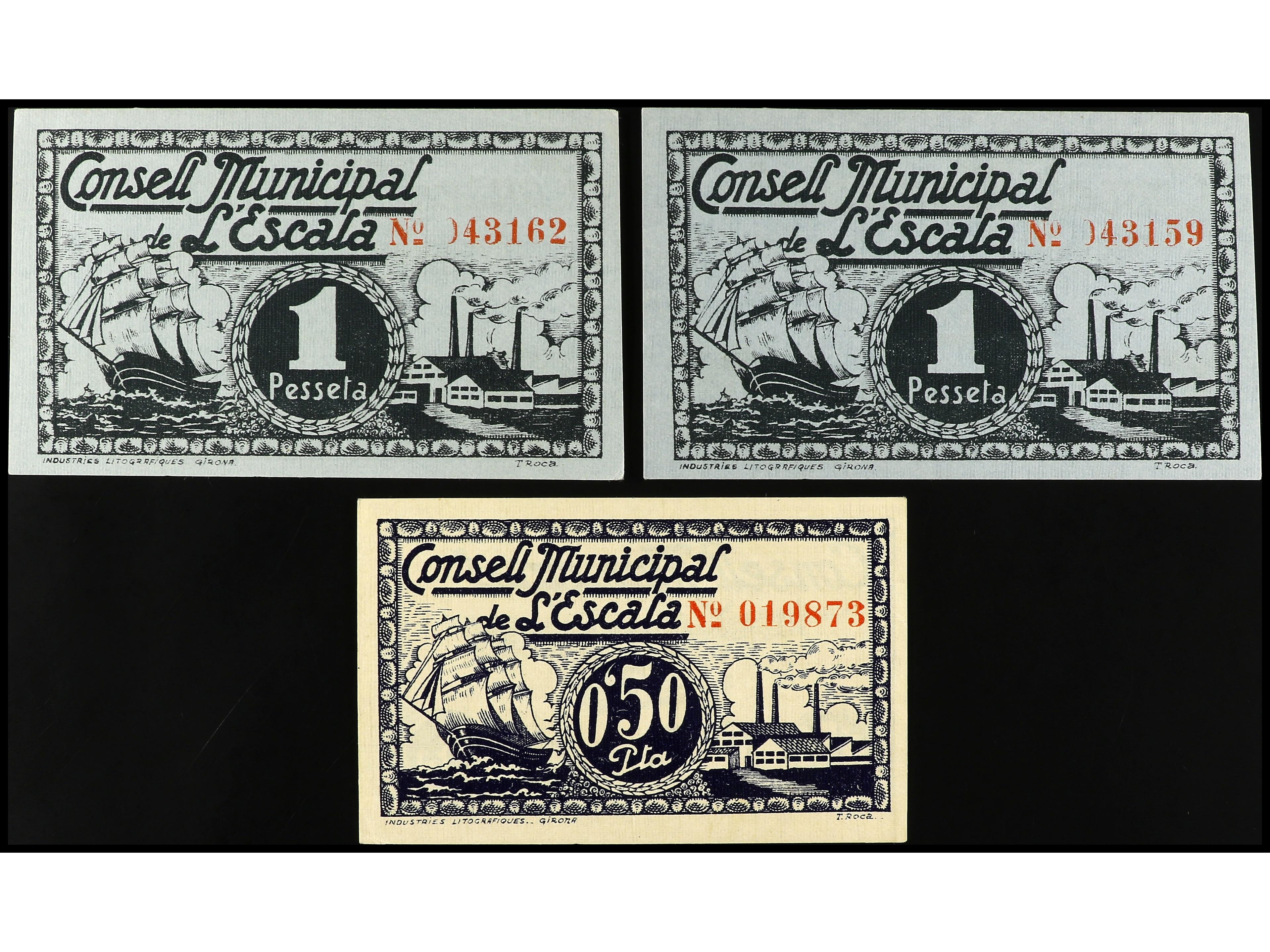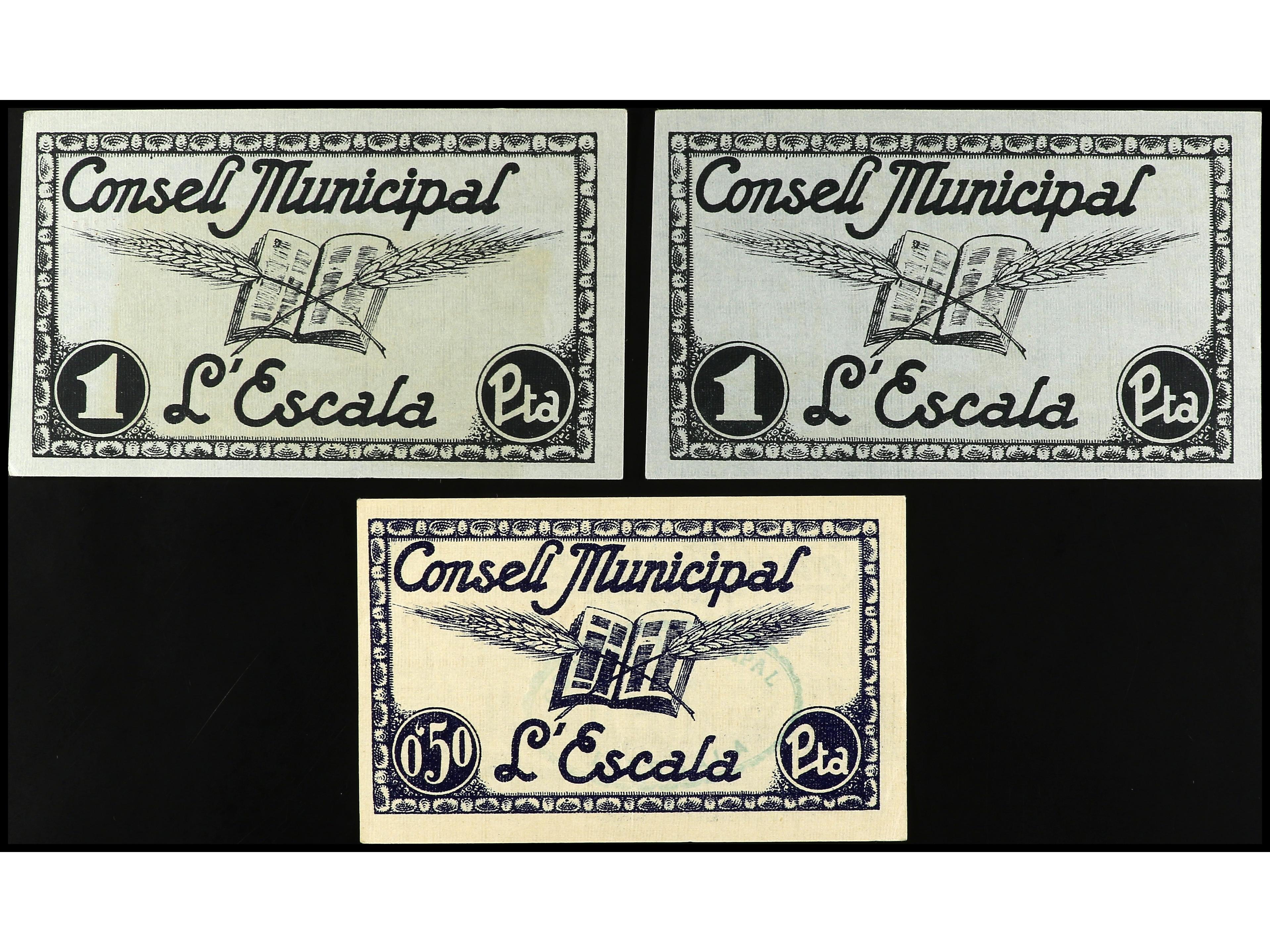Lote 3 billetes 0, 50 y 1 Pesseta (2). C.M. de L´ ESCALA. AT-930c, 931b. EBC- a EBC+. (Image1) (Image2)
