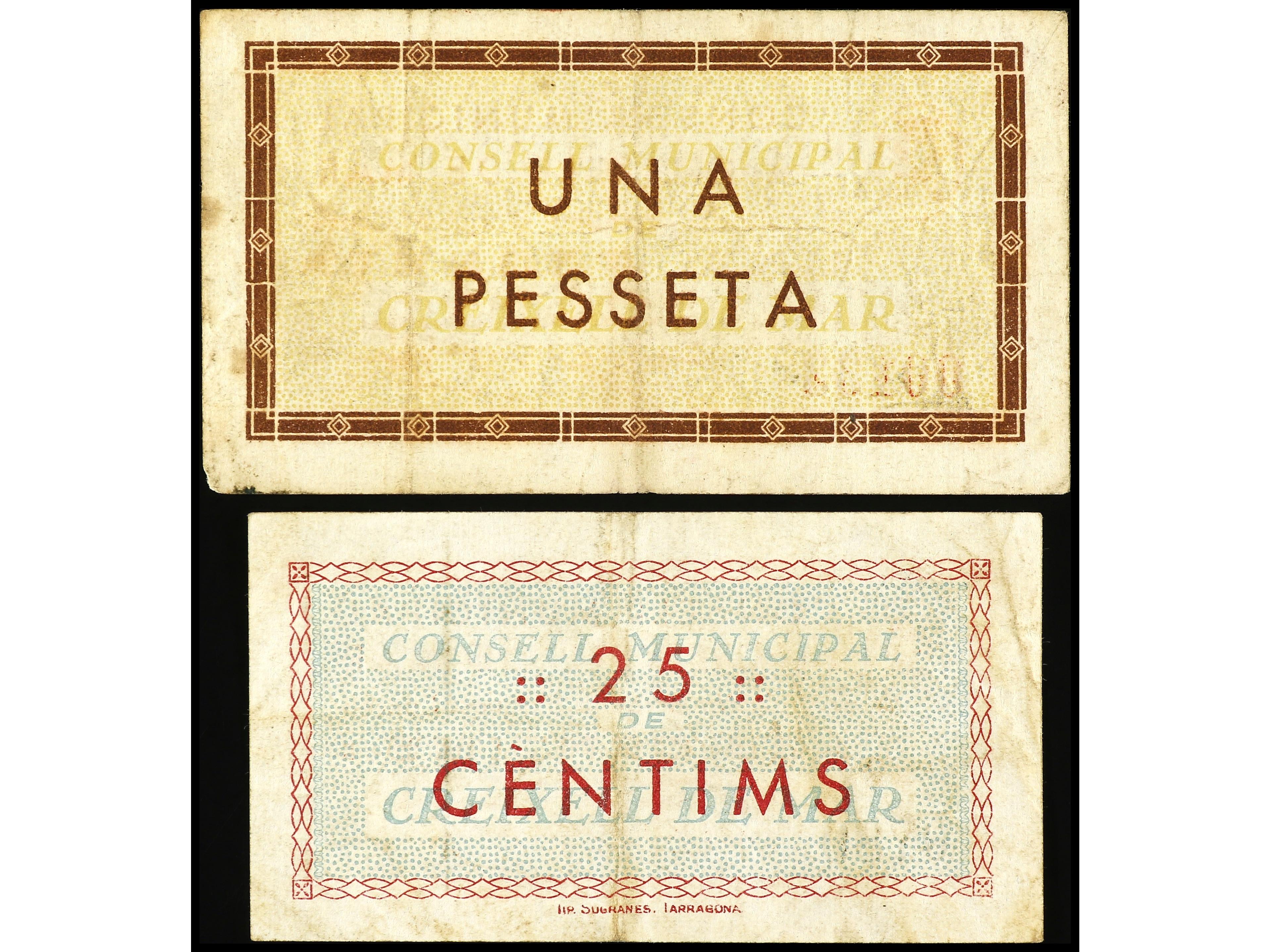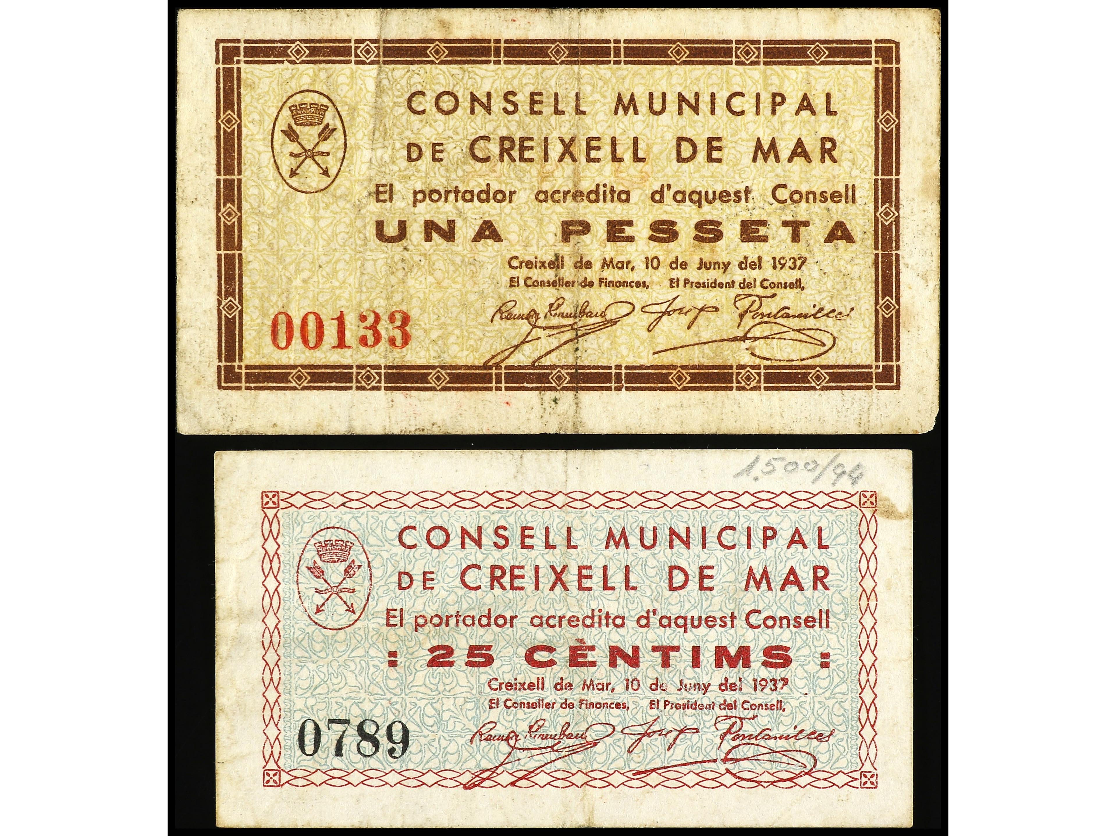 Lote 2 billetes 25 Céntims y 1 Pesseta. 10 Juny 1937. C.M. de CREIXELL DE MAR. (Roturas y sucios). AT-900, 902. MBC-.