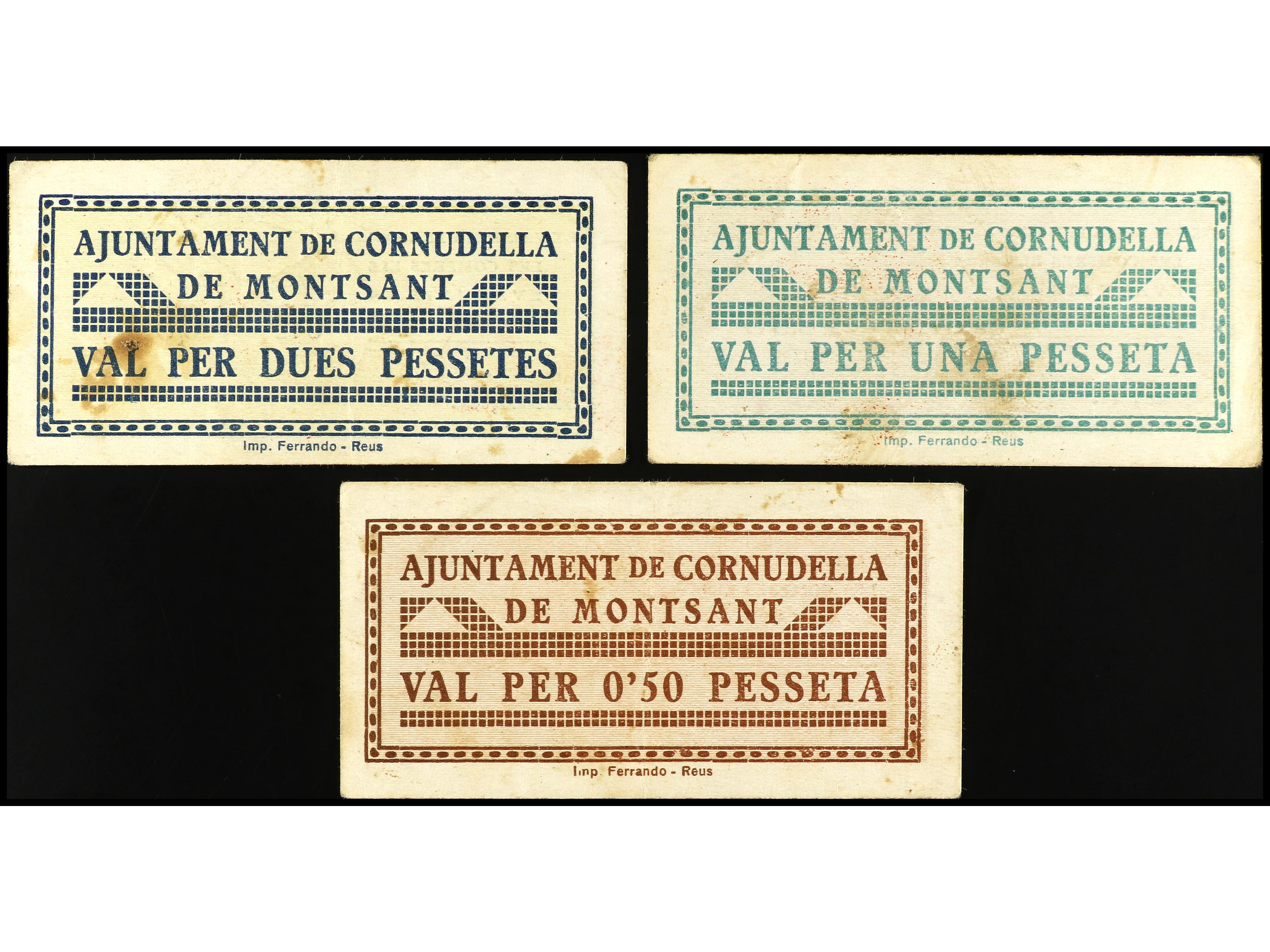 Lote 3 billetes 50 Cèntims, 1 y 2 Pessetes. Aj. de CORNUDELLA DE MONTSANT. ESCASOS. AT-892/94. MBC. (Image1) (Image2)