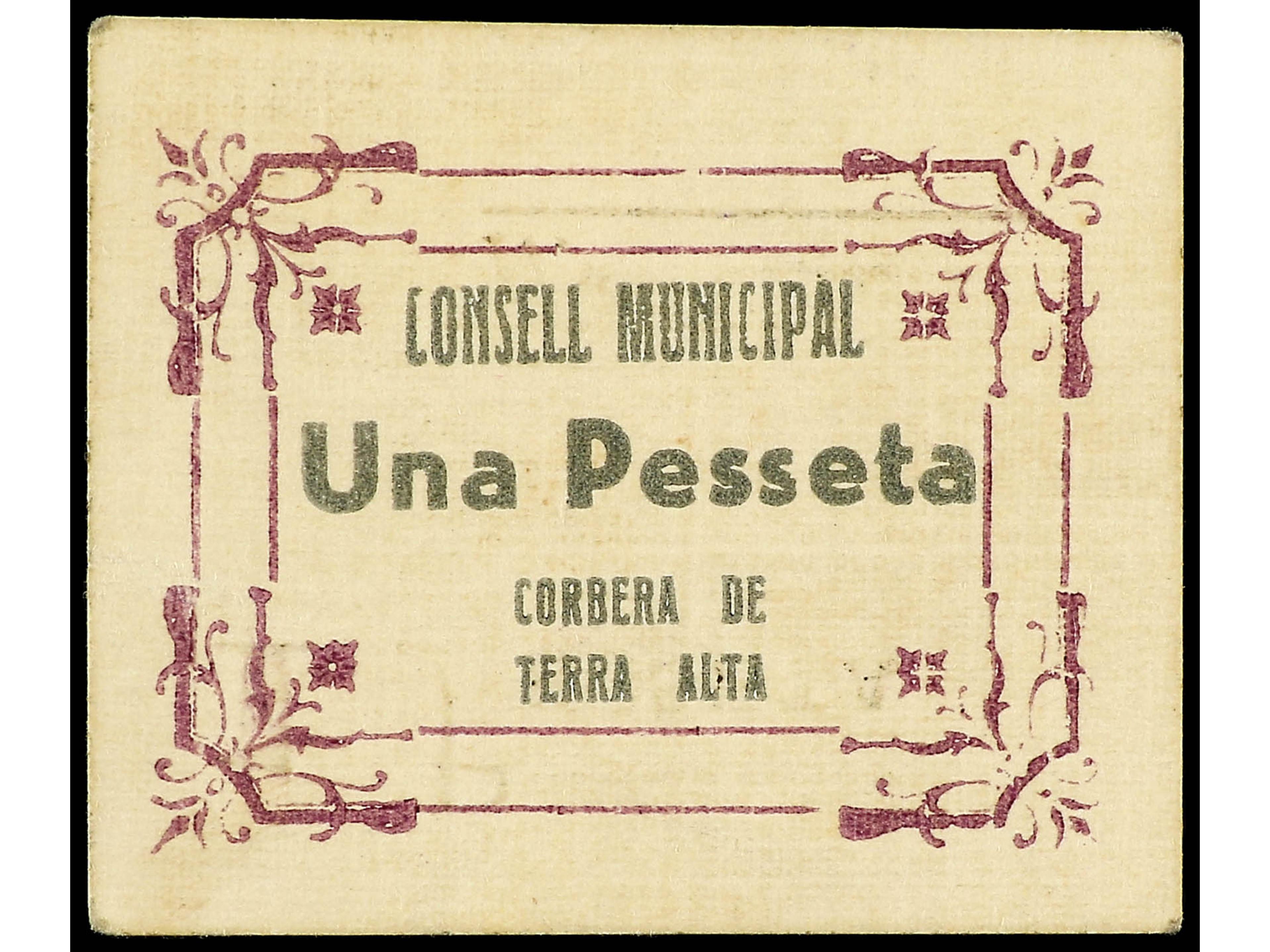 1 Pesseta. C.M. de CORBERA DE TERRA ALTA. Cartón. Reverso invertido. MUY RARO. AT-881a; RGH-7671. EBC+. (Image1) (Image2)