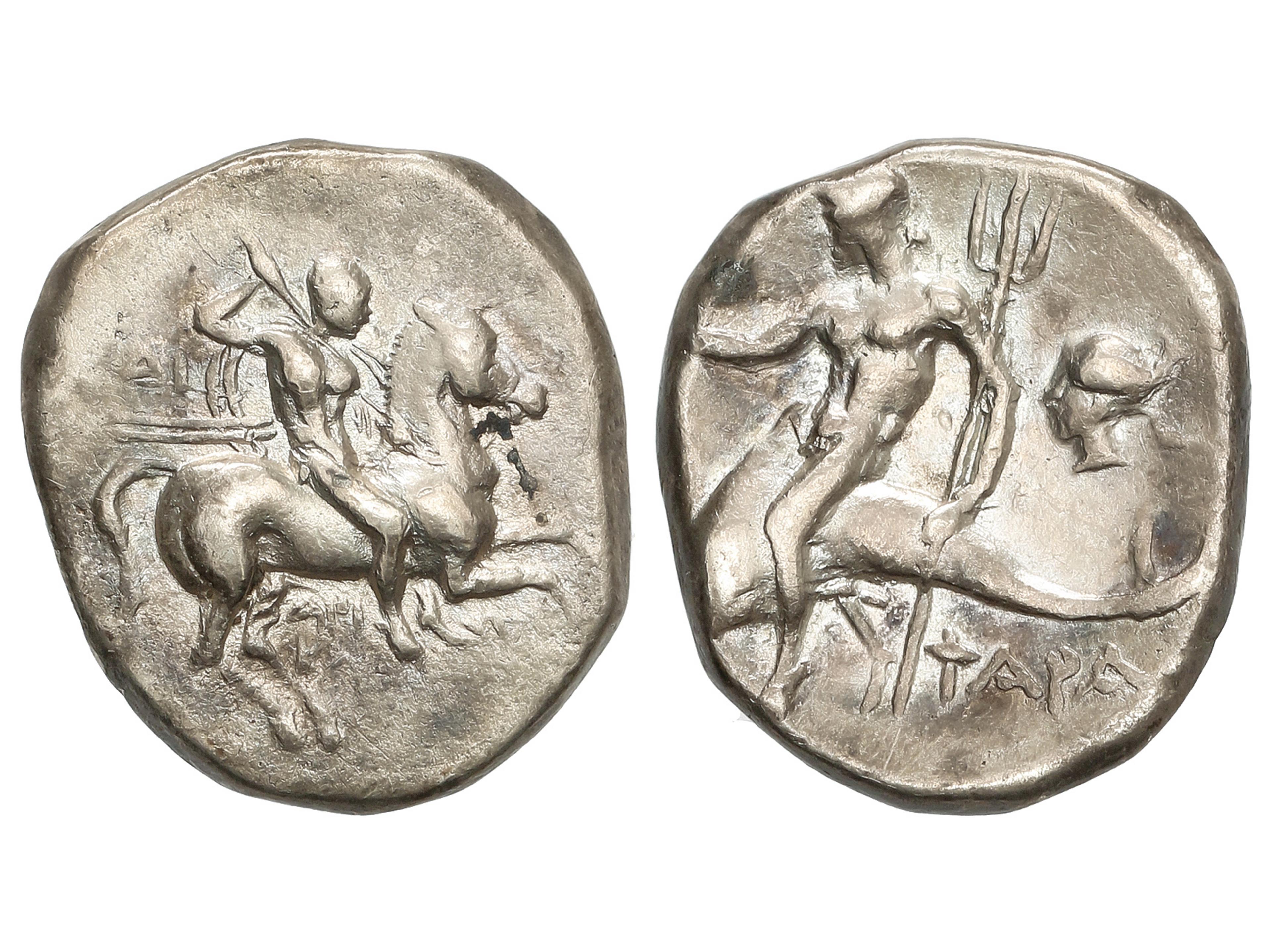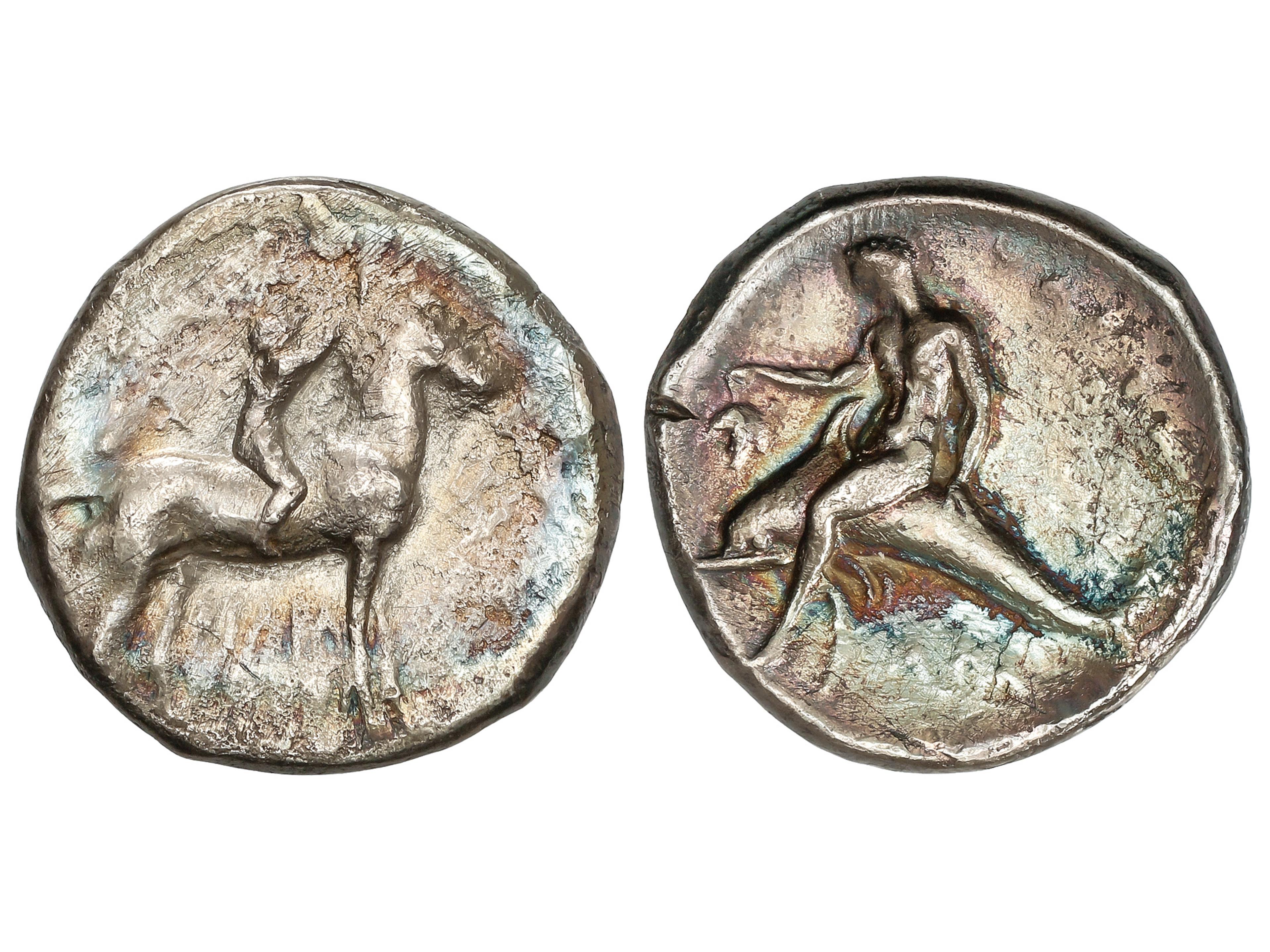 6 imageDidracma. 272-235 a.C. TARENTO. CALABRIA. Anv.: Jinete al galope hacia la derecha, lanzando hacia abajo una jabalina que empuña con la mano derecha y sosteniendo un escudo con la izquierda. Rev.: Taras, a lomos de un delfín que se dirige hacia la izquierda, sostiene un tridente con la mano derecha y una clámide con la izquierda; en la parte superior, la Victoria alada volando hacia la derecha, y debajo, un timón. 6,48 grs. AR. Vlasto-899. MBC+. (Image1)