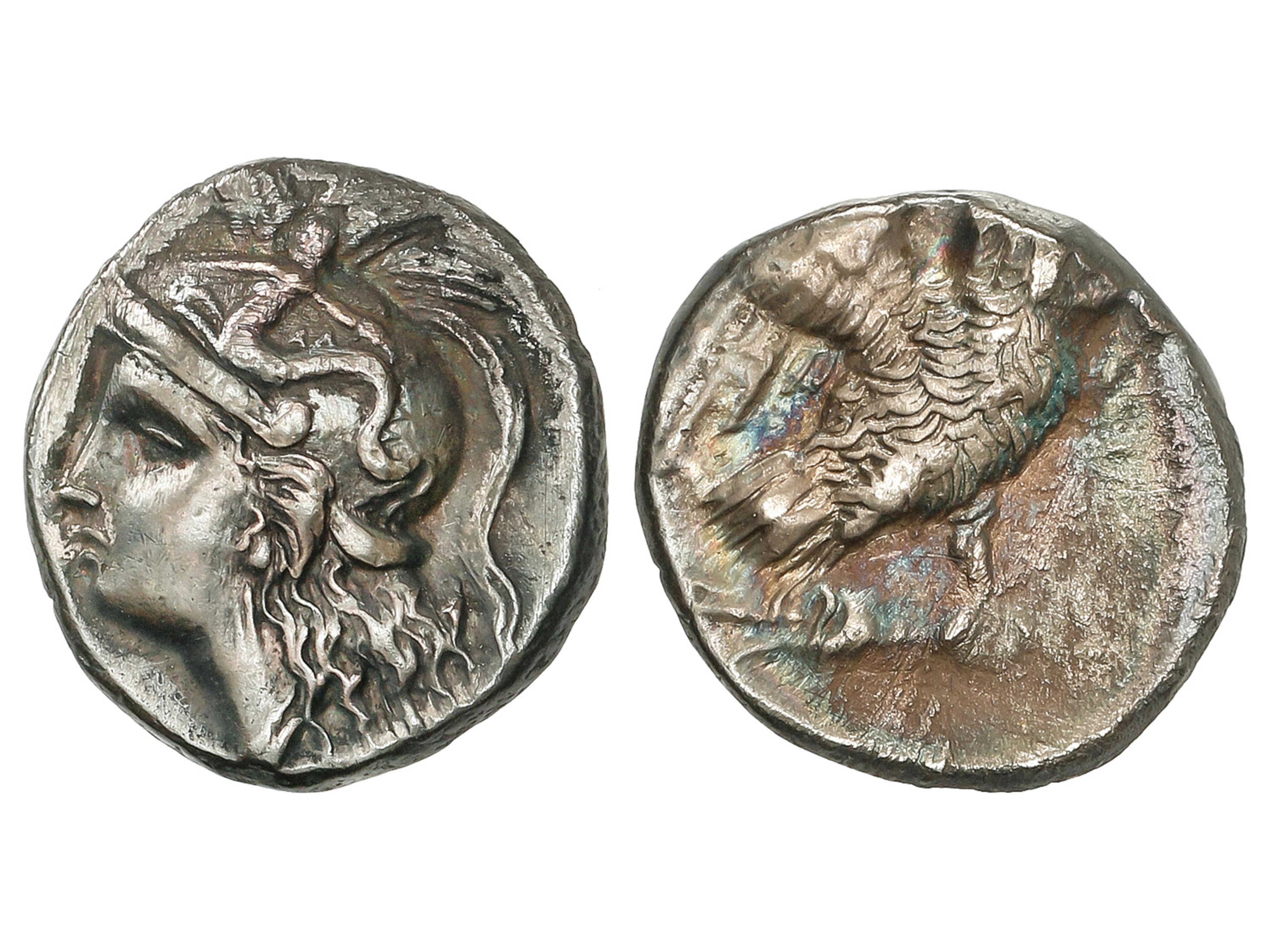 1 imageDracma. 281-272 a.C. TARENTO. CALABRIA. Anv.: Cabeza de Athena con Skylla. Rev.: Búho con alas abiertas encima de rayos. 3,14 grs. AR. Pátina de colección antigua. ESCASA. Se-373; Vlasto-1080. MBC. (Image1)