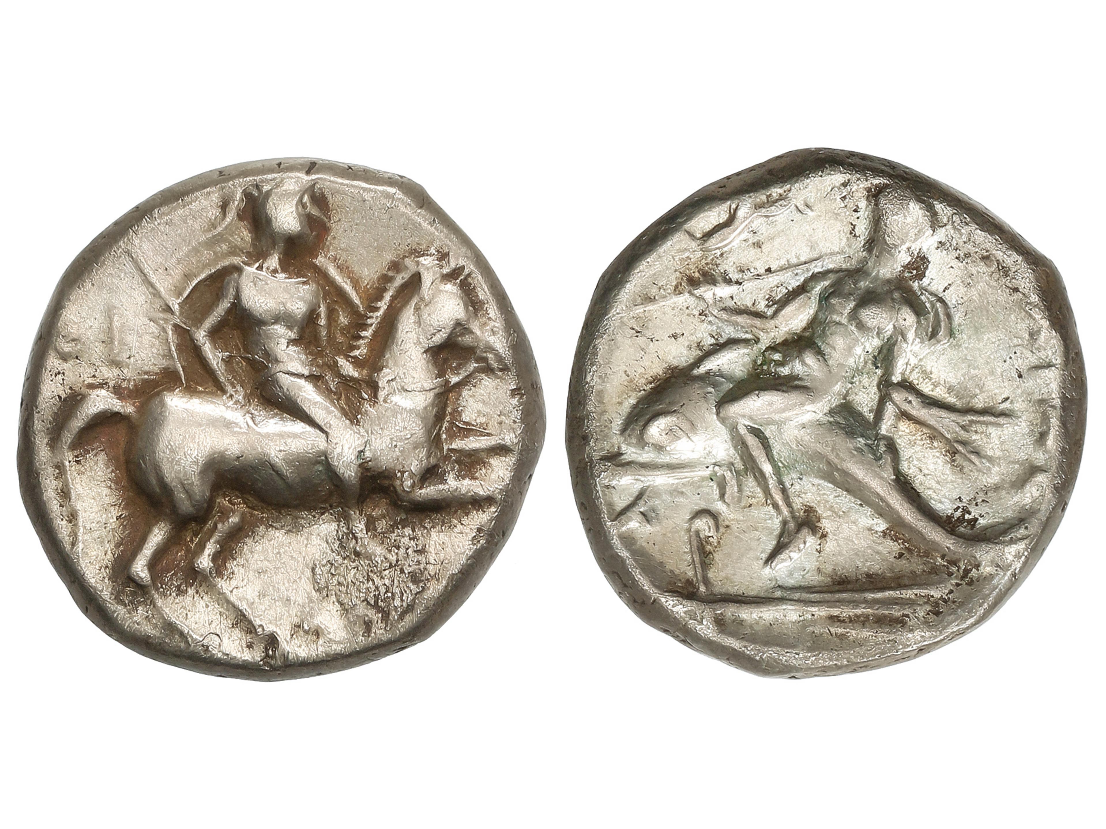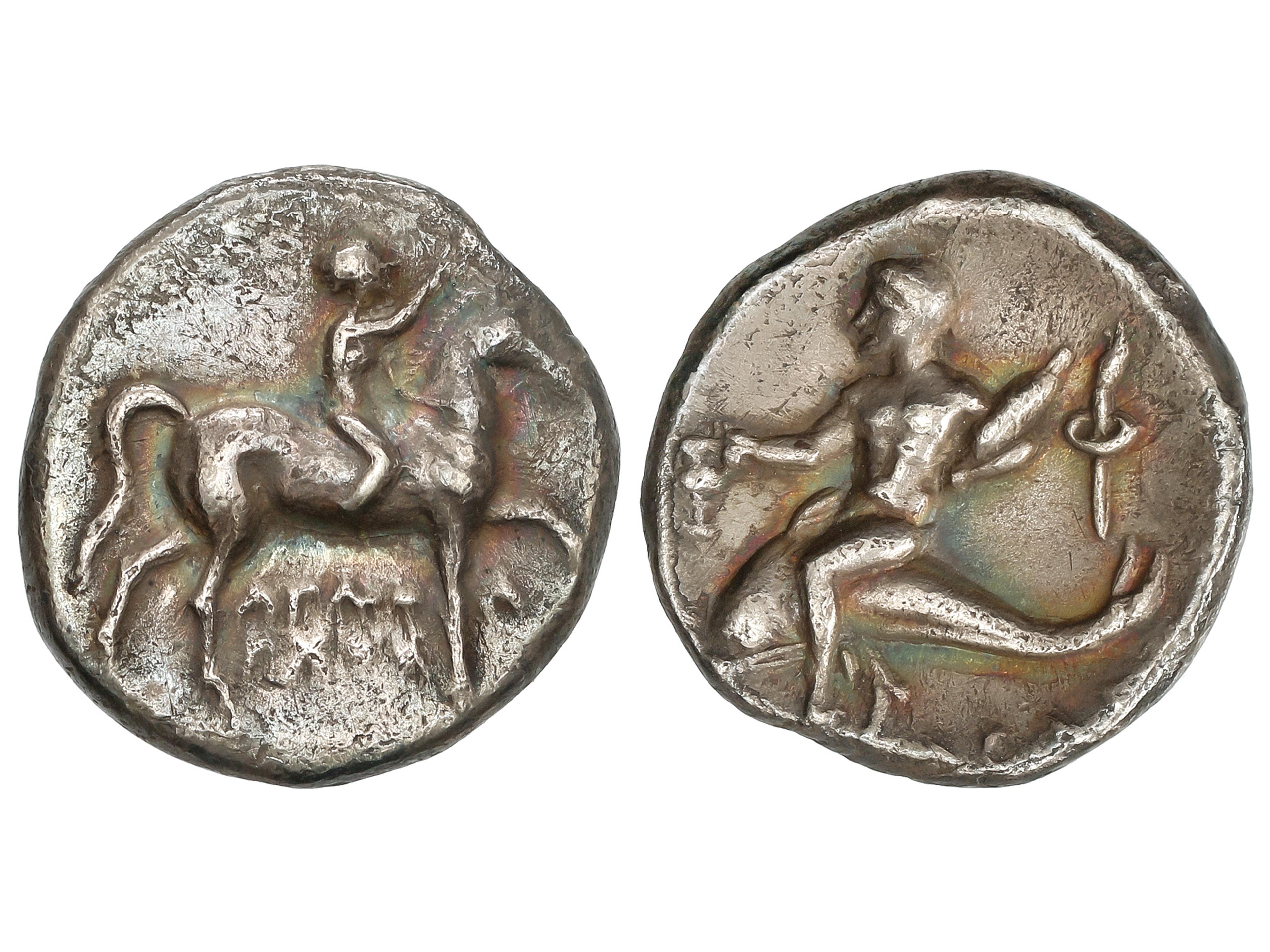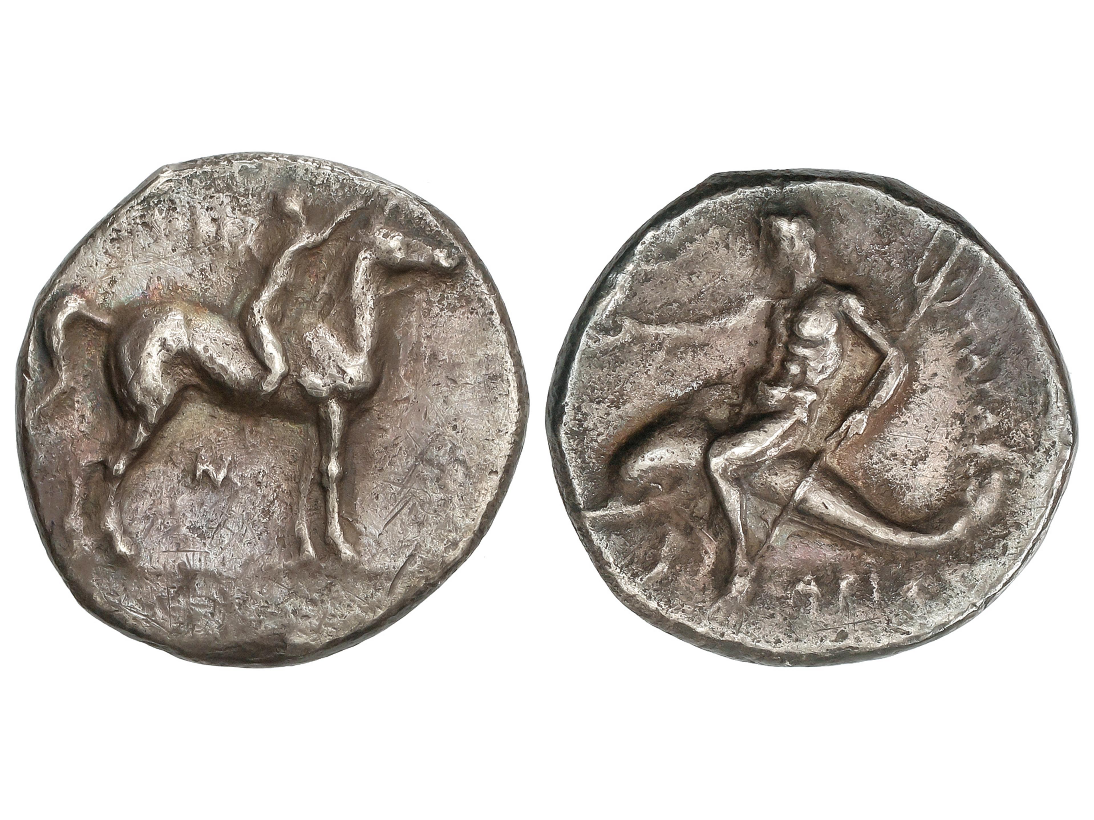 5 imageDidracma. 272-235 a.C. TARENTO. CALABRIA. Anv.: Jinete al galope hacia la derecha, lanzando hacia abajo una jabalina que empuña con la mano derecha, mientras sostiene dos lanzas y un escudo con la izquierda. Rev.: Taras, a lomos del delfín en dirección a la izquierda, sostiene un kantharos con la mano derecha y un tridente con la izquierda; en el fondo, a la derecha, una cabeza de ninfa. 6,31 grs. AR. Vlasto-878. MBC+. (Image1)