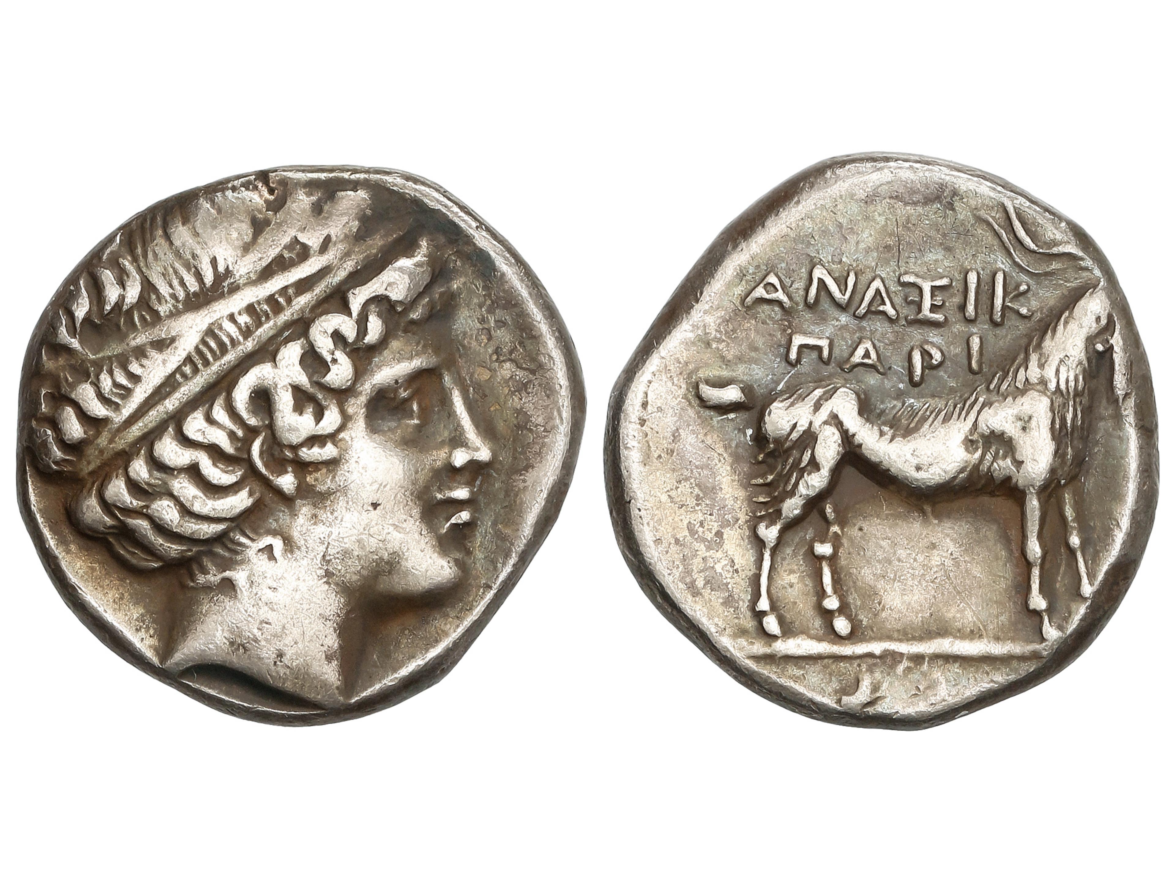 15 imageDidracma. 200-180 a.C. PAROS. CÍCLADAS. Anv.: Cabeza de la ninfa Kore a derecha. Rev.: Cabra a derecha, encima leyenda. 7,72 grs. AR. RARA. SNG Cop-772. MBC. (Image1)