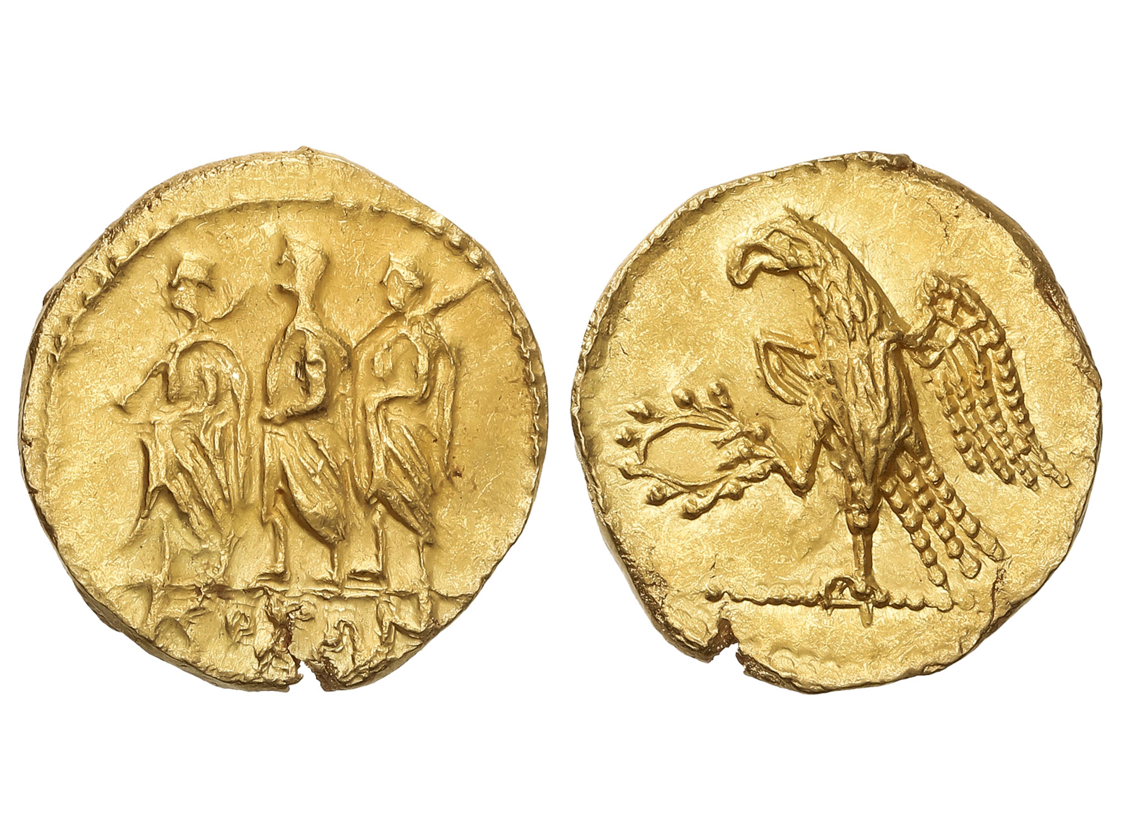 9 imageEstátera. Siglo I a.C. KOSÓN. TRACIA. Anv.: Tres figuras togadas a izquierda, la primera y la última llevan líctor. Rev.: Águila en pie a izquierda sobre cetro, llevando corona en la garra y con alas abiertas. 8,41 grs. AU. (Leve grieta a las 6h). Restos de brillo original. HGC 3.2-2049; Se-1733. EBC-/EBC. (Image1)