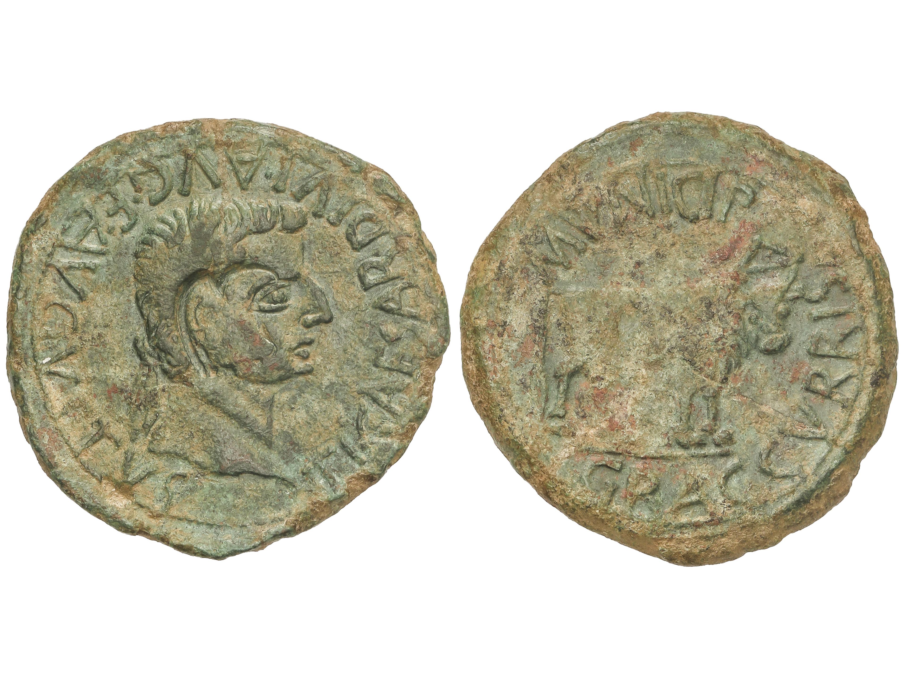 19 imageAs. ÉPOCA DE TIBERIO. MVNICIPIVM GRACURRIS (ALFARO, La Rioja). Anv.: TI. CAESAR DIVI AVG. F. AVGVSTVS. Cabeza laureada de Tiberio a derecha. Rev.: MVNICIP. GRACCVRRIS. Toro mitrado a derecha. 13,72 grs. AE. Pátina verde. AB-1391. MBC+. (Image1)