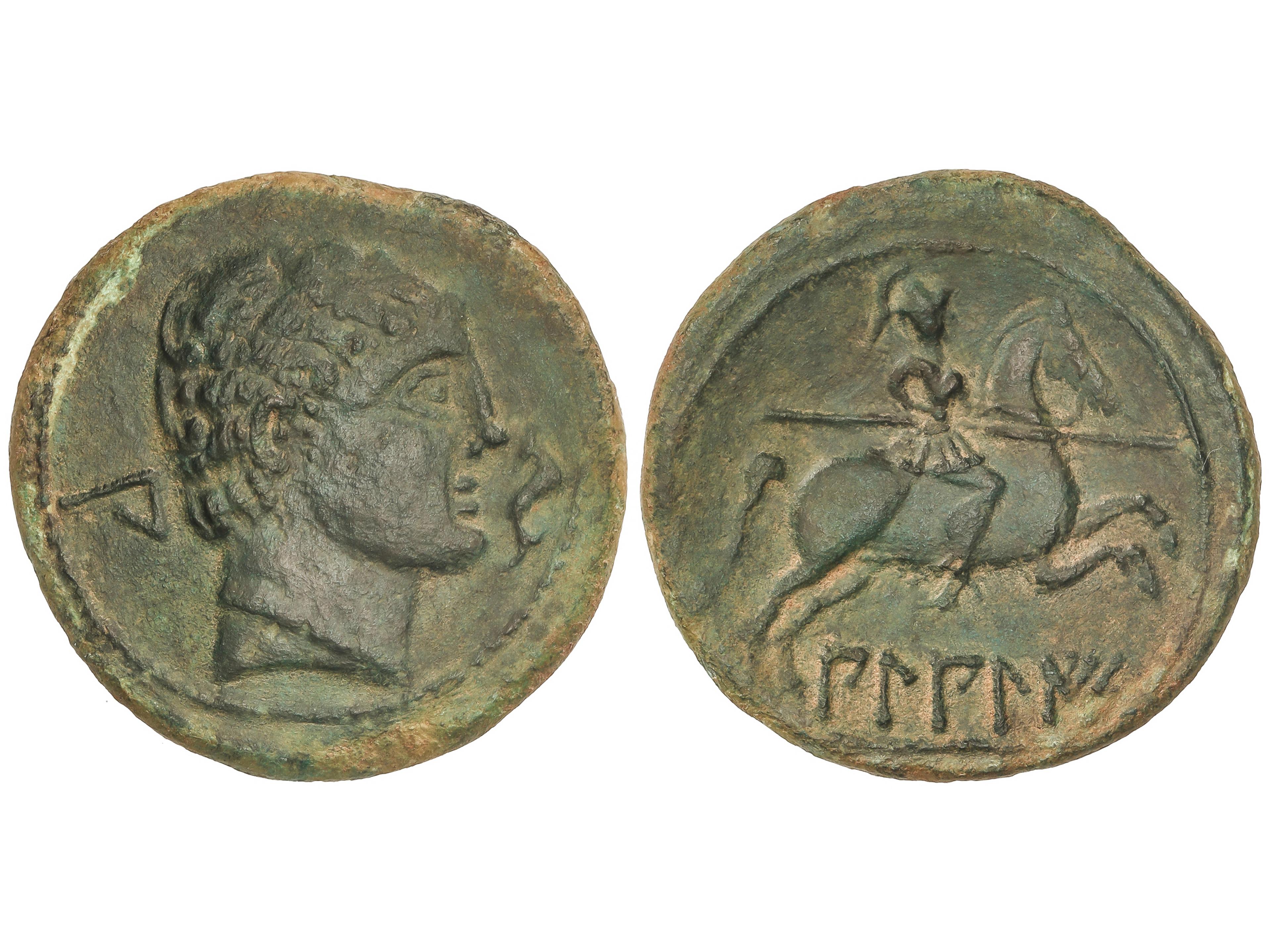 17 imageAs. 120-30 a.C. BILBILIS (CALATAYUD, Zaragoza). Anv.: Cabeza masculina a derecha, delante delfín, detrás letra ibérica Bi. Rev.: Jinete con lanza a derecha, debajo leyenda ibérica. 14,56 grs. AE. AB-258; ACIP-1574. MBC+. (Image1)