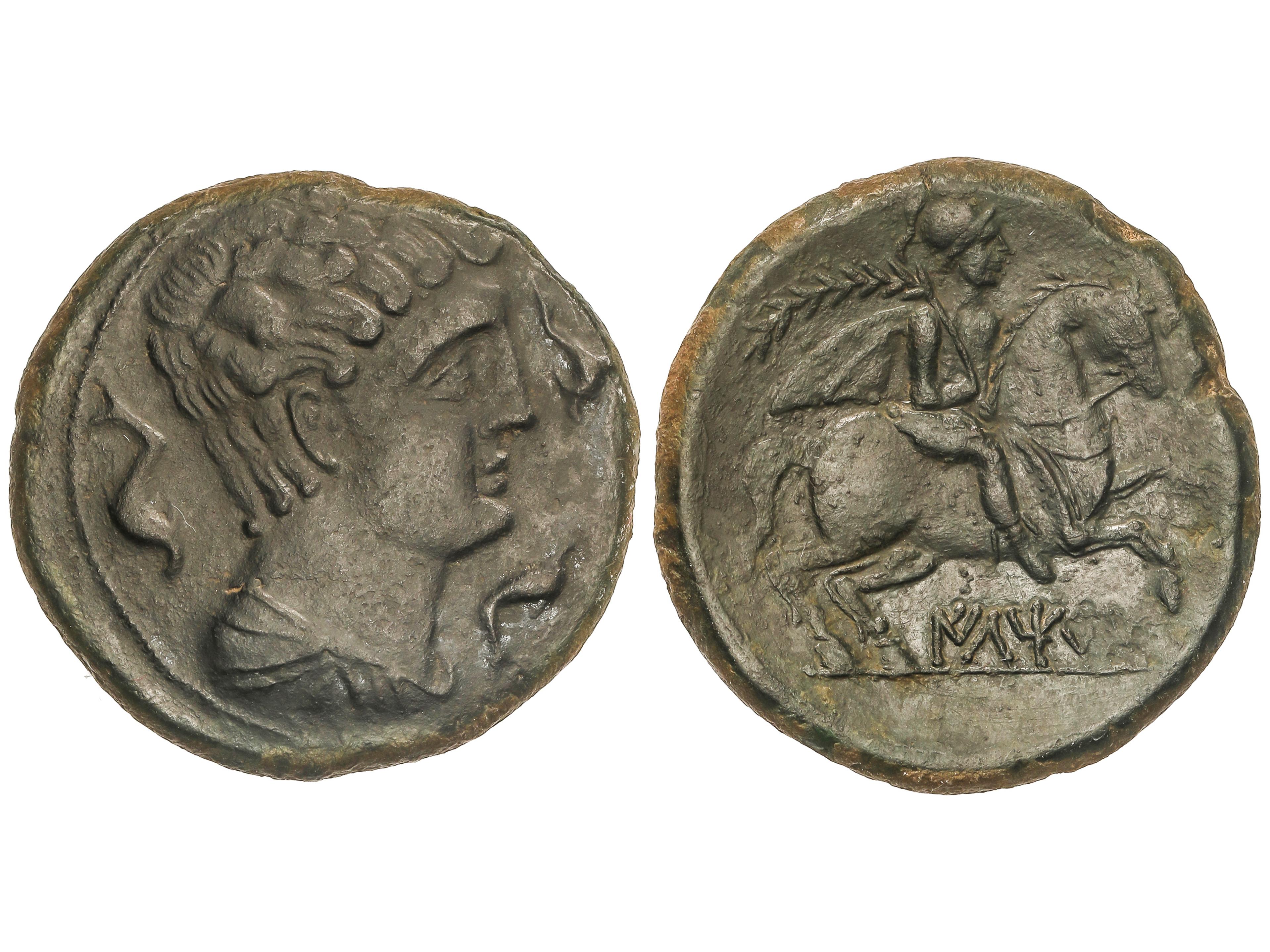 20 imageAs. 200-20 a.C. ILTIRTA (LLEIDA). Anv.: Cabeza masculina a derecha, rodeada por tres delfines. Rev.: Jinete con palma y clámide a derecha, debajo leyenda ibérica. 19,18 grs. AE. Serie semipesada. Bello ejemplar. AB-1465; ACIP-1261. EBC-. (Image1)