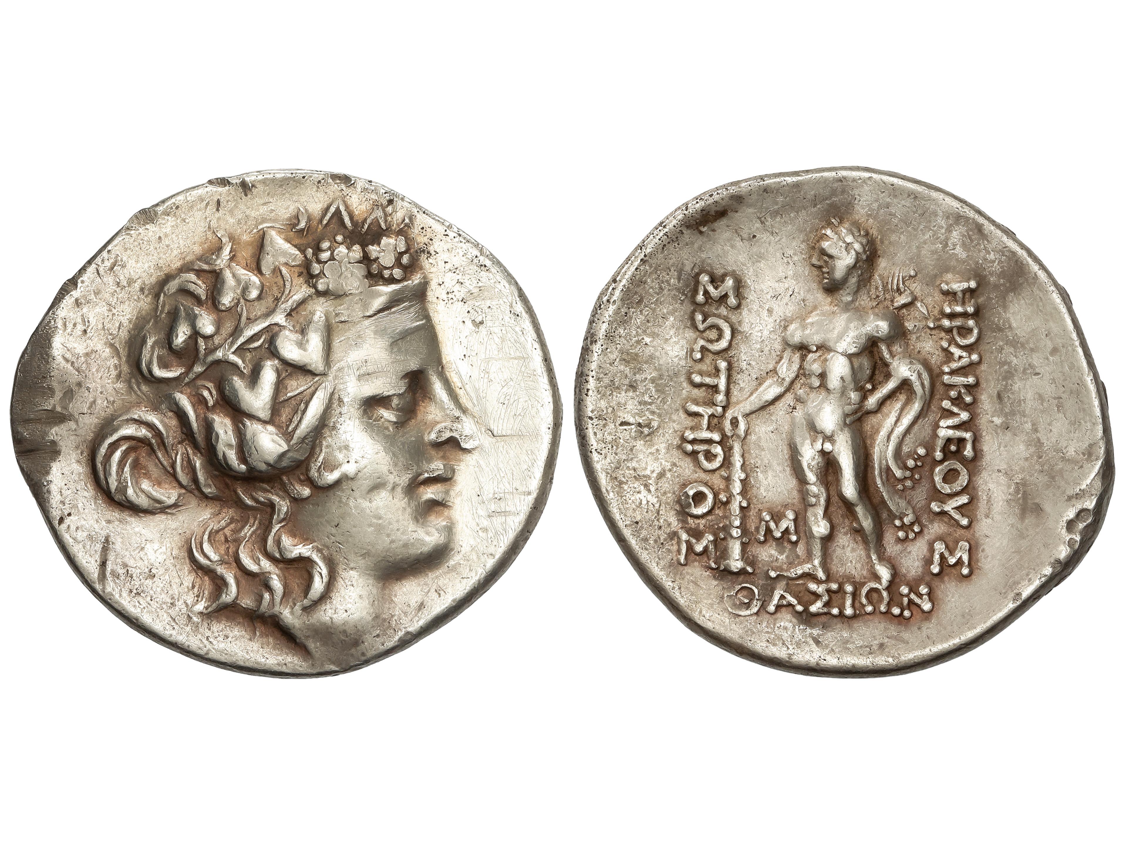7 imageTetradracma. Posterior al 148 a.C. THASOS. TRACIA. Anv.: Cabeza juvenil de Dionisos a derecha coronada de hojas de hiedra. Rev.: Hércules en pie con maza y piel de león, en el campo monograma, alrededor leyenda. 16,84 grs. AR. (Golpecitos). HGC 6-359; Se-1759. MBC+. (Image1)