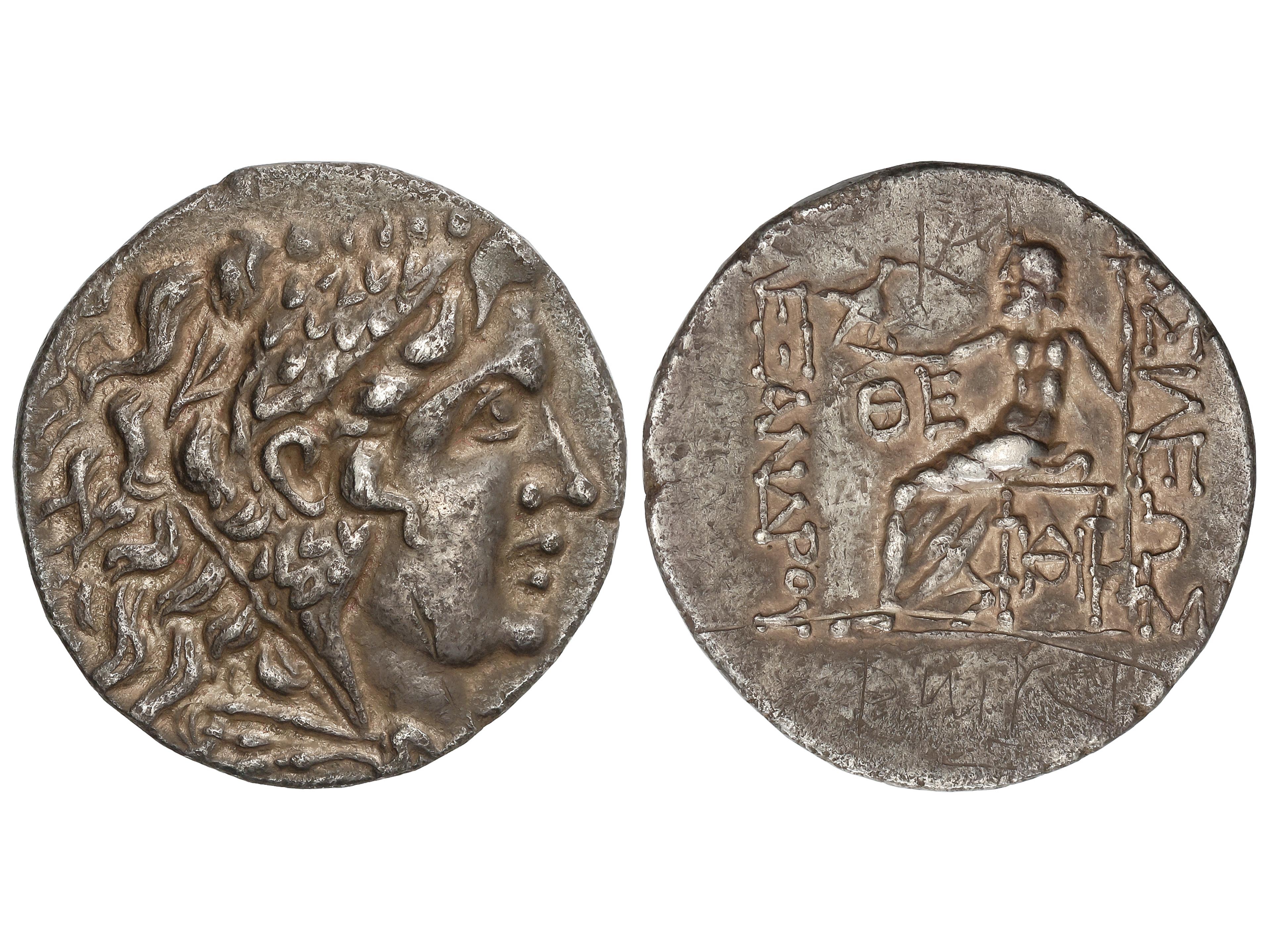 13 imageTetradracma. 150-125 a.C. EN NOMBRE Y TIPOS DE ALEJANDRO III. MESEMBRIA. TRACIA. Anv.: Cabeza de Hércules con piel de león a derecha. Rev.: Zeus entronizado a izquierda, detrás y delante leyenda, casco y AA, debajo monograma. 15,70 grs. AR. Flan grande y ovalado. Pátina. HGC 3-1568; Price 1054. MBC+. (Image1)