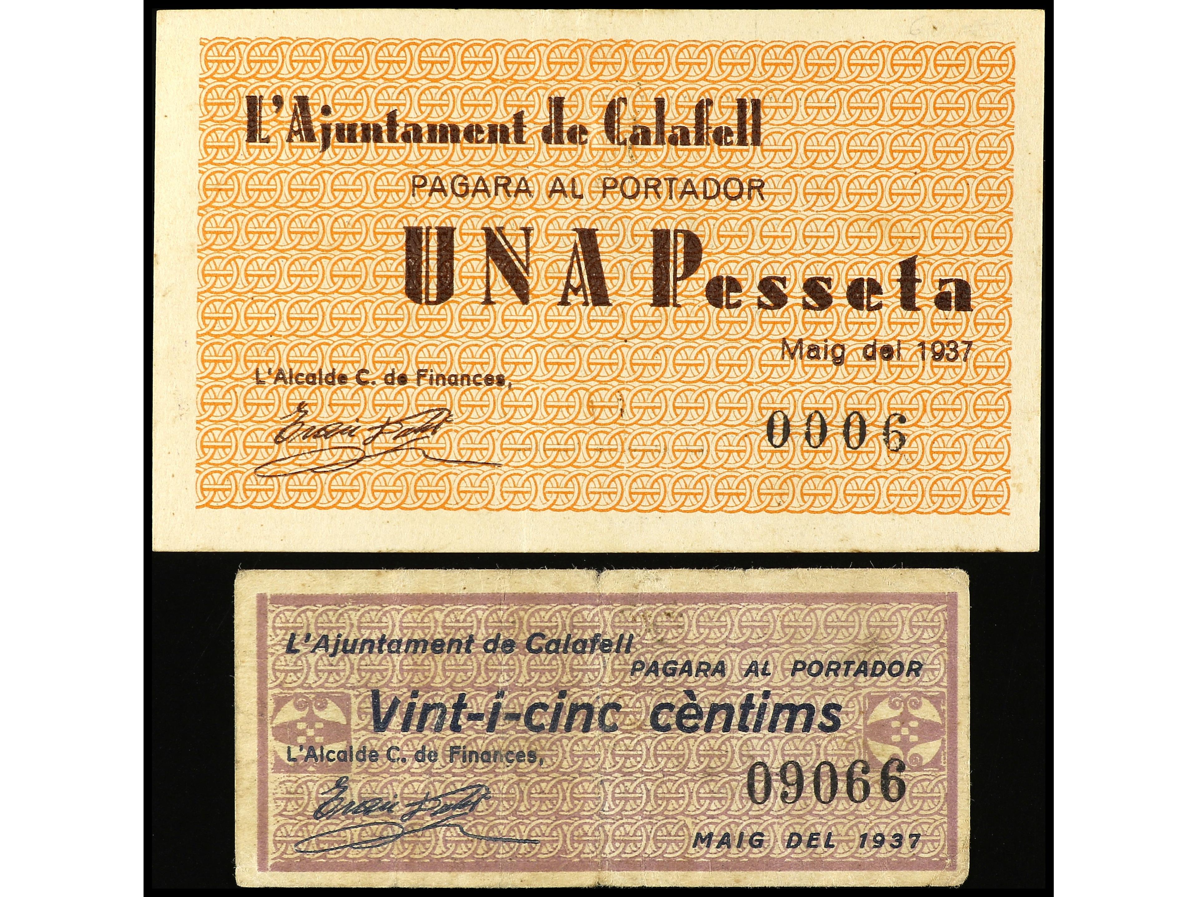 Lote 2 billetes 25 Cèntims y 1 Pesseta. Maig 1937. Aj. de CALAFELL. AT-587/588. MBC y EBC. (Image1) (Image2)
