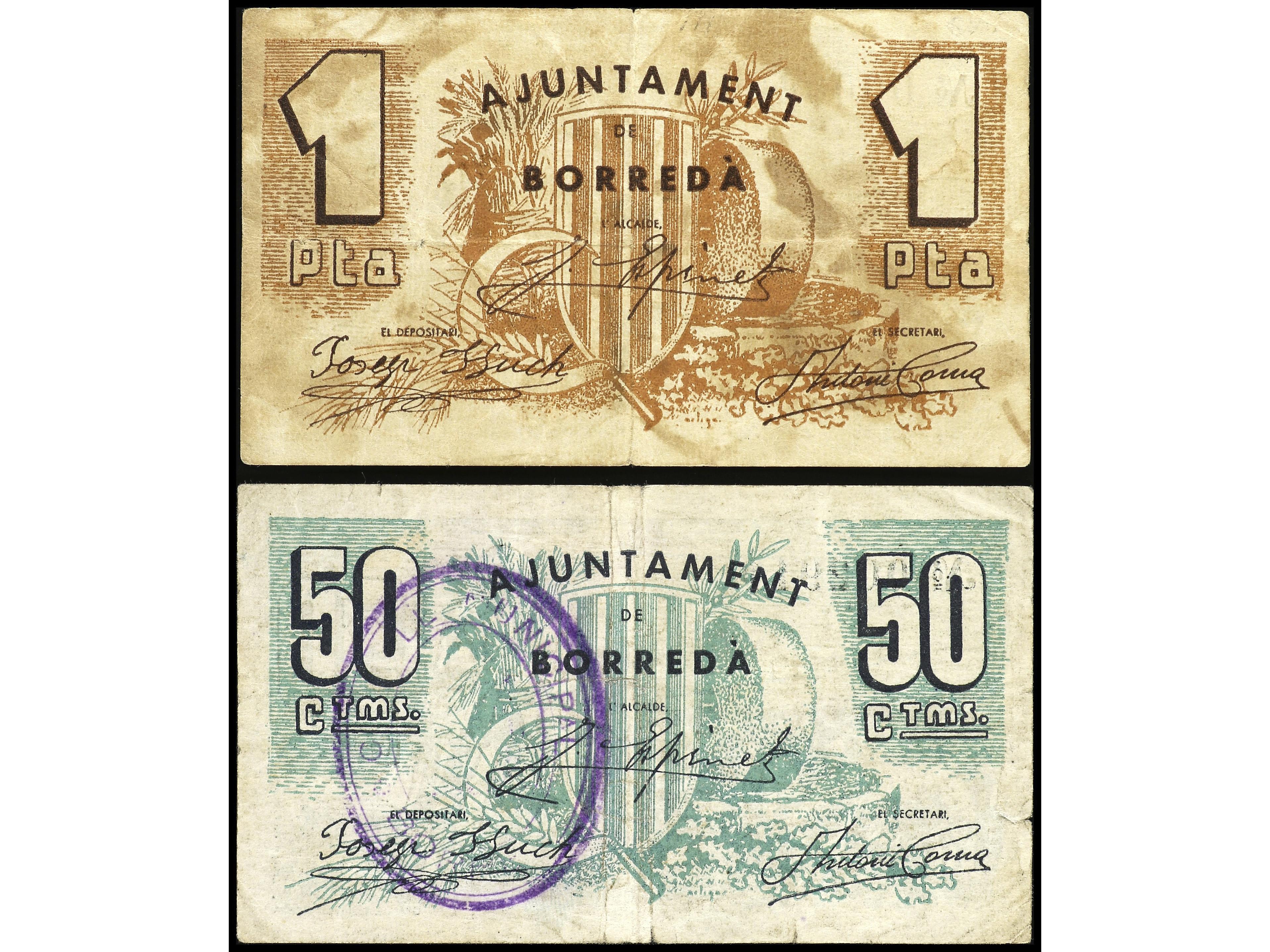 Lote 2 billetes 50 Cèntims y 1 Pesseta. Aj. de BORREDÀ. (Pequeñas roturas). AT-502, 503. MBC-. (Image1) (Image2)