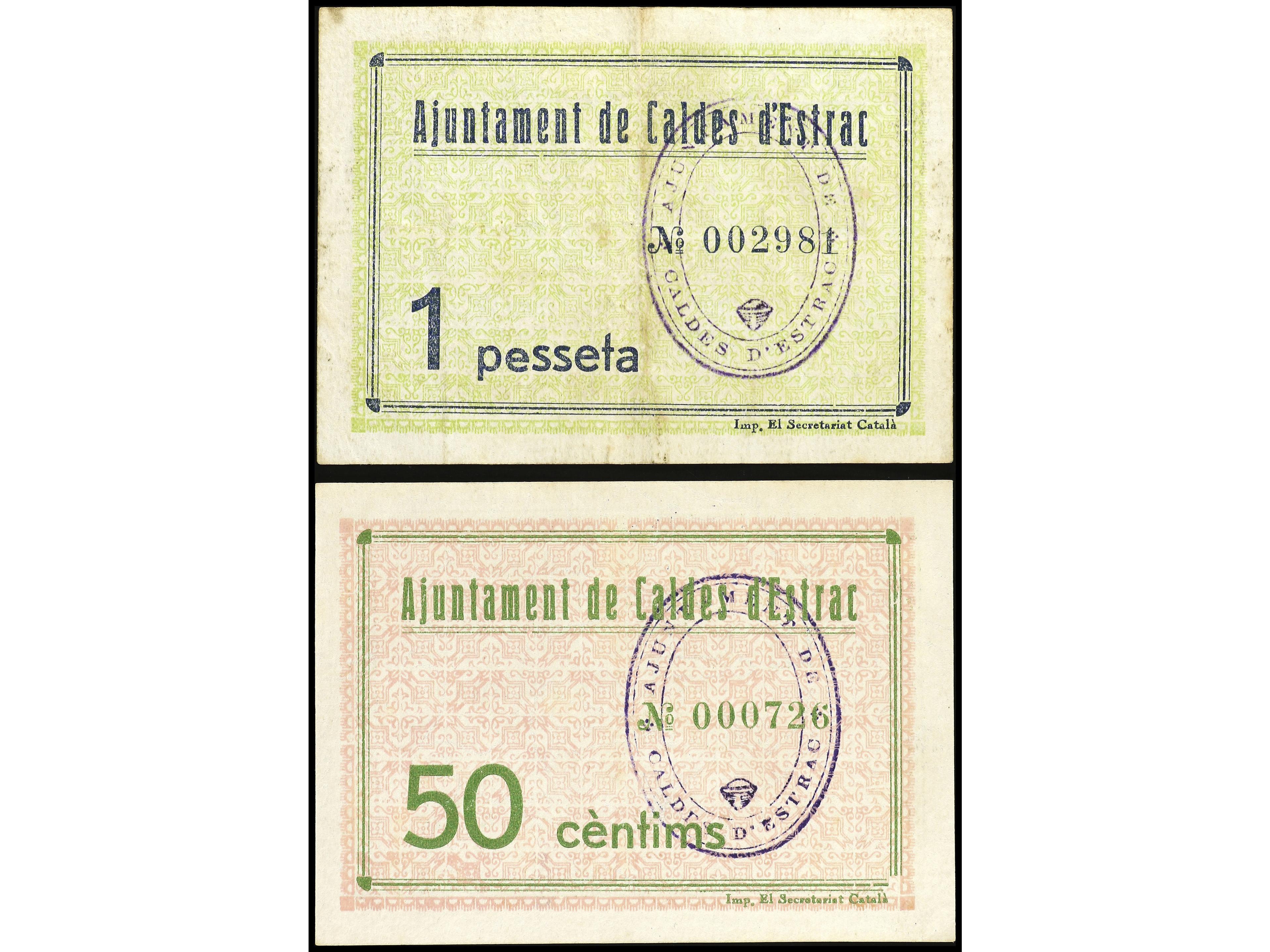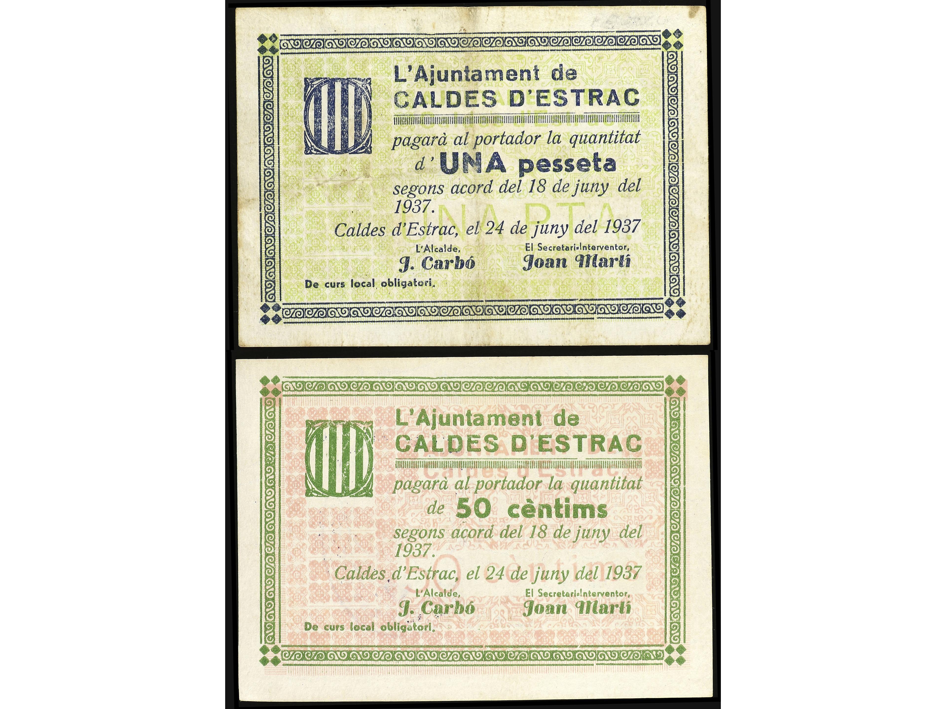 Lote 2 billetes 50 Cèntims y 1 Pesseta. 24 Juny 1937. Aj. de CALDES D´ESTRAC. AT-591, 592. MBC a MBC+. (Image1) (Image2)
