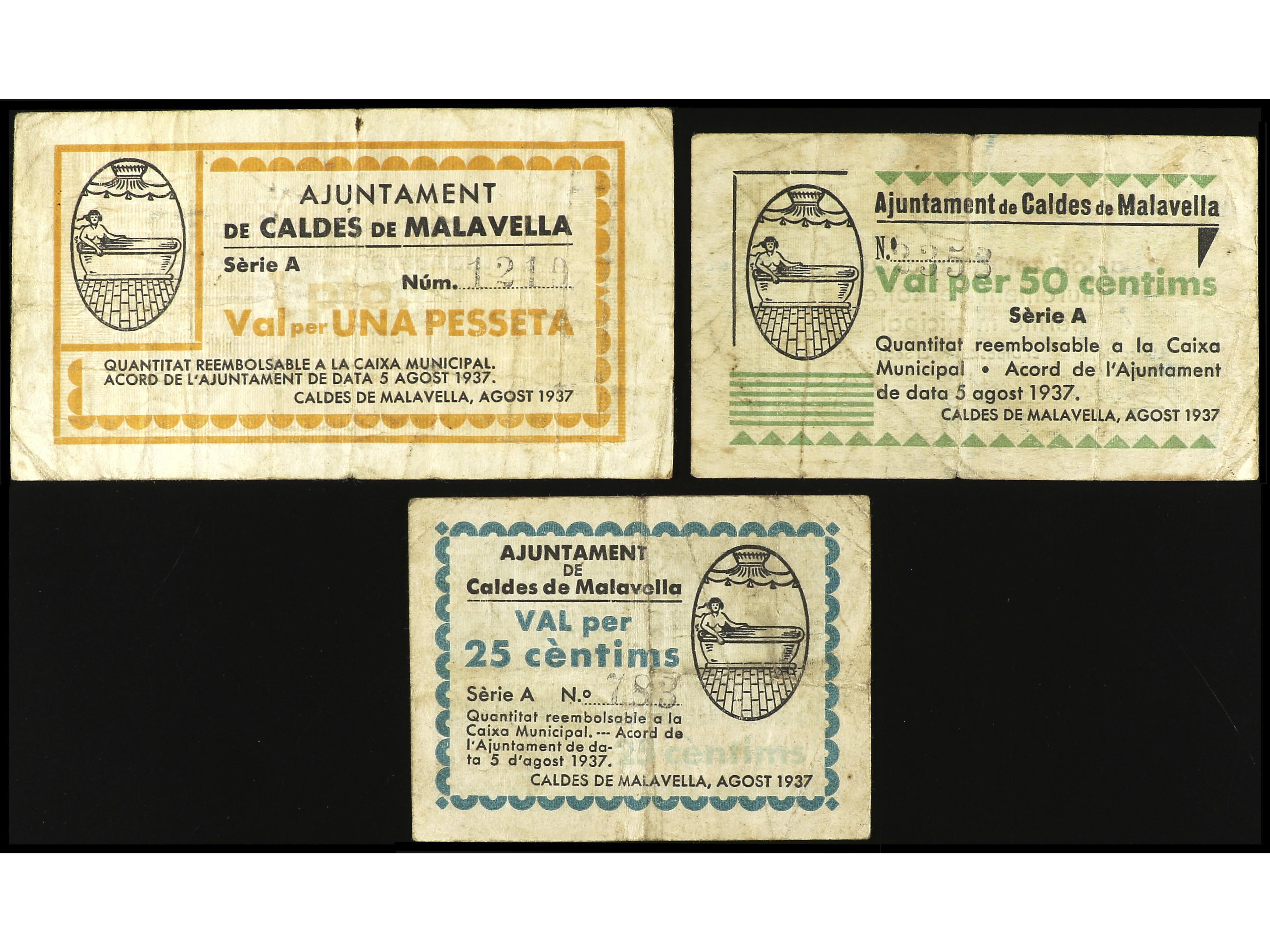 Lote 3 billetes 25, 50 Cèntims y 1 Pesseta. Agost 1937. Aj. de CALDES DE MALAVELLA. AT-593/595. MBC-. (Image1) (Image2)