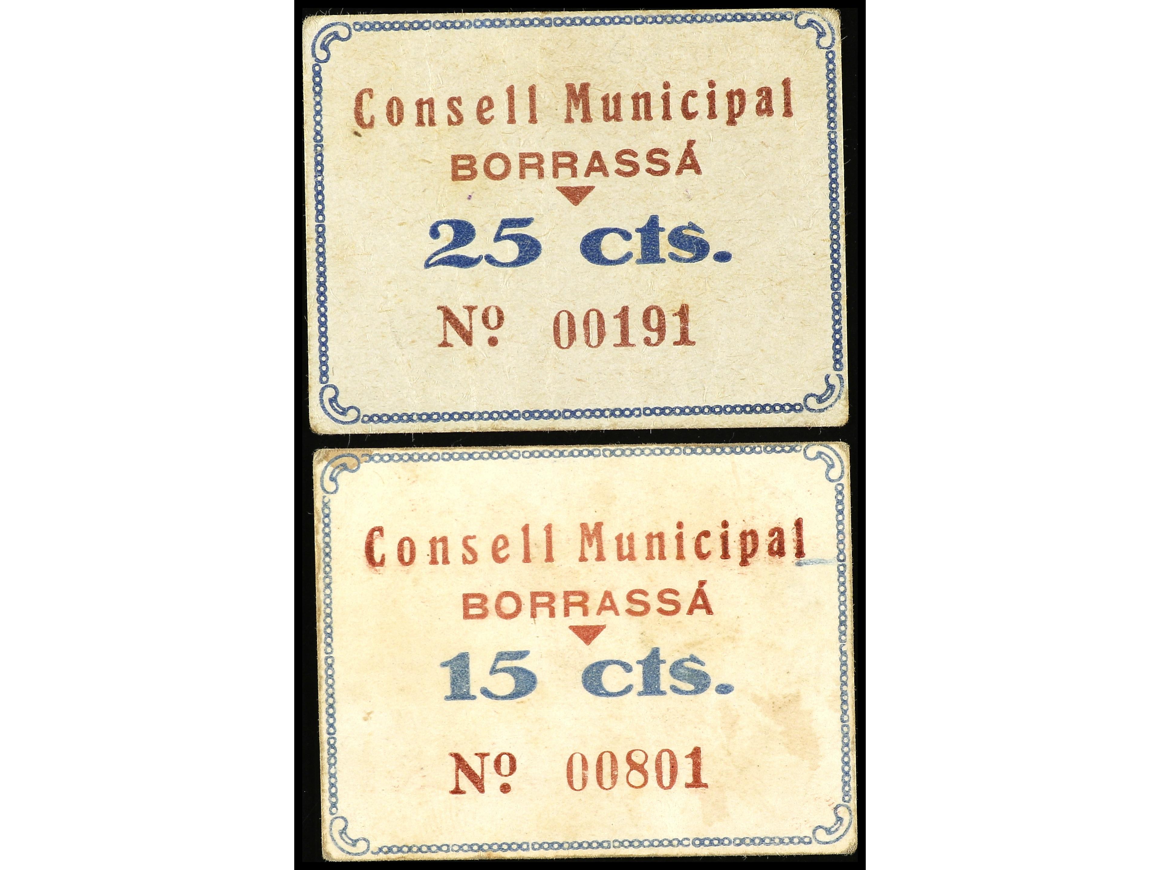 Lote 2 billetes 15 y 25 Cèntims. C.M. de BORRASSÁ. Cartón. AT-499, 500. EBC-. (Image1) (Image2)