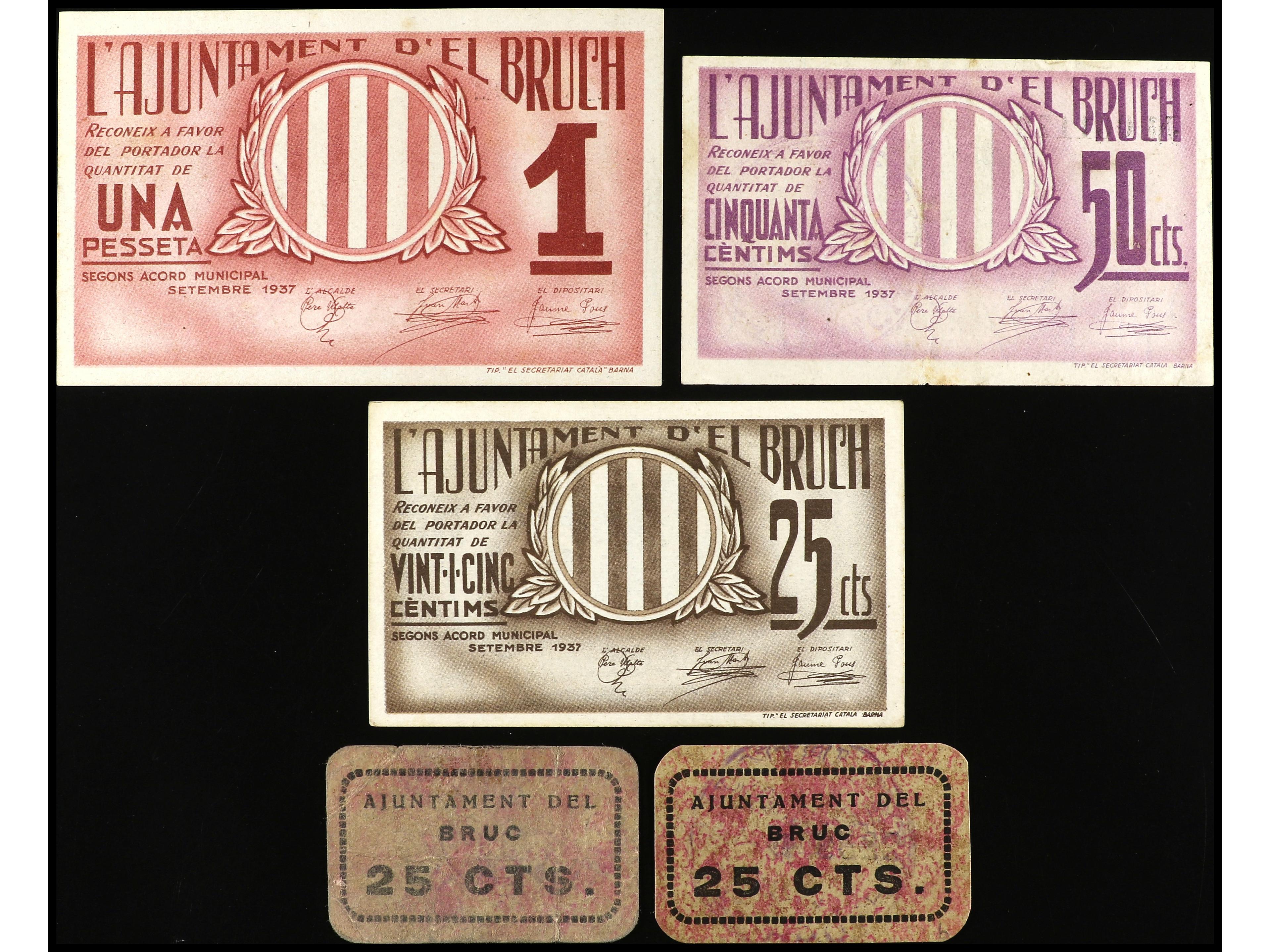 Lote 5 billetes 25 (3) y 50 Cèntims y 1 Pesseta. Aj. d´ EL BRUCH. AT-539/542. MBC a EBC-. (Image1)