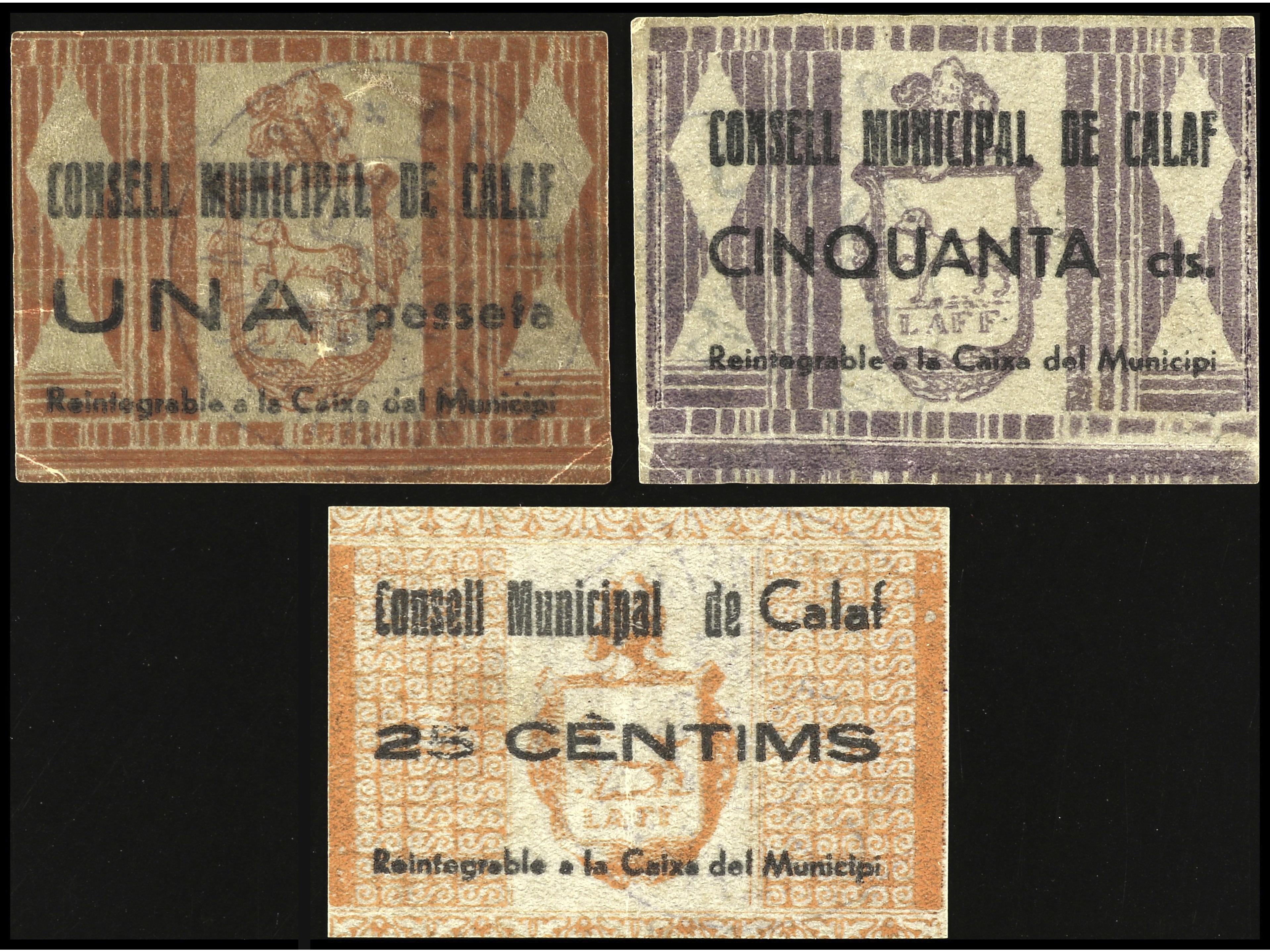 Lote 3 billetes 25, 50 Cèntims y 1 Pesseta. C.M. de CALAF. Celuloide. AT-581, 583, 585. EBC. (Image1) (Image2)