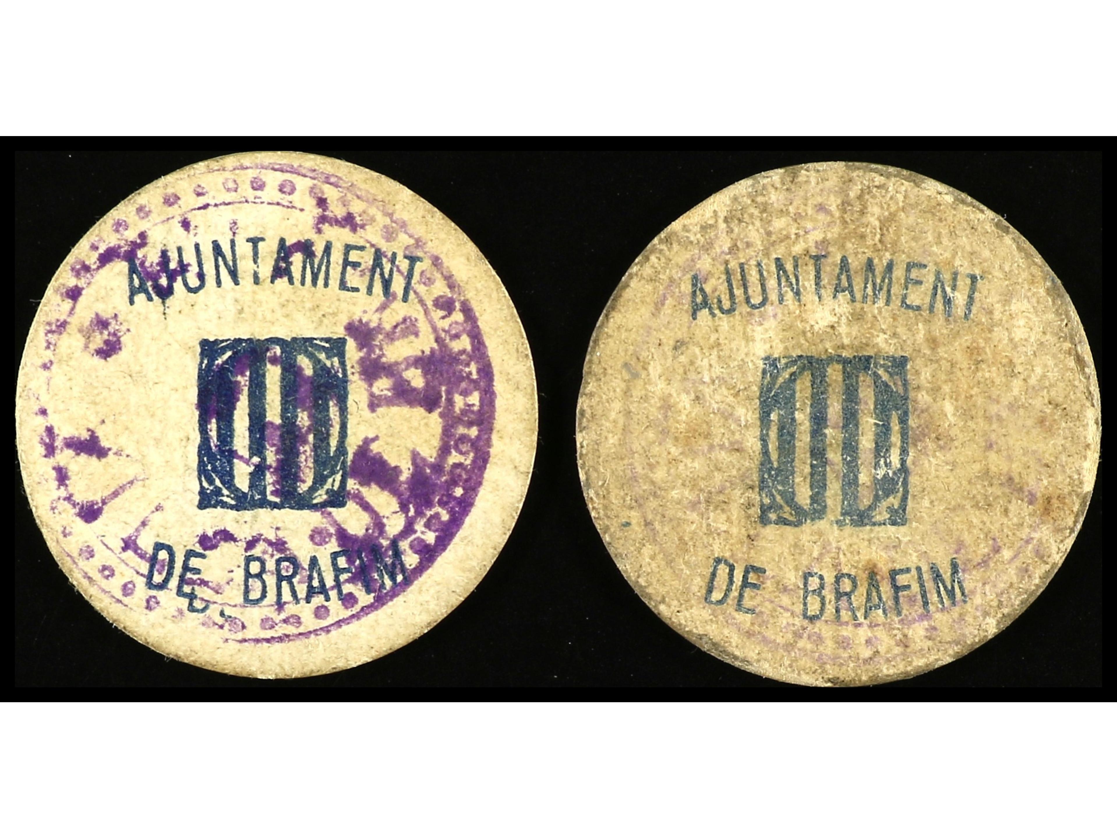 Lote 2 billetes 5 y 25 Cèntims. Aj. de BRÀFIM. Cartón redondo. AT-528, 532. MBC a MBC+. (Image1) (Image2)