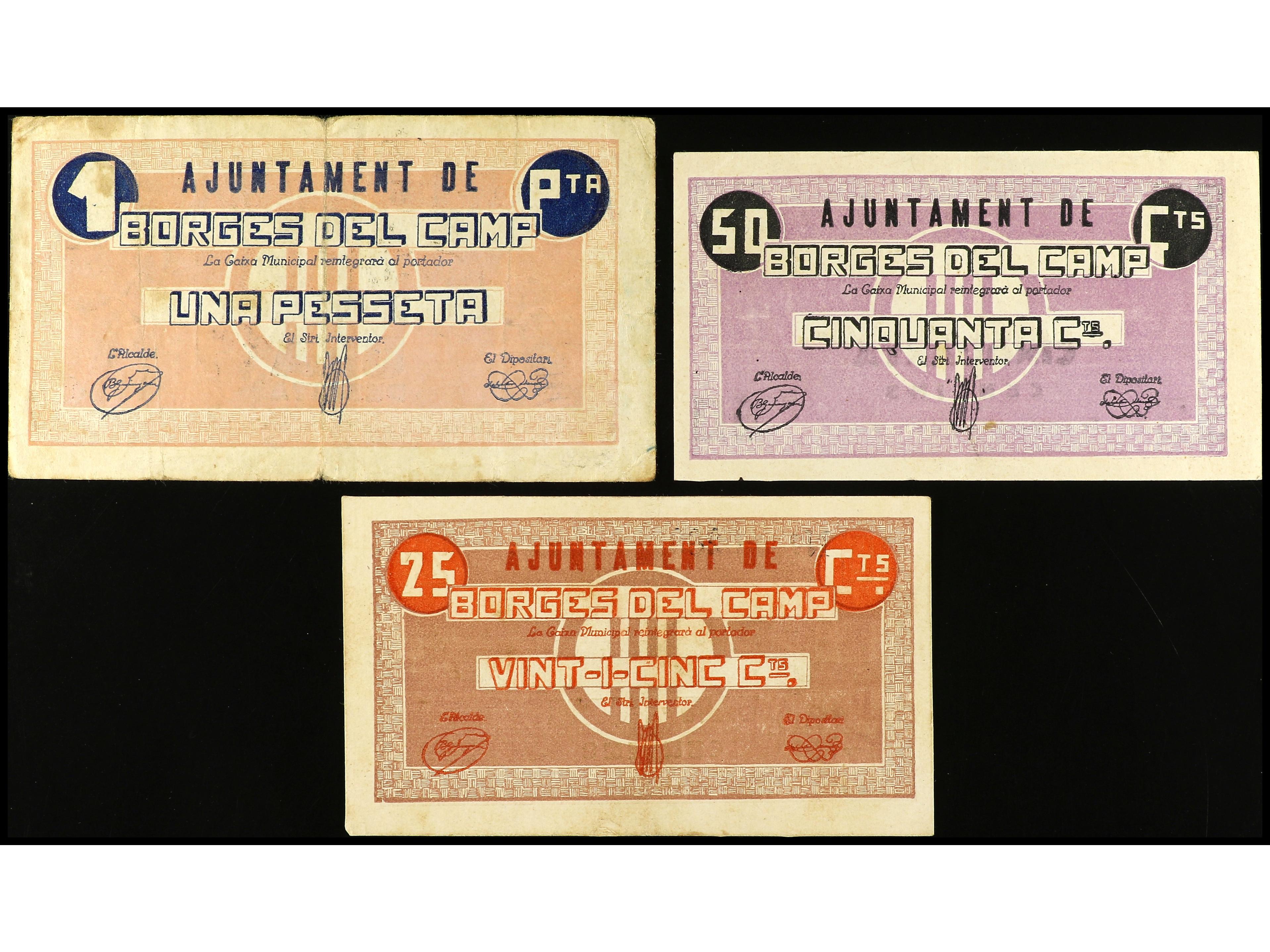 Lote 3 billetes 25, 50 Cèntims y 1 Pesseta. Aj. de BORGES DEL CAMP. ESCASOS. AT-496/498. MBC- a MBC+. (Image1) (Image2)