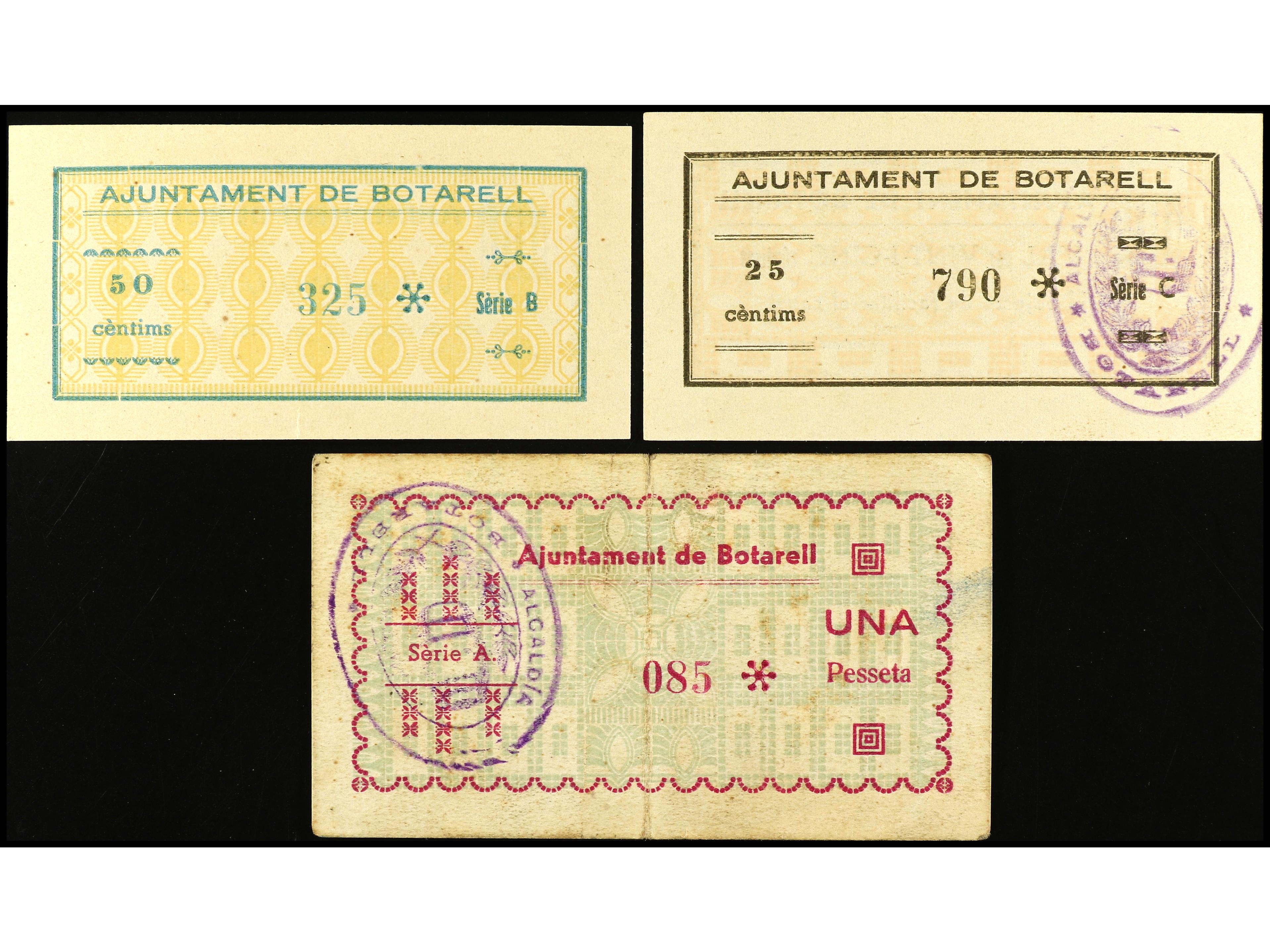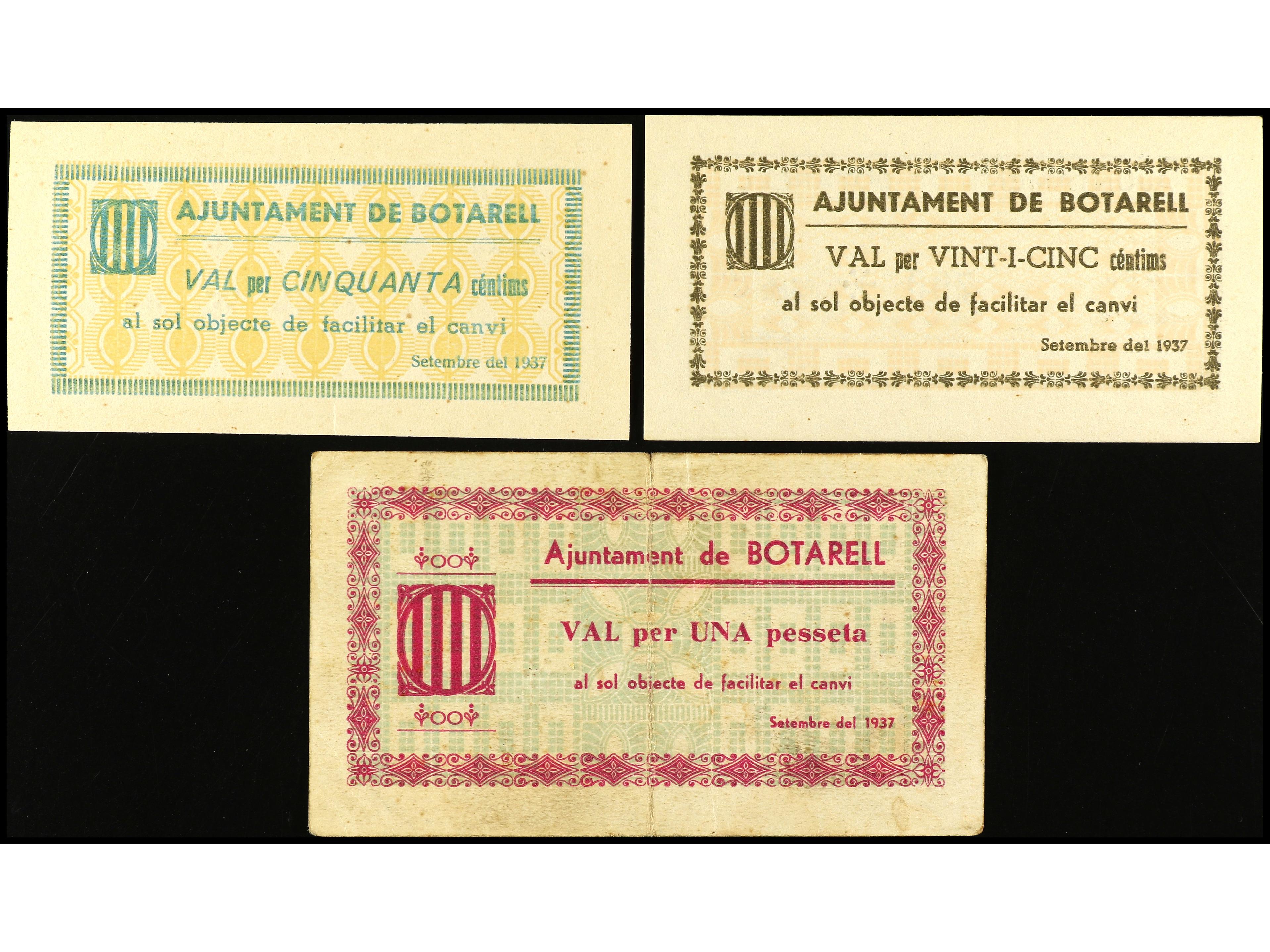 Lote 3 billetes 25, 50 Cèntims y 1 Pesseta. Setembre 1937. Aj. de BOTARELL. AT-519/21. MBC+ a EBC+. (Image1) (Image2)