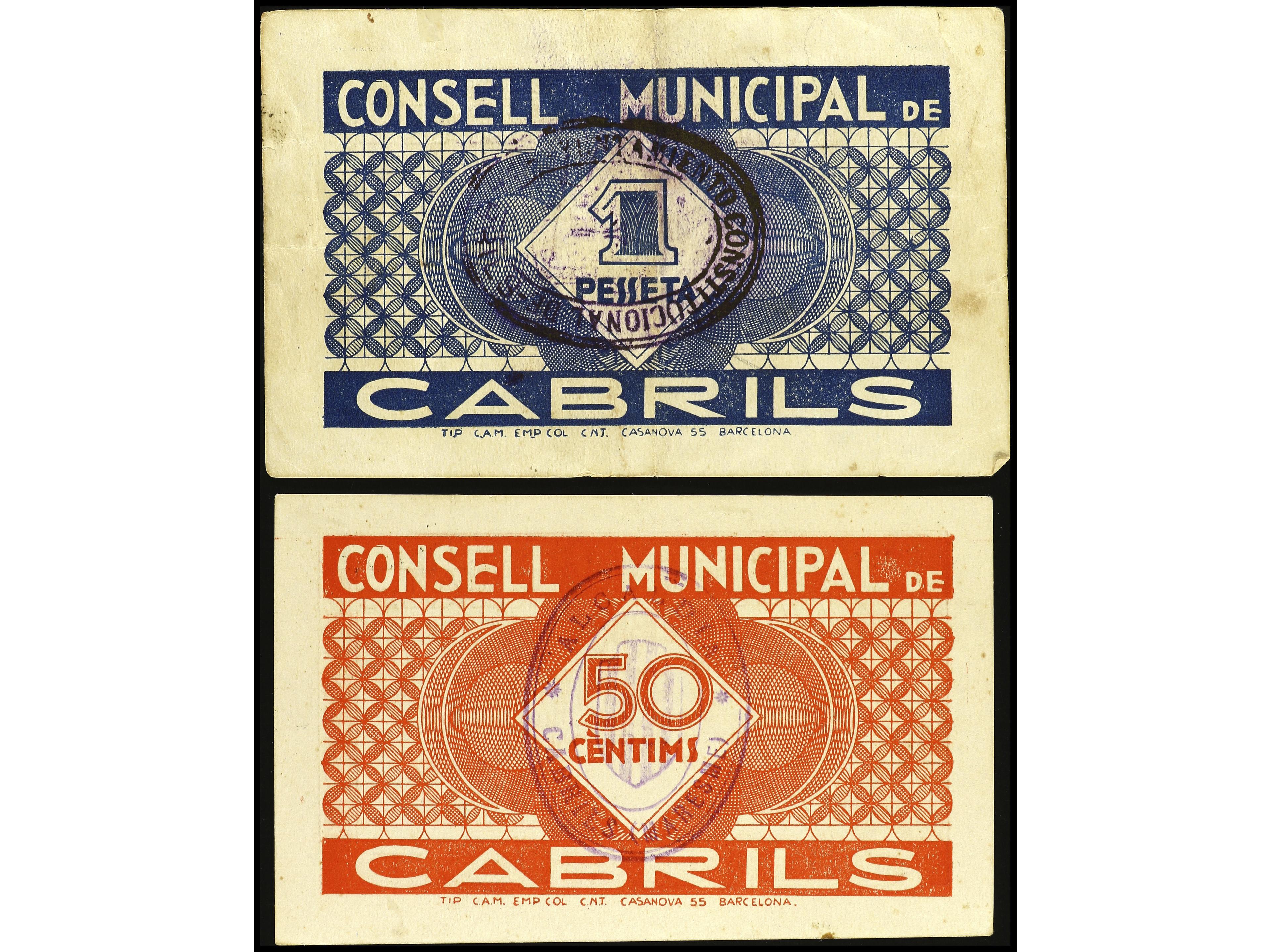 Lote 2 billetes 50 Cèntims y 1 Pesseta. 25 Maig 1937. C.M. de CABRILS. AT-562/63. MBC+ y EBC-. (Image1) (Image2)