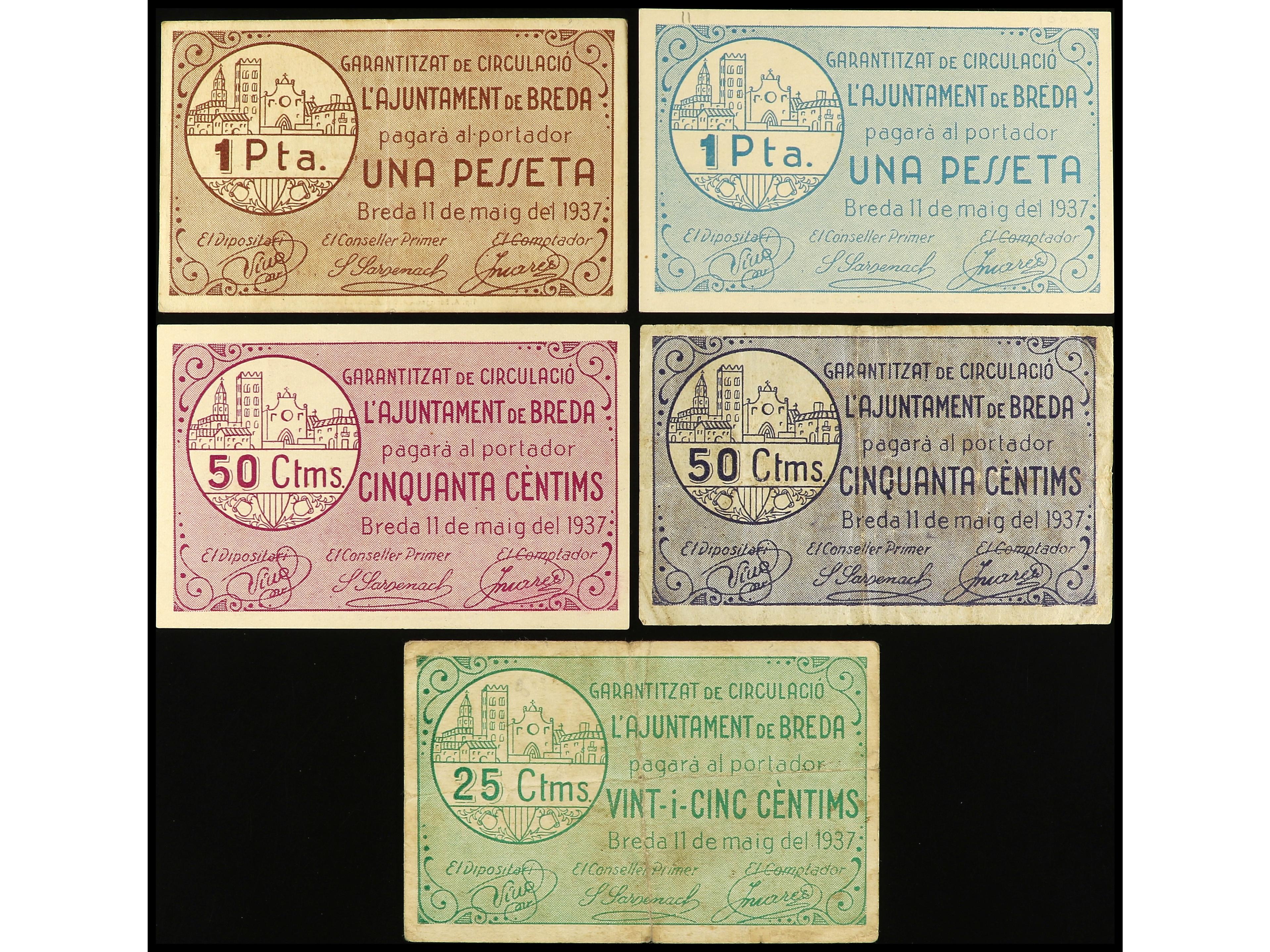 Lote 5 billetes 25, 50 (2) Cèntims y 1 Pesseta (2). 11 Maig 1937. Aj. de BREDA. AT-533, 534, 535, 536 y 537. MBC a EBC.
