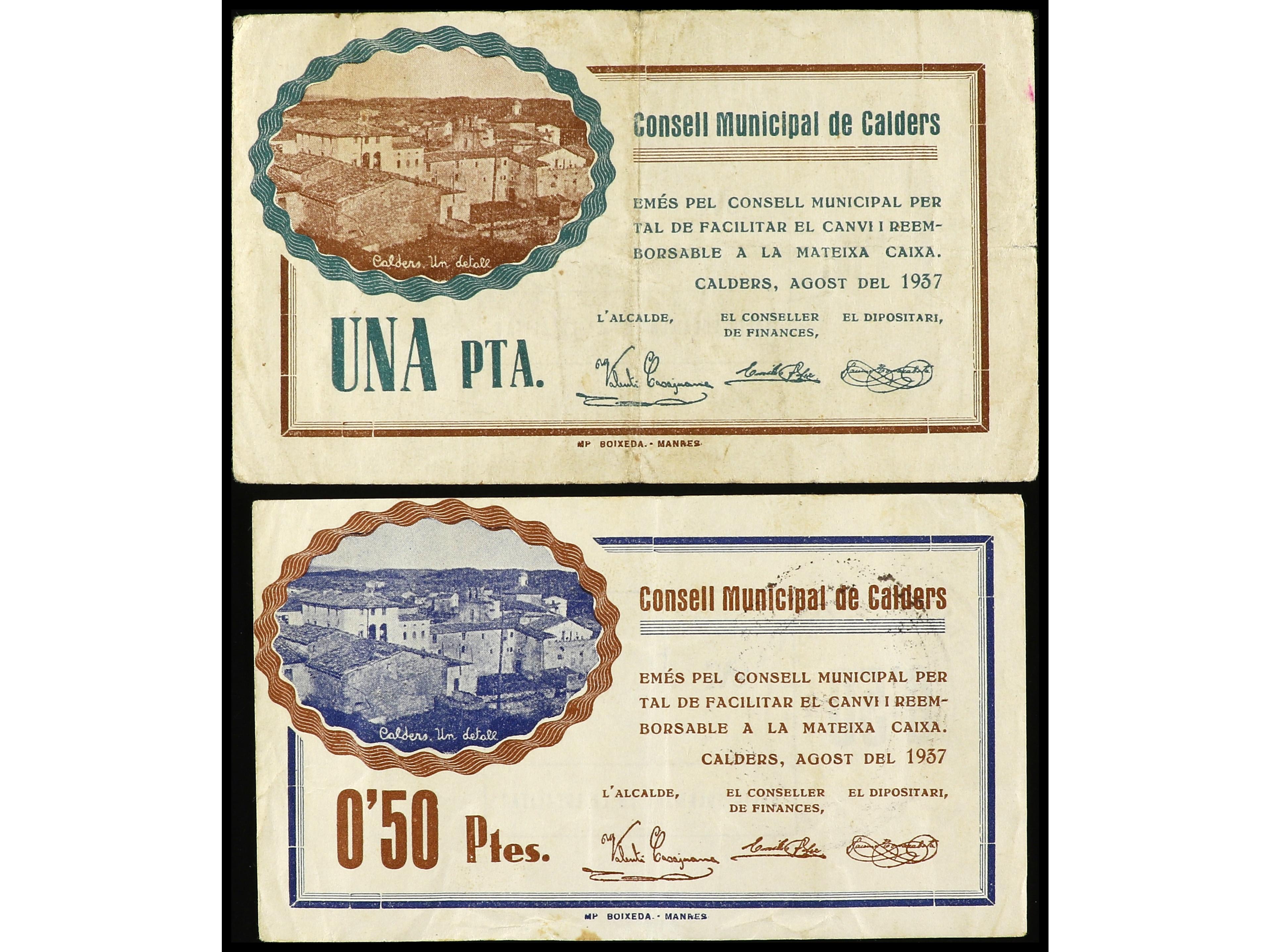 Lote 2 billetes 0´ 50 y 1 Pesseta. Agost 1937. C.M. de CALDERS. AT-589, 590. MBC. (Image1) (Image2)