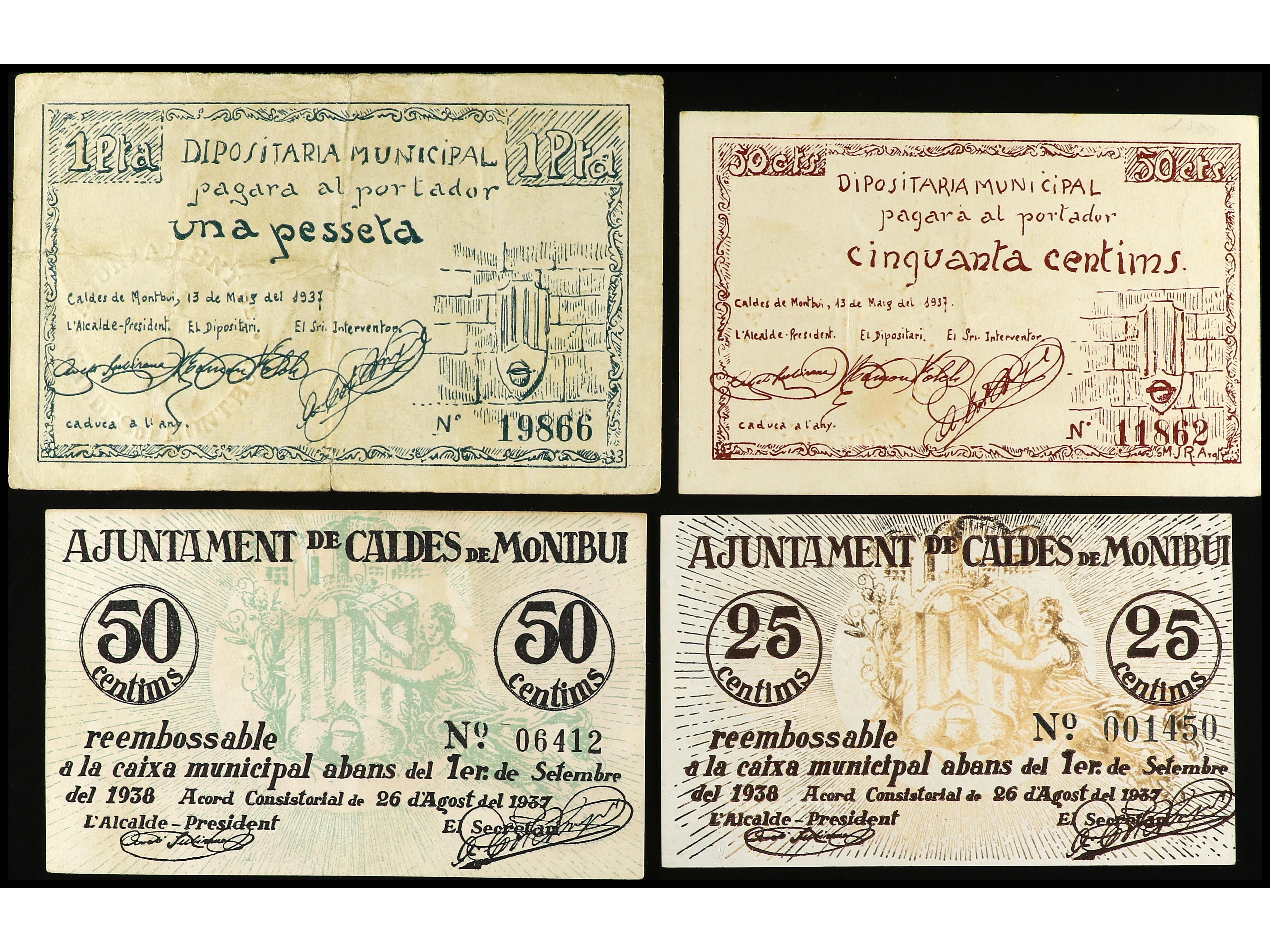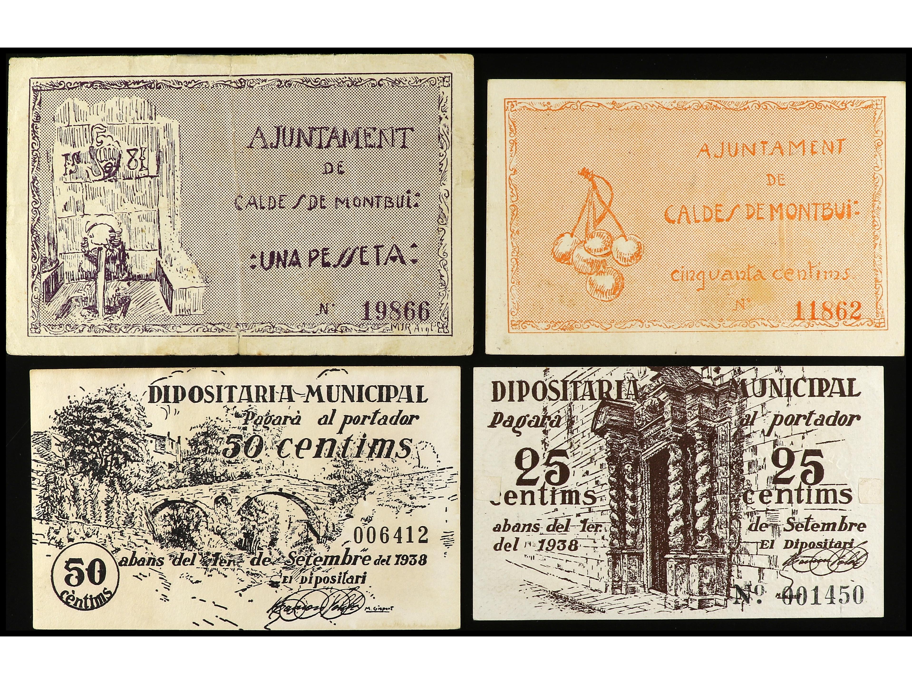 Lote 4 billetes 25, 50 Cèntims (2) y 1 Pesseta. Aj. de CALDES DE MONTBUI. AT-596/599. MBC- a MBC+. (Image1) (Image2)