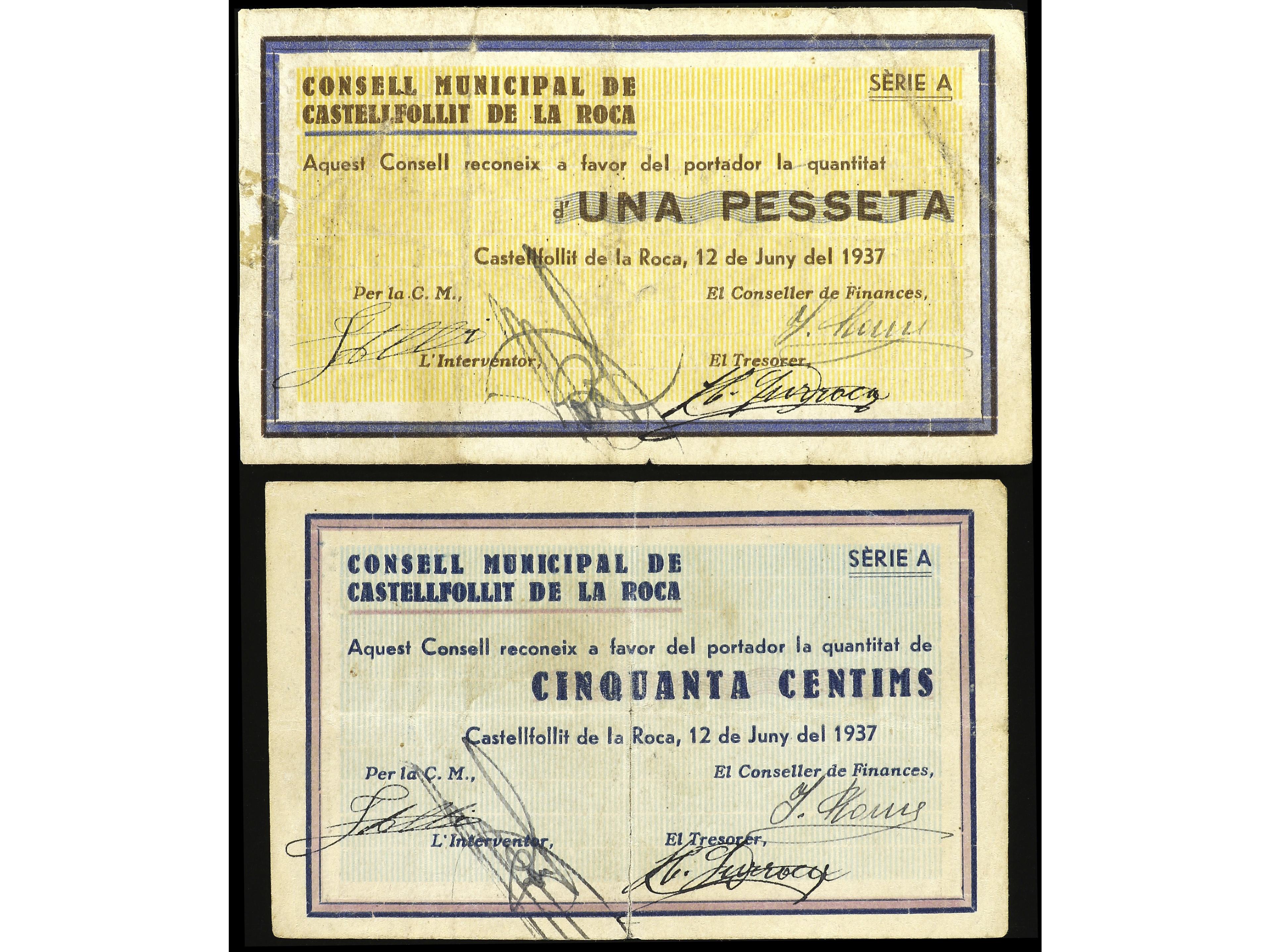 Lote 2 billetes 50 Cèntims y 1 Pesseta. 12 Juny 1937. C.M. de CASTELLFOLLIT DE LA ROCA. (50 cts reparación con adhesivo). AT-723, 724. MBC- a MBC. (Image1) (Image2)