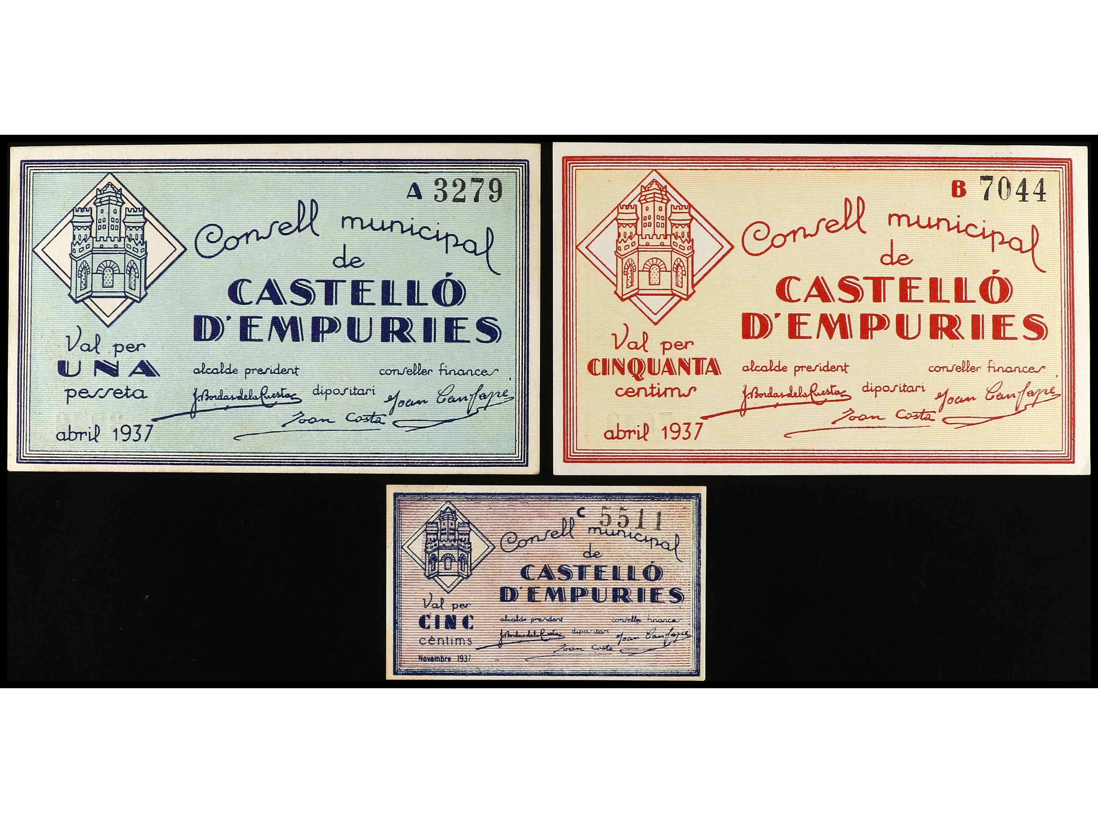 Lote 3 billetes 5, 50 Cèntims y 1 Pesseta. Abril y Novembre 1937. C.M. de CASTELLÓ D´EMPURIES. AT-745b, 746b, 747. EBC- a EBC.