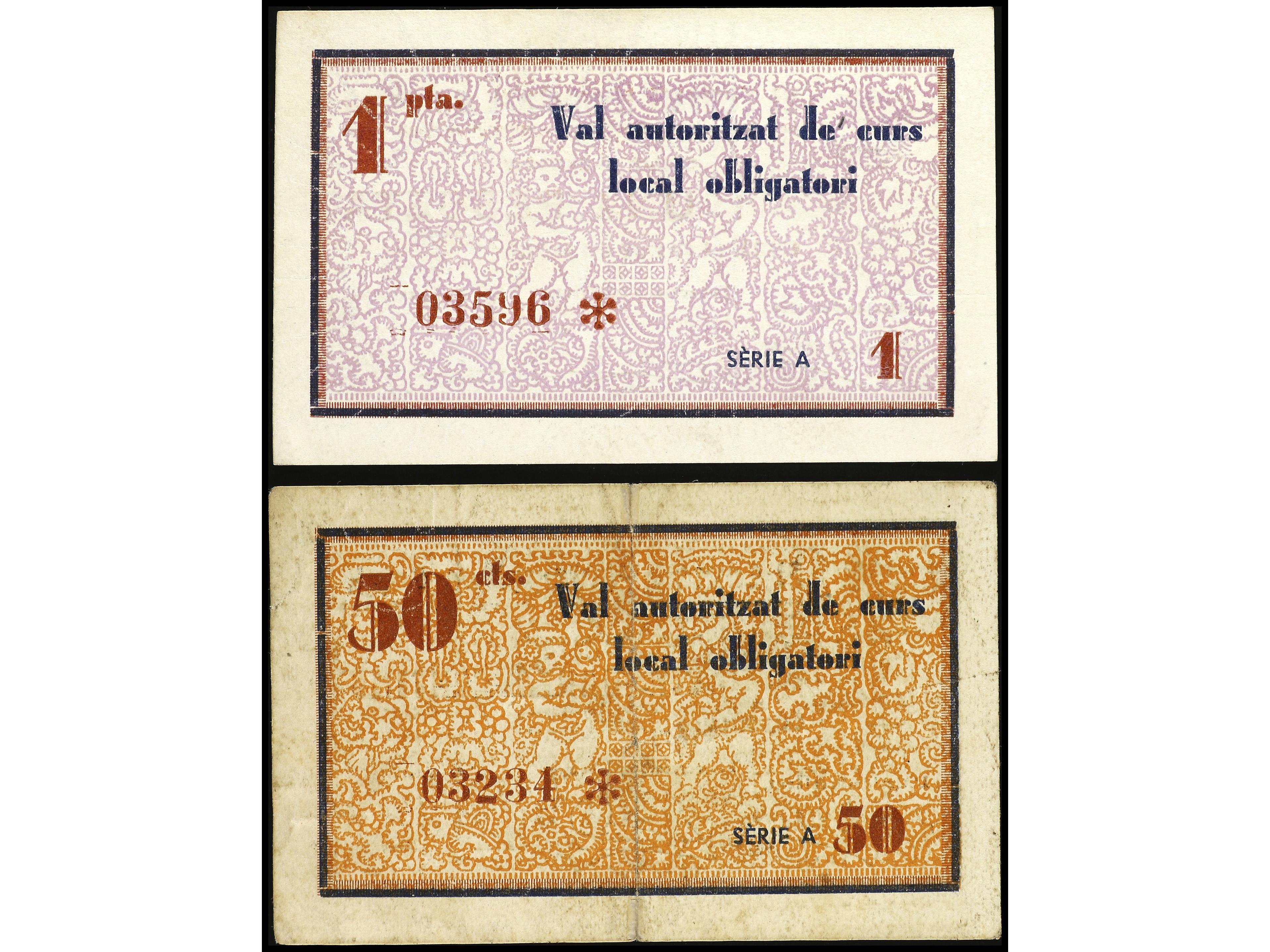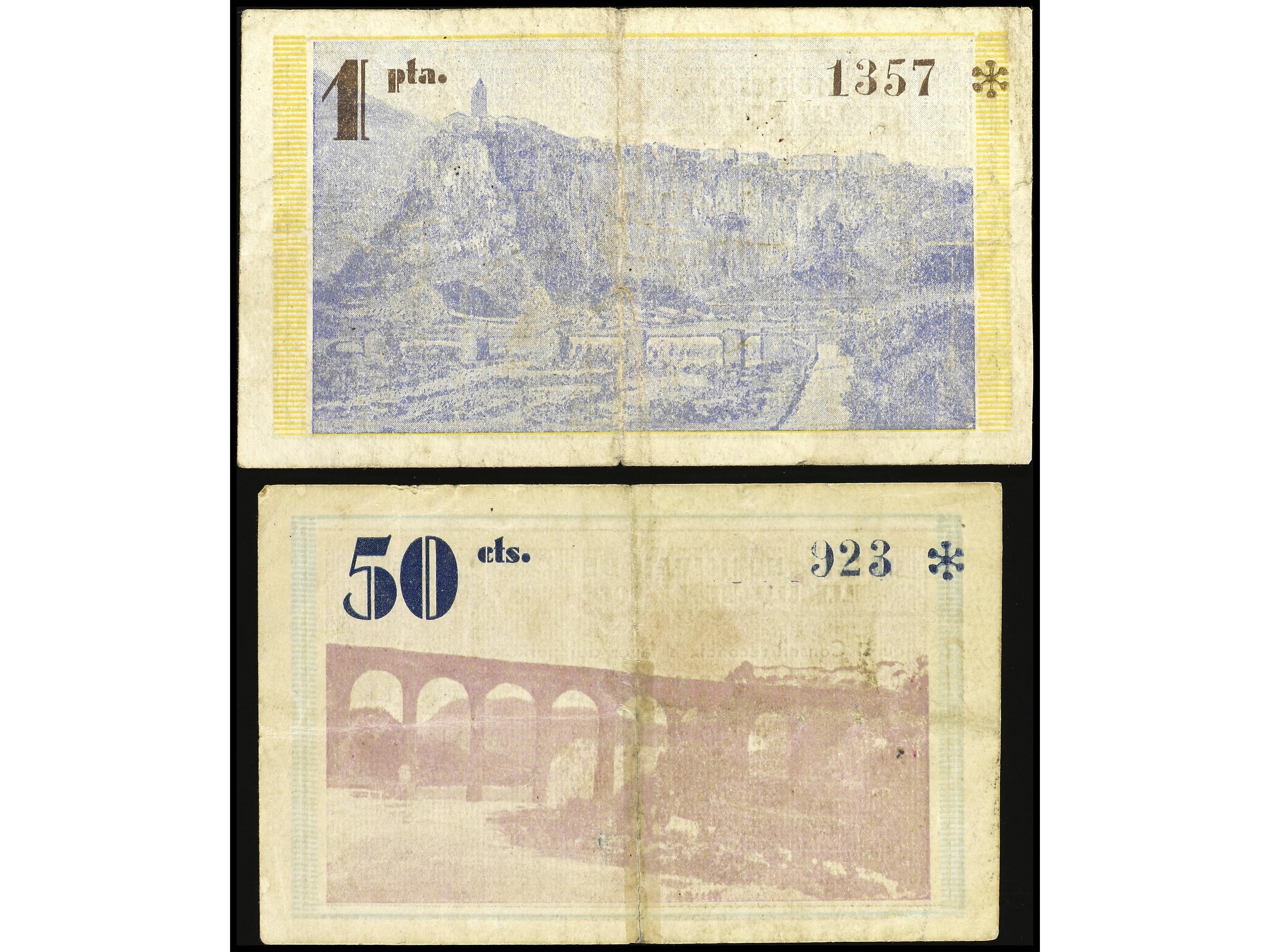 Lote 2 billetes 50 Cèntims y 1 Pesseta. 14 Juny 1937. C.M. de CELRÀ. AT-800, 801. MBC y MBC+. (Image1) (Image2)