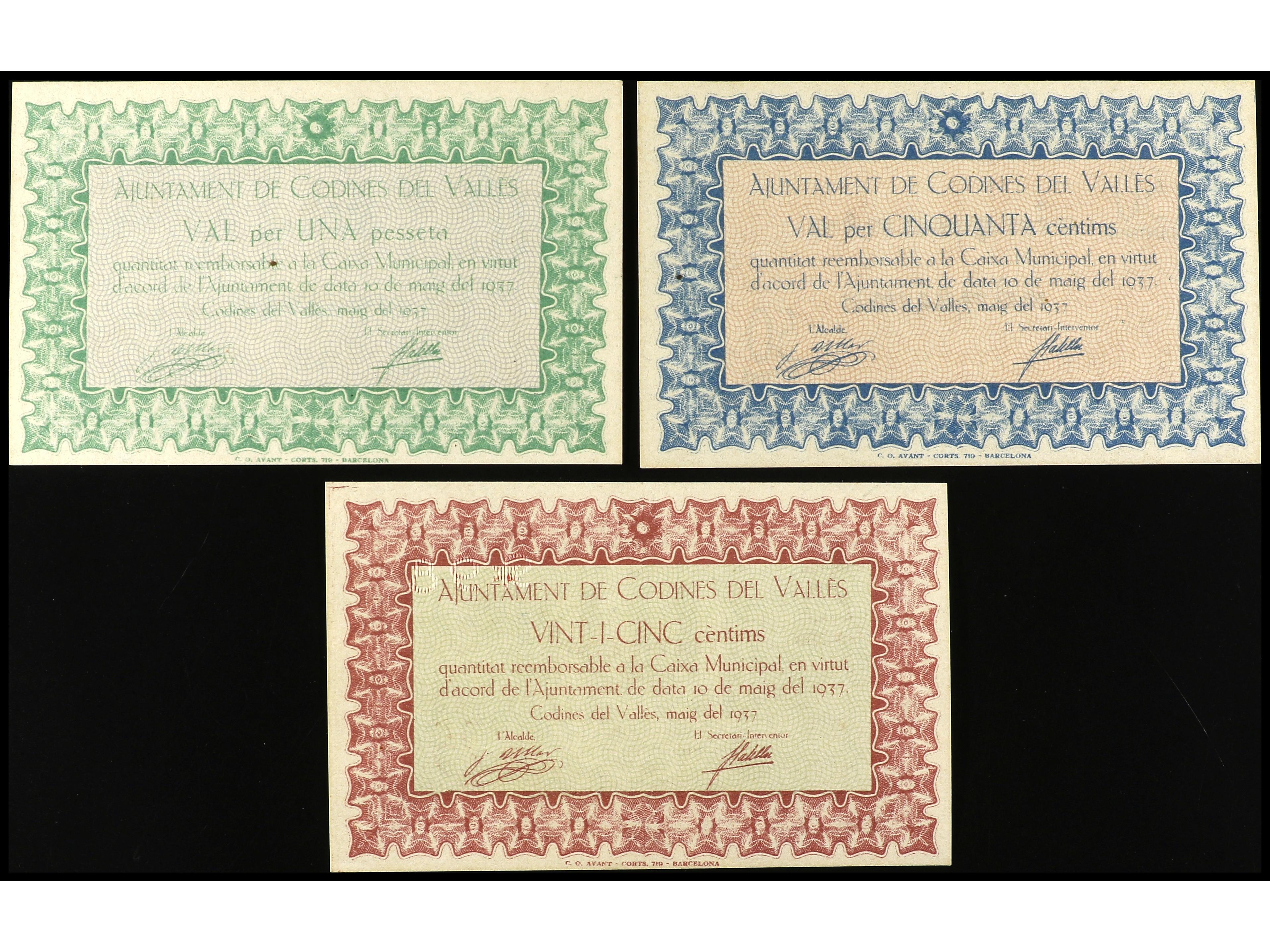 Lote 3 billetes 25, 50 Cèntims y 1 Pesseta. 10 Maig 1937. Aj. de CODINES DEL VALLÈS. AT-839/841. EBC-. (Image1) (Image2)