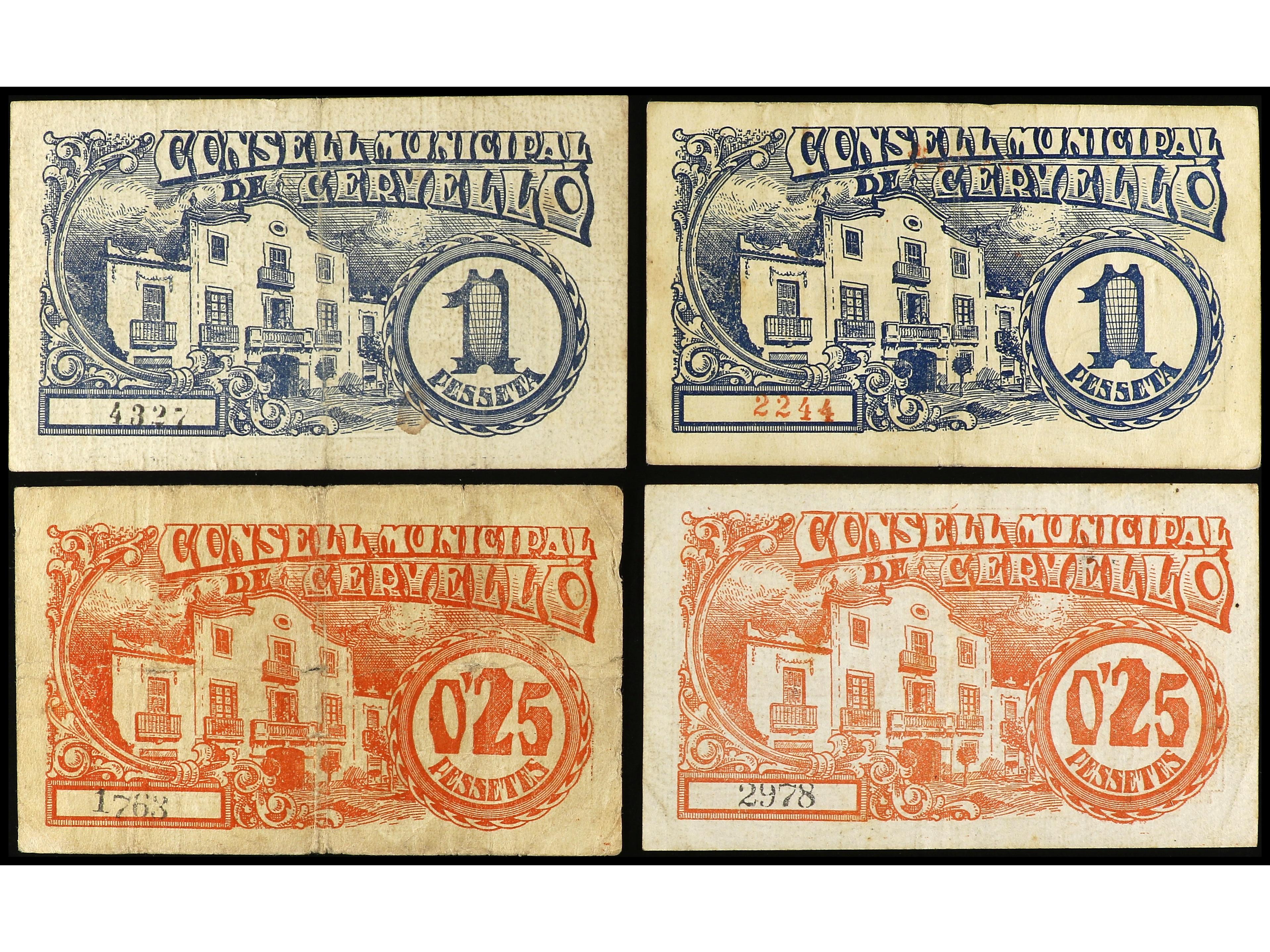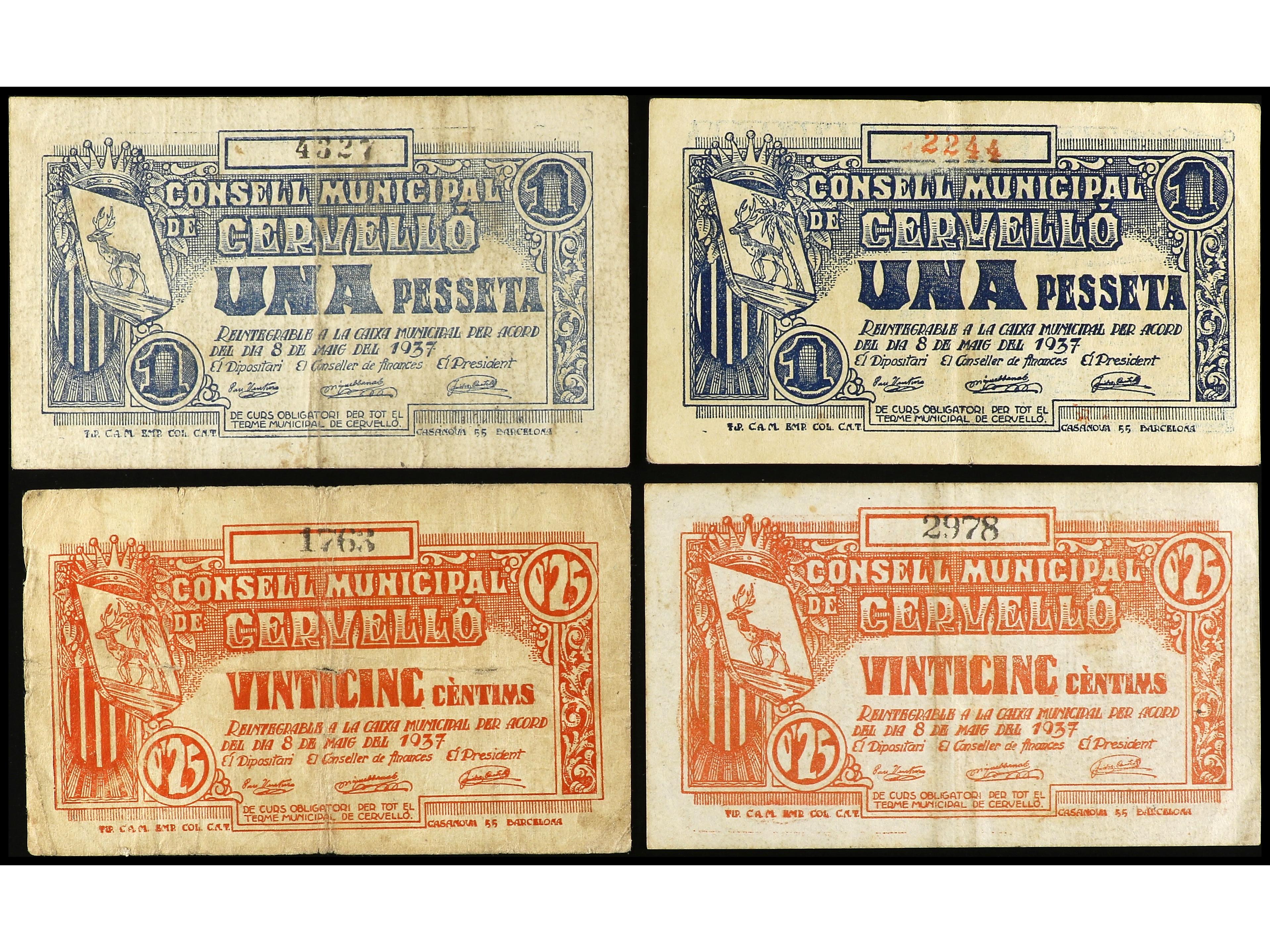 Lote 4 billetes 0, 25 Cèntims (2) y 1 Pesseta (2). 8 Maig 1937. C.M. de CERVELLÓ. AT-806, 807, 808, 809. MBC- a MBC+.