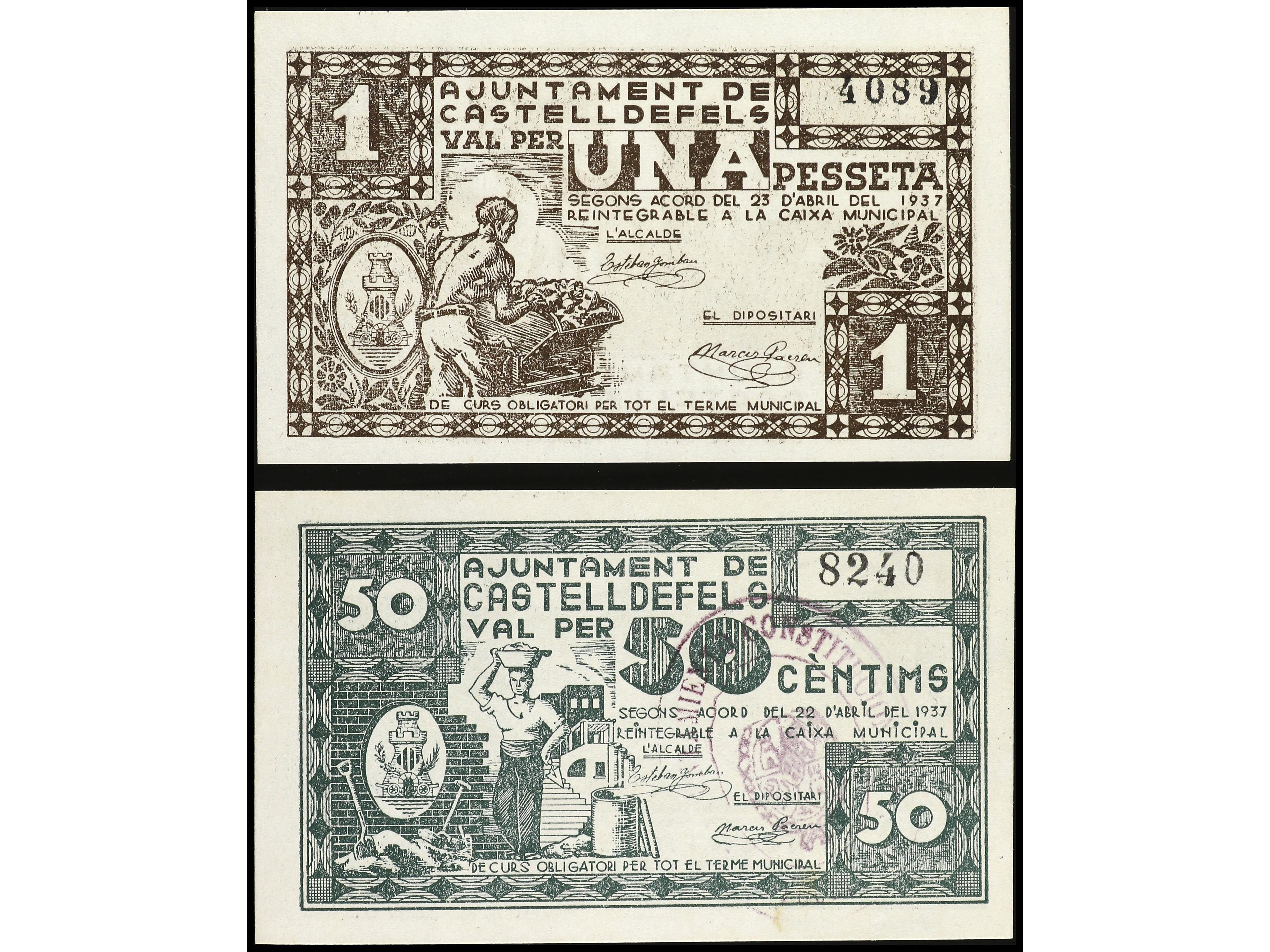 Lote 2 billetes 50 Cèntims y 1 Pesseta. 22 Abril 1937. Aj. de CASTELLDEFELS. AT-714b, 715. EBC. (Image1) (Image2)