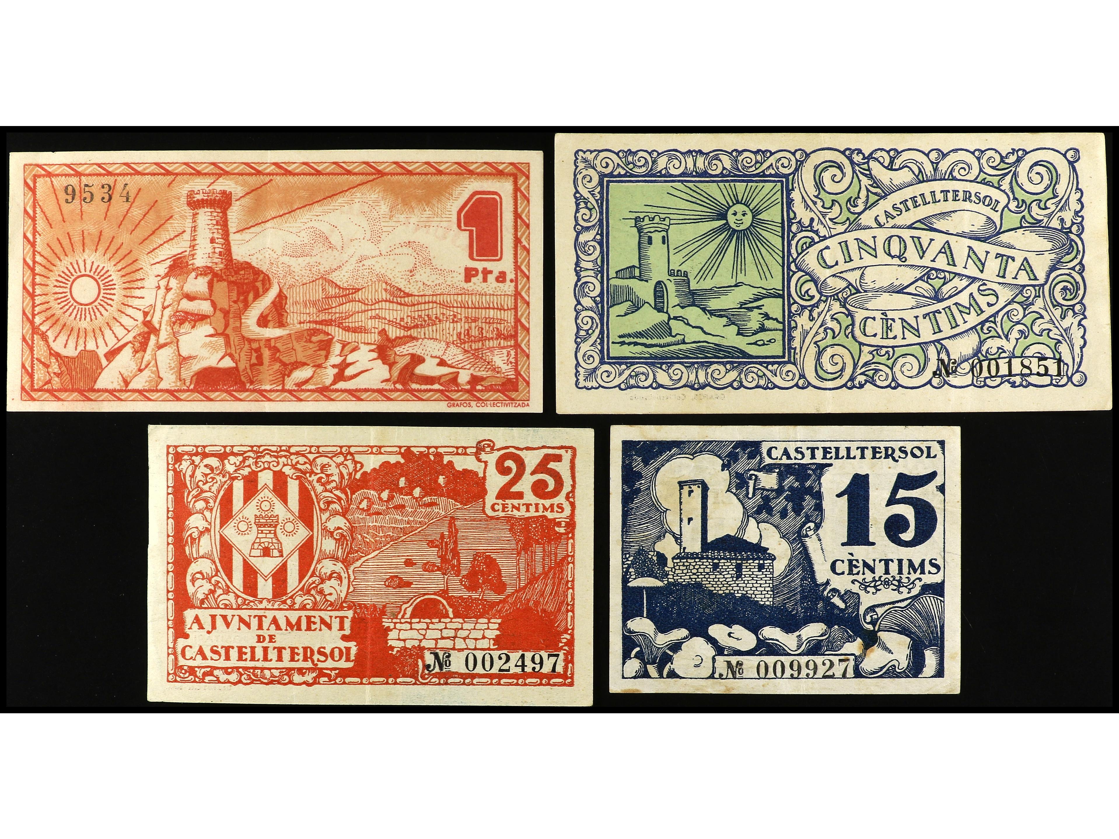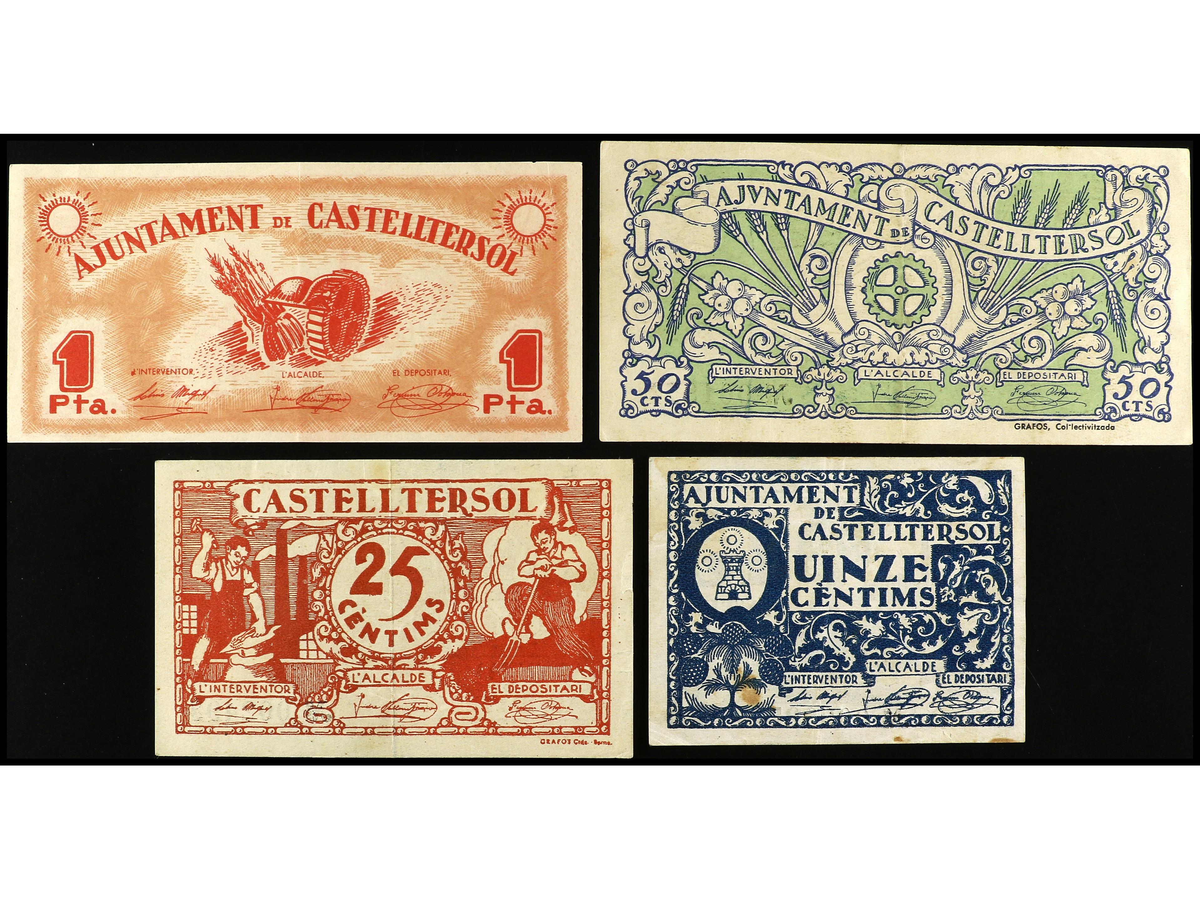Lote 4 billetes 15, 25, 50 Cèntims y 1 Pesseta. Aj. de CASTELLTERSOL. AT-767/770. MBC+ a EBC-. (Image1) (Image2)
