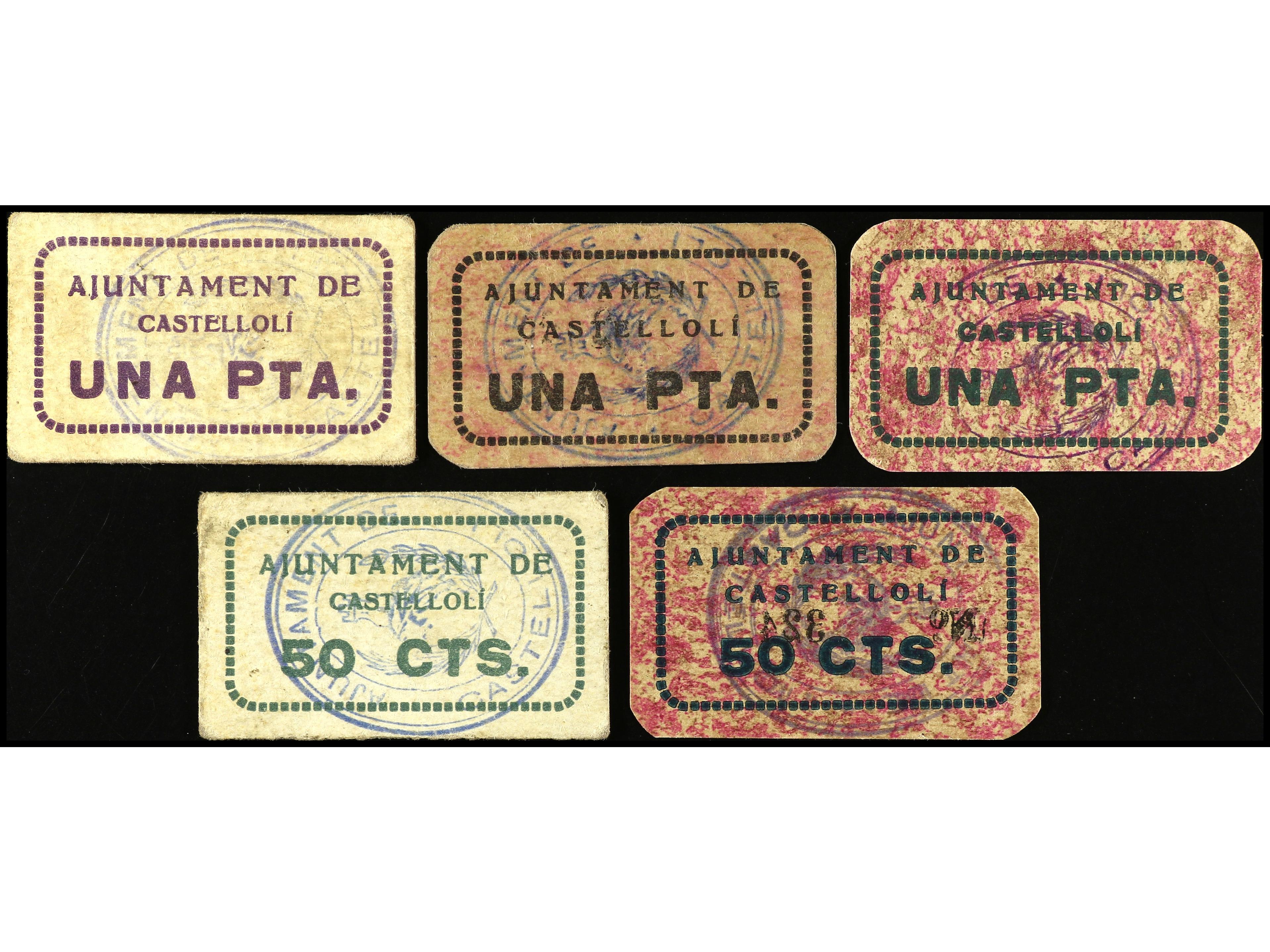 Lote 5 billetes 50 Cèntims (2) y 1 Pesseta (3). Aj. de CASTELLOLÍ. Cartón. AT-753/54, 755, 757/58. MBC+ a EBC+. (Image1)
