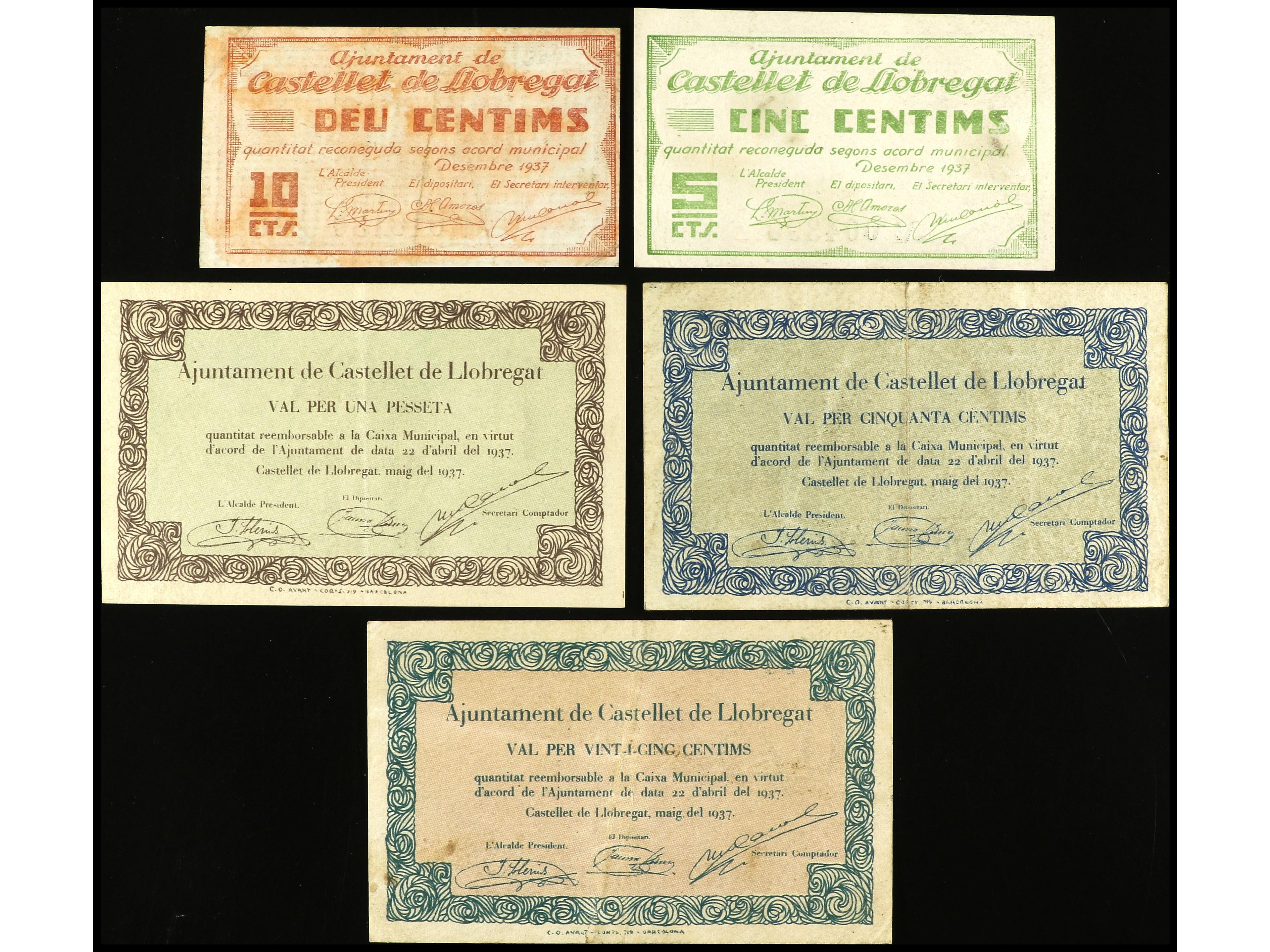 Lote 5 billetes 5, 10, 25, 50 Cèntims y 1 Pesseta. 1937. Aj. de CASTELLET DE LLOBREGAT. A EXAMINAR. MBC a MBC+. (Image1)