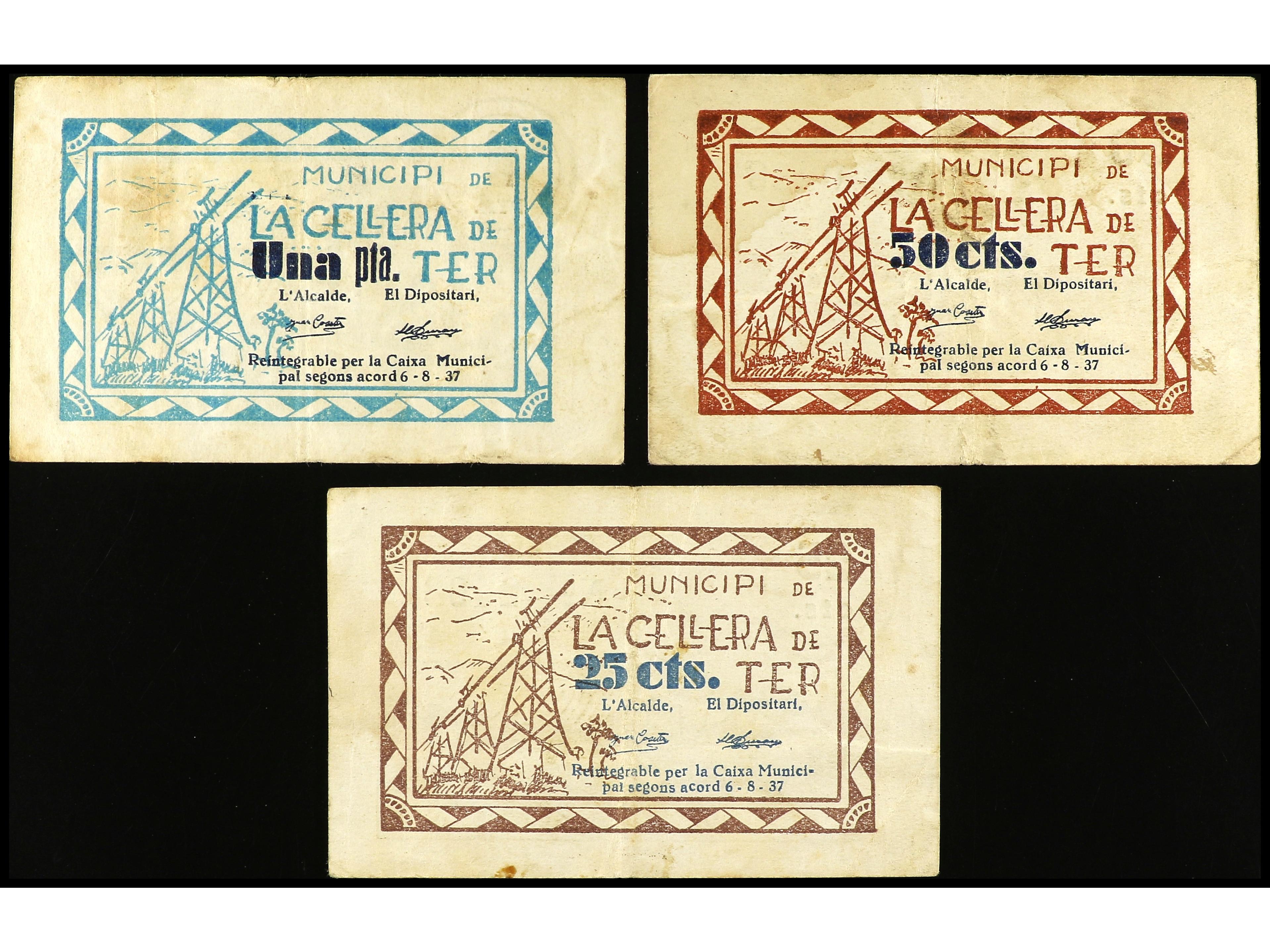 Lote 3 billetes 25, 50 Cèntims y 1 Pesseta. Municipi de LA CELLERA DEL TER. AT-797/99. MBC. (Image1) (Image2)