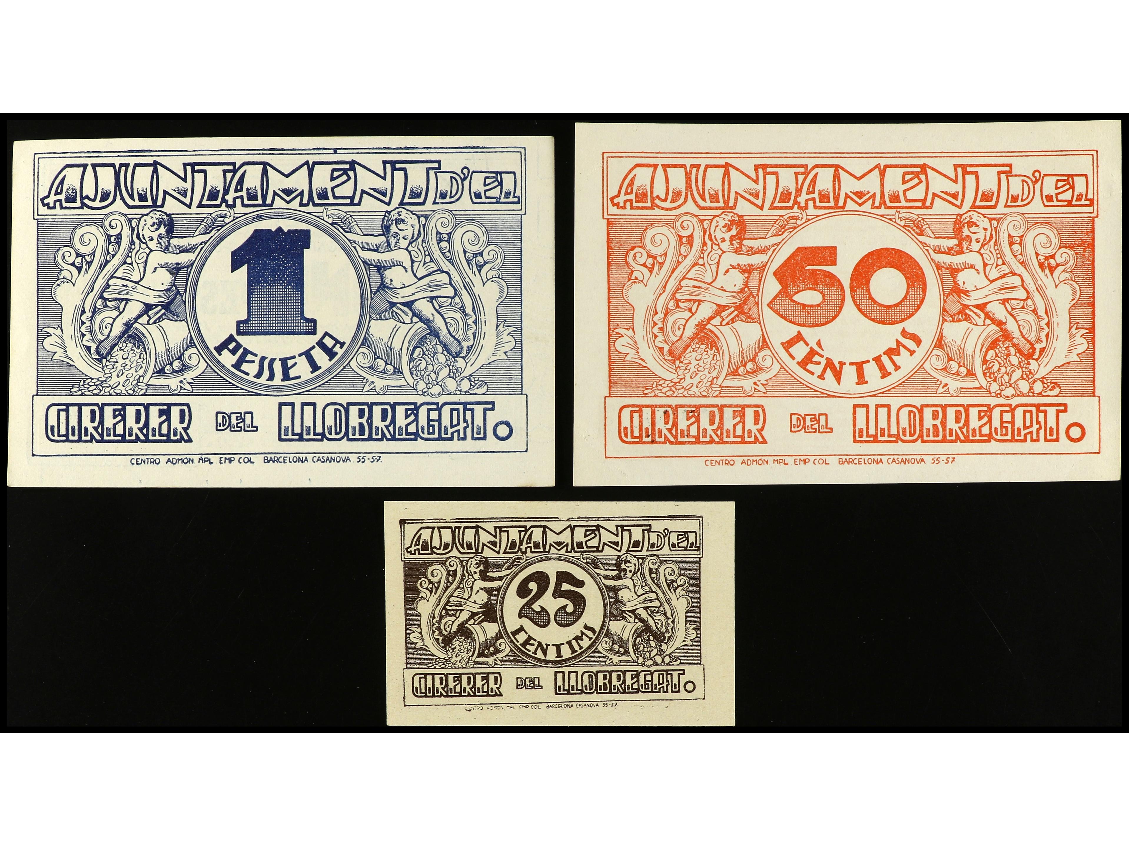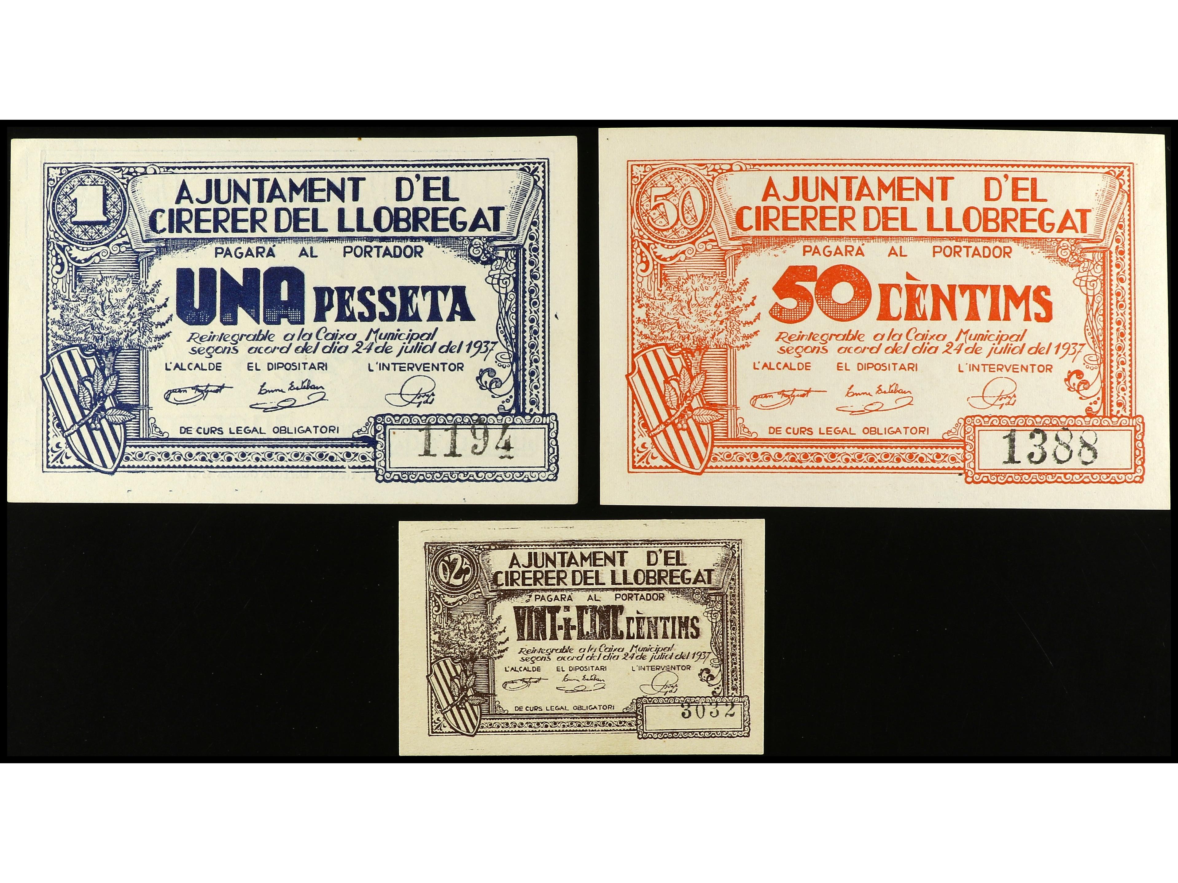 Lote 3 billetes 25 y 50 Cèntims y 1 Pesseta. 24 Juliol 1937. Aj. EL CIRERER DEL LLOBREGAT. AT-823/825. EBC- a EBC.
