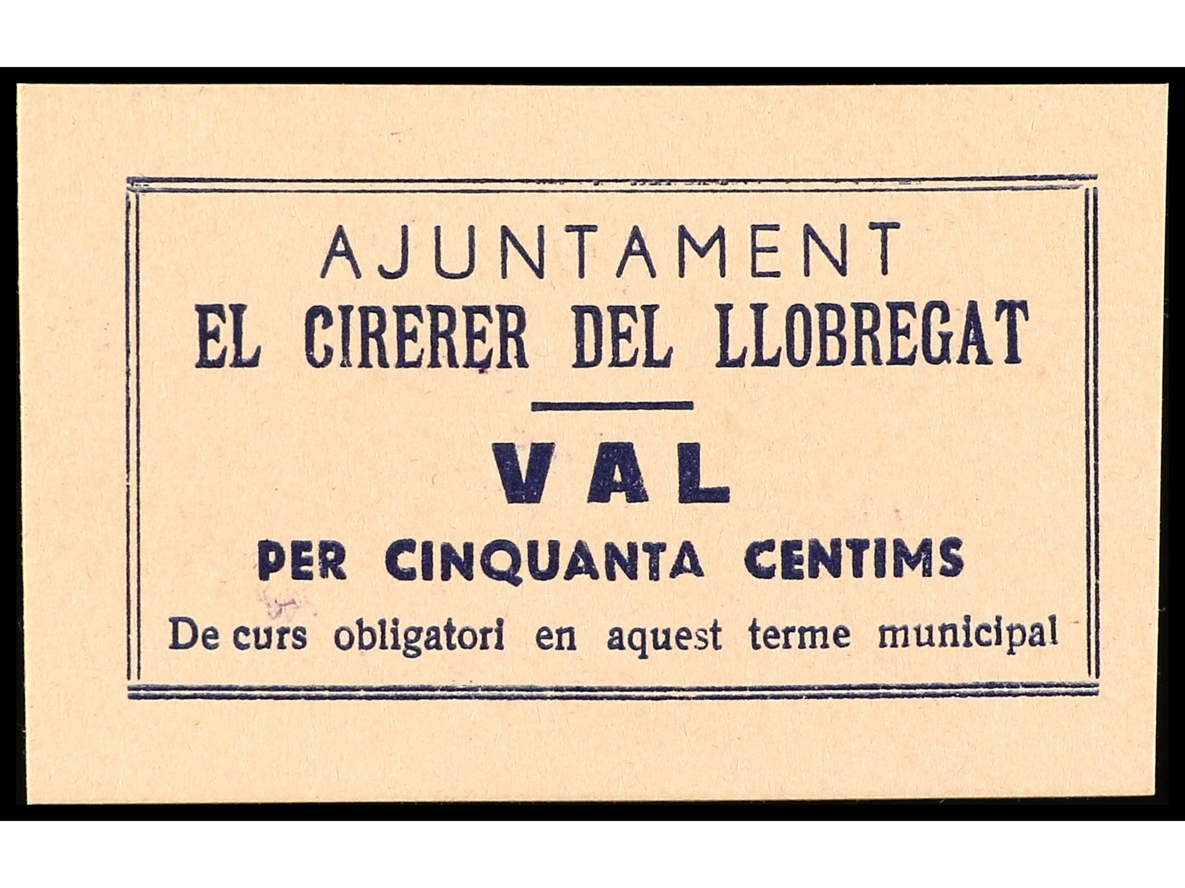 50 Cèntims. Aj. d´ EL CIRERER DEL LLOBREGAT. MUY RARO. AT-822a. SC-. (Image1) (Image2)