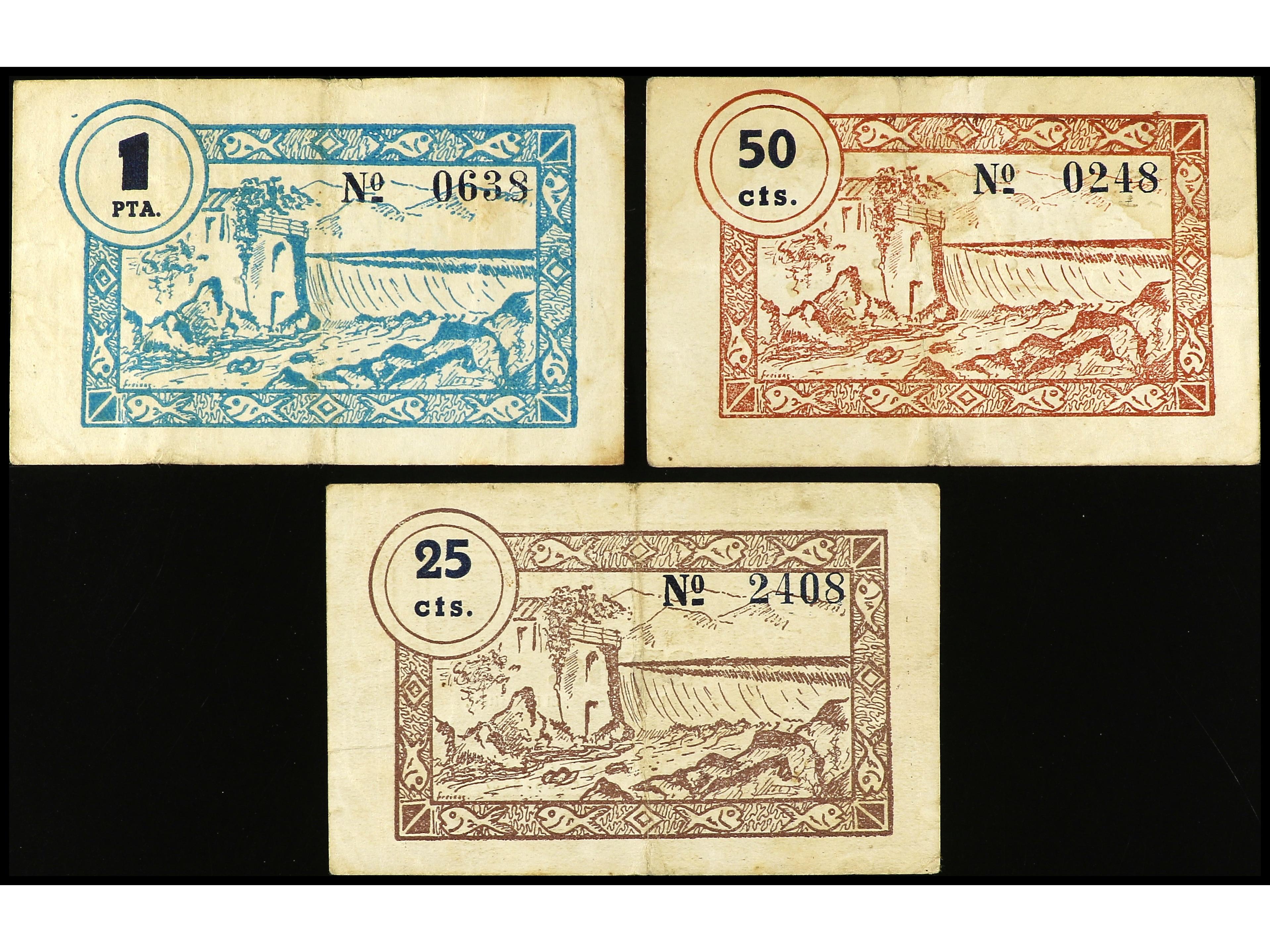 Lote 3 billetes 25, 50 Cèntims, 1 Pesseta. Aj. de CASTELLSERÀ. AT-764/66. MBC- a MBC. (Image1) (Image2)