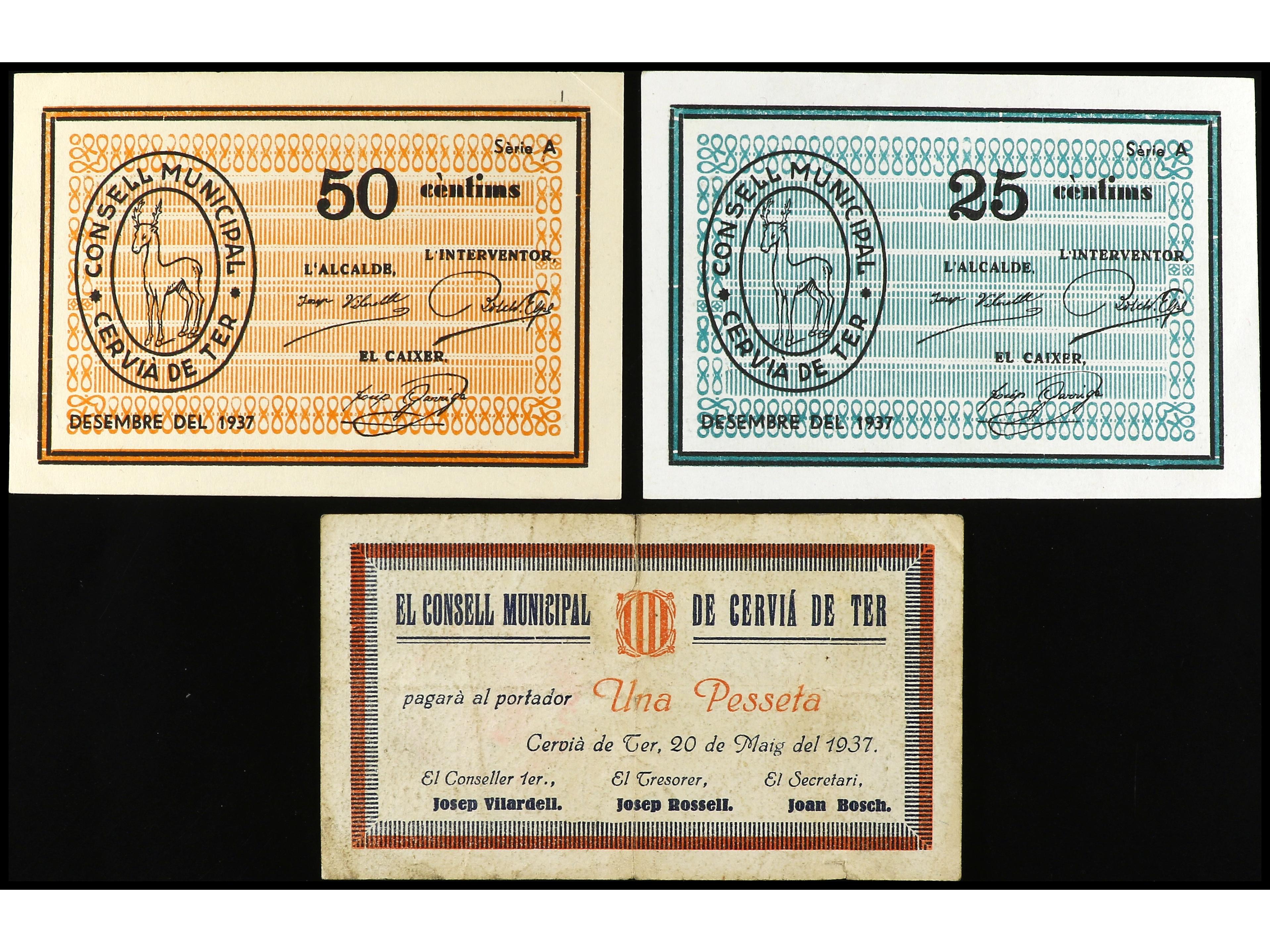 Lote 3 billetes 25, 50 Cèntims y 1 Pesseta. 20 Maig 1937 y Desembre 1937. C.M. de CERVIÀ DE TER. AT-818/820. MBC- a EBC.