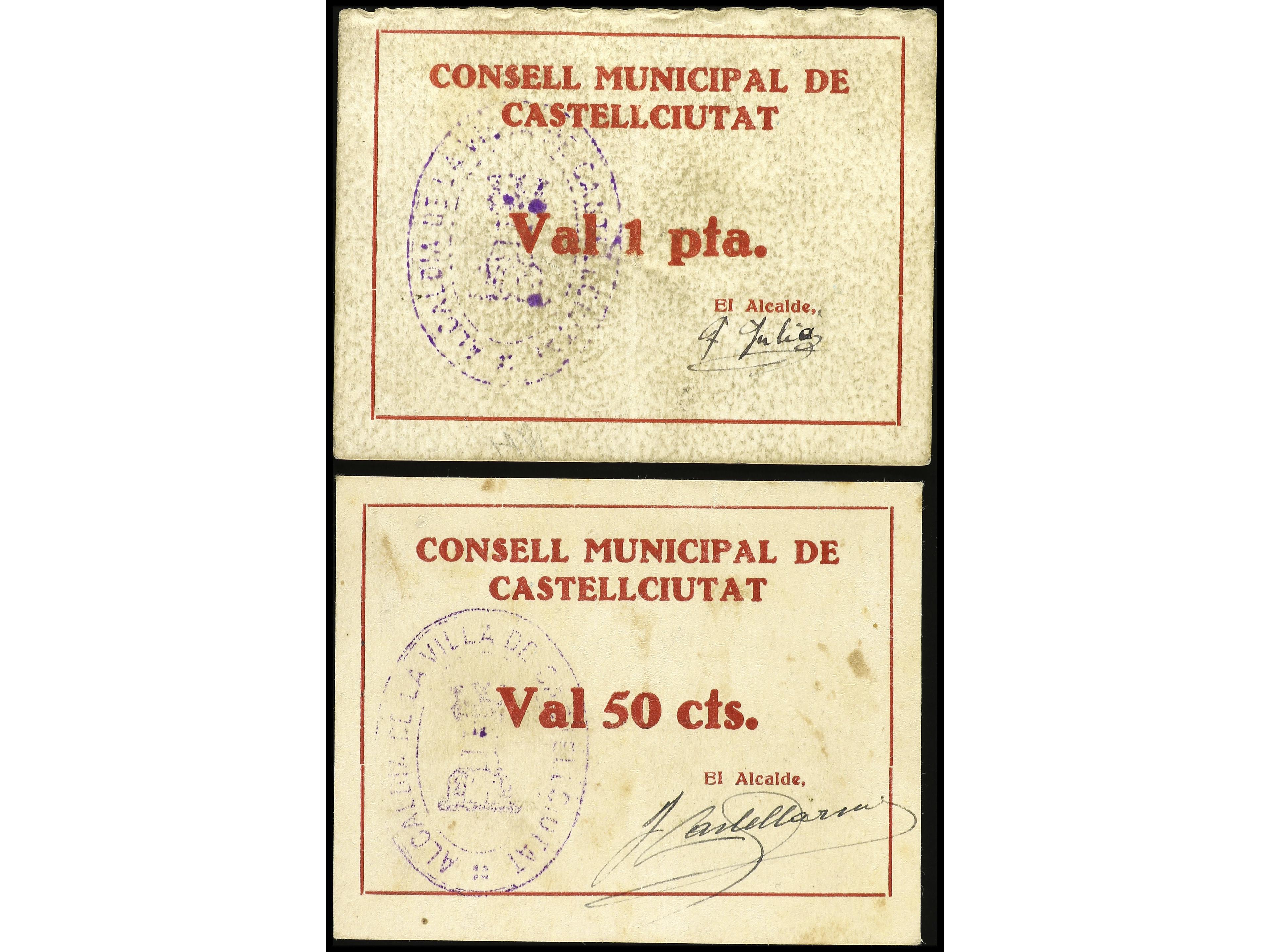 Lote 2 billetes 50 Cèntims y 1 Pesseta. C.M. de CASTELLCIUTAT. RAROS. AT-703, 704. MBC a MBC+. (Image1) (Image2)