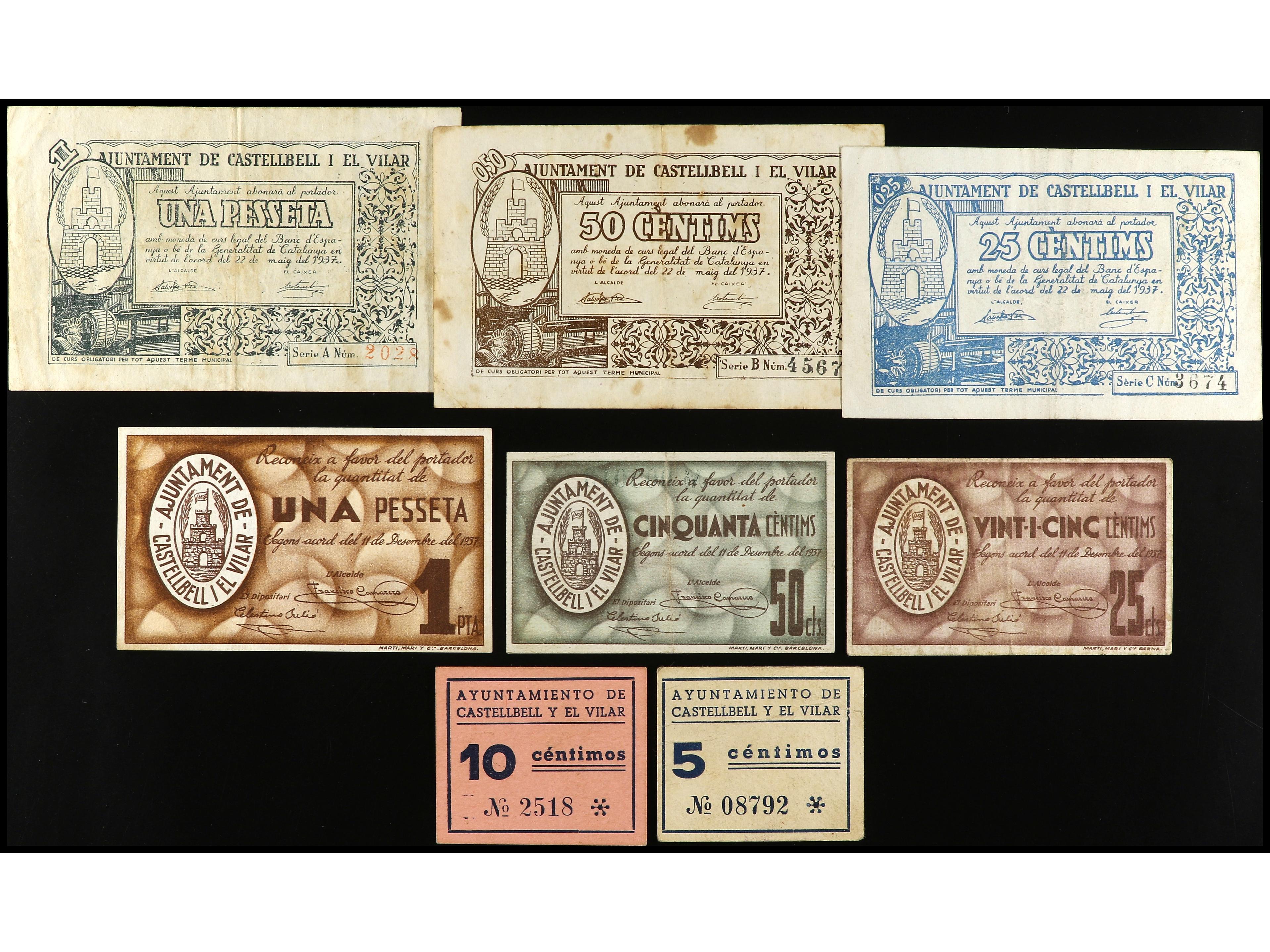 Lote 8 billetes 5 Cèntims a 1 Pesseta. Aj. de CASTELLBELL i EL VILAR. Todos diferentes. MBC- a EBC. (Image1)