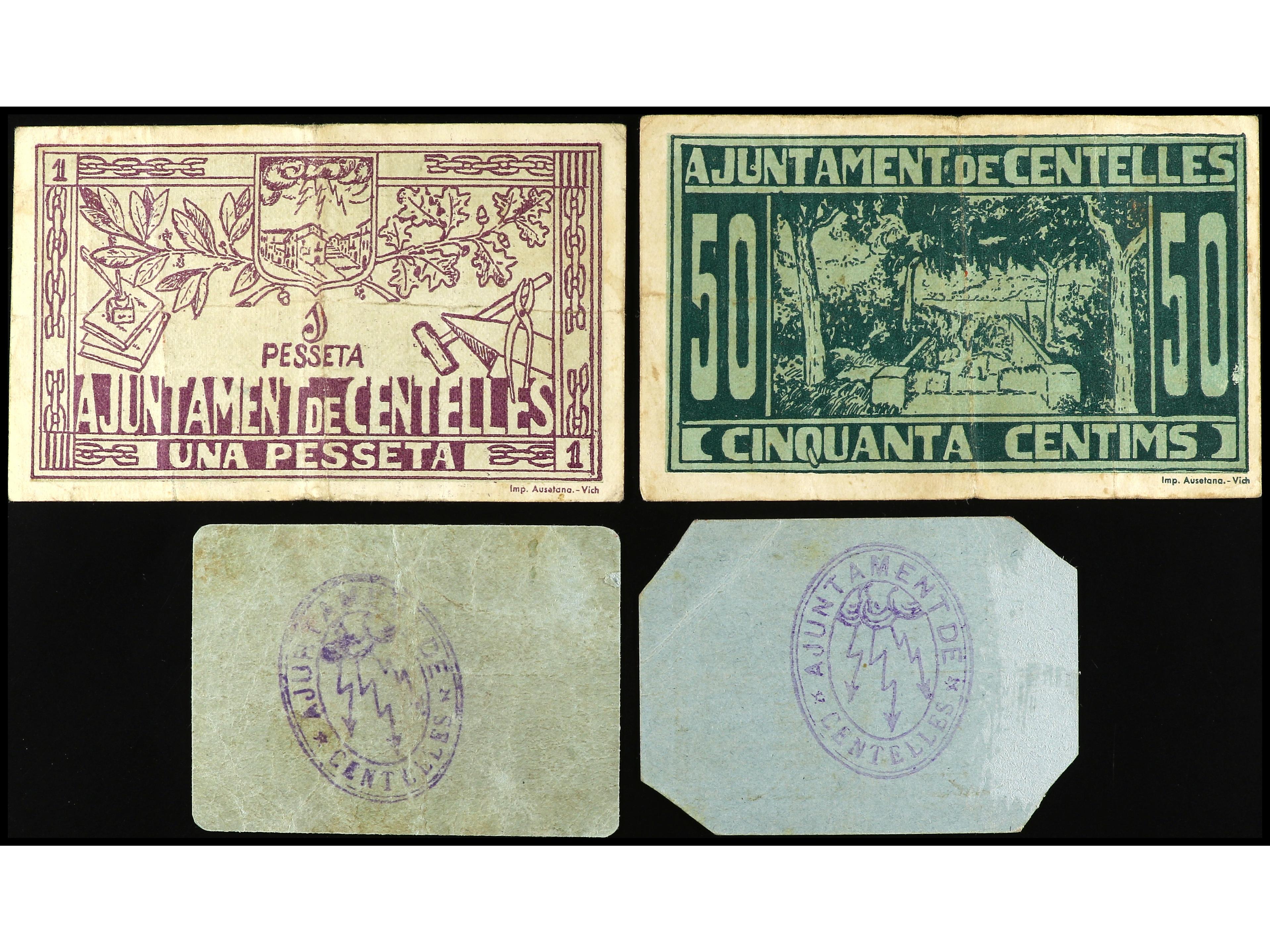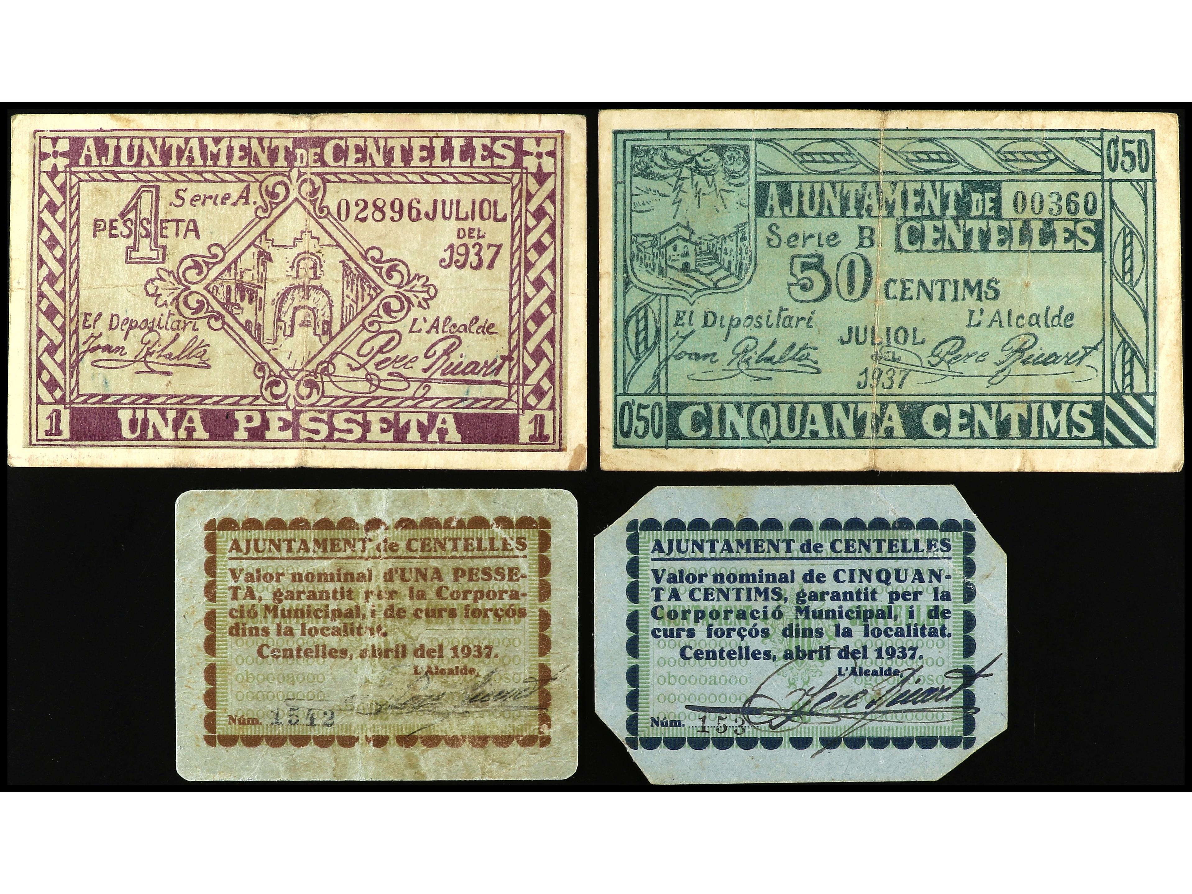 Lote 4 billetes 50 Cèntims y 1 Pesseta. Abril y Juliol 1937. Aj. de CENTELLES. AT-802/05. MBC a EBC-. (Image1) (Image2)